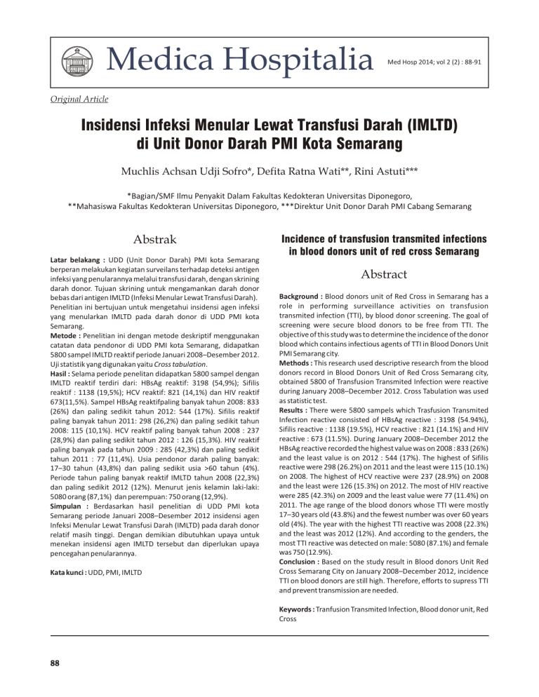 Medica Hospitalia Med Hosp 2014; vol 2 (2) : 88-91 Original Article Insidensi Infeksi Menular Lewat Transfusi Darah (IMLTD) di Unit Donor Darah PMI Kota Semarang Muchlis Achsan Udji Sofro*, Defita Ratna Wati**, Rini Astuti*** *Bagian/SMF Ilmu Penyakit Dalam Fakultas Kedokteran Universitas Diponegoro, **Mahasiswa Fakultas Kedokteran Universitas Diponegoro, ***Direktur Unit Donor Darah PMI Cabang Semarang Abstrak Latar belakang : UDD (Unit Donor Darah) PMI kota Semarang berperan melakukan kegiatan surveilans terhadap deteksi antigen infeksi yang penularannya melalui transfusi darah, dengan skrining darah donor. Tujuan skrining untuk mengamankan darah donor bebas dari antigen IMLTD (Infeksi Menular Lewat Transfusi Darah). Penelitian ini bertujuan untuk mengetahui insidensi agen infeksi yang menularkan IMLTD pada darah donor di UDD PMI kota Semarang. Metode : Penelitian ini dengan metode deskriptif menggunakan catatan data pendonor di UDD PMI kota Semarang, didapatkan 5800 sampel IMLTD reaktif periode Januari 2008–Desember 2012. Uji statistik yang digunakan yaitu Cross tabulation. Hasil : Selama periode penelitan didapatkan 5800 sampel dengan IMLTD reaktif terdiri dari: HBsAg reaktif: 3198 (54,9%); Sifilis reaktif : 1138 (19,5%); HCV reaktif: 821 (14,1%) dan HIV reaktif 673(11,5%). Sampel HBsAg reaktifpaling banyak tahun 2008: 833 (26%) dan paling sedikit tahun 2012: 544 (17%). Sifilis reaktif paling banyak tahun 2011: 298 (26,2%) dan paling sedikit tahun 2008: 115 (10,1%). HCV reaktif paling banyak tahun 2008 : 237 (28,9%) dan paling sedikit tahun 2012 : 126 (15,3%). HIV reaktif paling banyak pada tahun 2009 : 285 (42,3%) dan paling sedikit tahun 2011 : 77 (11,4%). Usia pendonor darah paling banyak: 17–30 tahun (43,8%) dan paling sedikit usia >60 tahun (4%). Periode tahun paling banyak reaktif IMLTD tahun 2008 (22,3%) dan paling sedikit 2012 (12%). Menurut jenis kelamin laki-laki: 5080 orang (87,1%) dan perempuan: 750 orang (12,9%). Simpulan : Berdasarkan hasil penelitian di UDD PMI kota Semarang periode Januari 2008–Desember 2012 insidensi agen Infeksi Menular Lewat Transfusi Darah (IMLTD) pada darah donor relatif masih tinggi. Dengan demikian dibutuhkan upaya untuk menekan insidensi agen IMLTD tersebut dan diperlukan upaya pencegahan penularannya. Kata kunci : UDD, PMI, IMLTD Incidence of transfusion transmited infections in blood donors unit of red cross Semarang Abstract Background : Blood donors unit of Red Cross in Semarang has a role in performing surveillance activities on transfusion transmited infection (TTI), by blood donor screening. The goal of screening were secure blood donors to be free from TTI. The objective of this study was to determine the incidence of the donor blood which contains infectious agents of TTI in Blood Donors Unit PMI Semarang city. Methods : This research used descriptive research from the blood donors record in Blood Donors Unit of Red Cross Semarang city, obtained 5800 of Transfusion Transmited Infection were reactive during January 2008–December 2012. Cross Tabulation was used as statistic test. Results : There were 5800 sampels which Trasfusion Transmited Infection reactive consisted of HBsAg reactive : 3198 (54.94%), Sifilis reactive : 1138 (19.5%), HCV reactive : 821 (14.1%) and HIV reactive : 673 (11.5%). During January 2008–December 2012 the HBsAg reactive recorded the highest value was on 2008 : 833 (26%) and the least value is on 2012 : 544 (17%). The highest of Sifilis reactive were 298 (26.2%) on 2011 and the least were 115 (10.1%) on 2008. The highest of HCV reactive were 237 (28.9%) on 2008 and the least were 126 (15.3%) on 2012. The most of HIV reactive were 285 (42.3%) on 2009 and the least value were 77 (11.4%) on 2011. The age range of the blood donors whose TTI were mostly 17–30 years old (43.8%) and the fewest number was over 60 years old (4%). The year with the highest TTI reactive was 2008 (22.3%) and the least was 2012 (12%). And according to the genders, the most TTI reactive was detected on male: 5080 (87.1%) and female was 750 (12.9%). Conclusion : Based on the study result in Blood donors Unit Red Cross Semarang City on January 2008–December 2012, incidence TTI on blood donors are still high. Therefore, efforts to supress TTI and prevent transmission are needed. Keywords : Tranfusion Transmited Infection, Blood donor unit, Red Cross 88 Insidensi Infeksi Menular Lewat Transfusi Darah (IMLTD) di Unit Donor Darah PMI Kota Semarang PENDAHULUAN UDD (Unit Donor Darah) PMI kota Semarang berperan melakukan kegiatan surveilans terhadap kasus-kasus infeksi yang penularannya melalui transfusi darah, dengan skrining darah donor. Tujuannya untuk mengamankan darah donor bebas dari IMLTD (Infeksi Menular Lewat Transfusi Darah). Transfusi darah berisiko menularkaninfeksi HIV/AIDS, Hepatitis C, Hepatitis B, Sifilis, Malaria, Demam Berdarah Dengue.1 Diperlukan pengetahuan agar tidak terjadi penularan infeksi melalui transfusi darah.2 Penelitian ini bertujuan untuk mengetahui insidensi agen infeksi menular lewat transfusi darah (IMLTD) pada darah donor di Unit Donor Darah PMI Kota Semarang. METODE Penelitian ini merupakan penelitian deskriptif. Pengumpulan data di UDD PMI Kota Semarang. Subjek penelitian adalah semua darah donor di UDD PMI kota Semarang periode Januari 2008–Desember 2012. Data didapatkan dari catatan data pendonor di UDD PMI Kota Semarang. Diambil yang reaktif: HIV: tes anti HIV; Sifilis: VDRL; Hepatitis B: HbsAg dan Hepatitis C: anti HCV. HASIL Jumlah darah donor periode Januari 2008–Desember 2012 adalah 259.763 dengan hasil skrining IMLTD reaktif: 5.830 (2%). Didapatkan HBsAg reaktif: 3198 (54,9%), Sifilis reaktif: 1138 (19.5%), HCV reaktif: 821 (14,1%) dan HIV reaktif: 673(11.5%). Sampel darah donor dengan HBsAg reaktif terbanyak tahun 2008: 833 (26%), Sifilis reaktif terbanyak tahun 2011: 298 (26,2%), HCV reaktif terbanyak tahun 2008: 237 (28,9%), dan HIV reaktif terbanyak tahun 2009: 285 (42,3%). Usia pendon