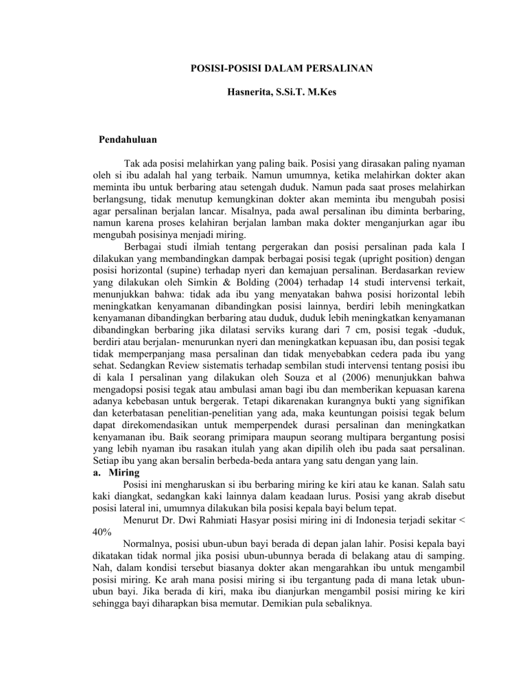 POSISI-POSISI DALAM PERSALINAN Hasnerita, S.Si.T. M.Kes Pendahuluan Tak ada posisi melahirkan yang paling baik. Posisi yang dirasakan paling nyaman oleh si ibu adalah hal yang terbaik. Namun umumnya, ketika melahirkan dokter akan meminta ibu untuk berbaring atau setengah duduk. Namun pada saat proses melahirkan berlangsung, tidak menutup kemungkinan dokter akan meminta ibu mengubah posisi agar persalinan berjalan lancar. Misalnya, pada awal persalinan ibu diminta berbaring, namun karena proses kelahiran berjalan lamban maka dokter menganjurkan agar ibu mengubah posisinya menjadi miring. Berbagai studi ilmiah tentang pergerakan dan posisi persalinan pada kala I dilakukan yang membandingkan dampak berbagai posisi tegak (upright position) dengan posisi horizontal (supine) terhadap nyeri dan kemajuan persalinan. Berdasarkan review yang dilakukan oleh Simkin & Bolding (2004) terhadap 14 studi intervensi terkait, menunjukkan bahwa: tidak ada ibu yang menyatakan bahwa posisi horizontal lebih meningkatkan kenyamanan dibandingkan posisi lainnya, berdiri lebih meningkatkan kenyamanan dibandingkan berbaring atau duduk, duduk lebih meningkatkan kenyamanan dibandingkan berbaring jika dilatasi serviks kurang dari 7 cm, posisi tegak -duduk, berdiri atau berjalan- menurunkan nyeri dan meningkatkan kepuasan ibu, dan posisi tegak tidak memperpanjang masa persalinan dan tidak menyebabkan cedera pada ibu yang sehat. Sedangkan Review sistematis terhadap sembilan studi intervensi tentang posisi ibu di kala I persalinan yang dilakukan oleh Souza et al (2006) menunjukkan bahwa mengadopsi posisi tegak atau ambulasi aman bagi ibu dan memberikan kepuasan karena adanya kebebasan untuk bergerak. Tetapi dikarenakan kurangnya bukti yang signifikan dan keterbatasan penelitian-penelitian yang ada, maka keuntungan poisisi tegak belum dapat direkomendasikan untuk memperpendek durasi persalinan dan meningkatkan kenyamanan ibu. Baik seorang primipara maupun seorang multipara bergantung posisi yang lebih nyaman ibu rasakan itulah yang akan dipilih oleh ibu pada saat persalinan. Setiap ibu yang akan bersalin berbeda-beda antara yang satu dengan yang lain. a. Miring Posisi ini mengharuskan si ibu berbaring miring ke kiri atau ke kanan. Salah satu kaki diangkat, sedangkan kaki lainnya dalam keadaan lurus. Posisi yang akrab disebut posisi lateral ini, umumnya dilakukan bila posisi kepala bayi belum tepat. Menurut Dr. Dwi Rahmiati Hasyar posisi miring ini di Indonesia terjadi sekitar < 40% Normalnya, posisi ubun-ubun bayi berada di depan jalan lahir. Posisi kepala bayi dikatakan tidak normal jika posisi ubun-ubunnya berada di belakang atau di samping. Nah, dalam kondisi tersebut biasanya dokter akan mengarahkan ibu untuk mengambil posisi miring. Ke arah mana posisi miring si ibu tergantung pada di mana letak ubunubun bayi. Jika berada di kiri, maka ibu dianjurkan mengambil posisi miring ke kiri sehingga bayi diharapkan bisa memutar. Demikian pula sebaliknya. Keunggulan posisi ini, peredaran darah balik ibu bisa mengalir lancar. Pengiriman oksigen dalam darah dari ibu ke janin melalui plasenta juga tidak terganggu. Alhasil karena tidak terlalu menekan, proses pembukaan akan berlangsung secara perlahan-lahan sehingga persalinan berlangsung lebih nyaman. Posisi melahirkan ini juga sangat cocok bagi ibu yang merasa pegal-pegal di punggung atau kelelahan karena mencoba posisi yang lain. Sayangnya, posisi miring menyulitkan dokter untuk membantu proses persalinan. Dalam arti, kepala bayi susah dimonitor, dipegang, maupun diarahkan. Dokter pun akan mengalami kesulitan saat melakukan tindakan episiotomi. b. Jongkok Posisi ini sudah dikenal sebagai posisi bersalin yang alami. Beberapa suku di Papua dan daerah lain memiliki kebiasaan melakukan persalinan dengan cara berjongkok seperti ini. Oleh karena memanfaatkan gravitasi tubuh, ibu tidak usah terlalu kuat mengejan. Sementara bayi pun lebih cepat keluar lewat jalan lahir. Tak heran karena berbagai keunggulan tersebut, beberapa RS/RSB di Jakarta menerapkan posisi persalinan ini untuk membantu pasiennya. Di indonesia < 10% posisi miring ini terjadi menurut Dr. Dwi Rahmiati Hasyar. Sedangkan kelemahannya, melahirkan dengan posisi jongkok amat berpeluang membuat kepala bayi cedera. Soalnya, tubuh bayi yang berada di jalan lahir bisa meluncur sedemikian cepat. Untuk menghindari cedera, biasanya ibu berjongkok di atas bantalan empuk yang berguna menahan kepala dan tubuh bayi. Bagi para dokter, posisi ini dinilai kurang menguntungkan karena menyulitkan pemantauan perkembangan pembukaan dan tindakan-tindakan persalinan lainnya, semisal episiotomi. c. Setengah Duduk Diakui atau tidak, posisi ini merupakan posisi yang paling umum diterapkan di berbagai RS/RSB di segenap penjuru tanah air. Pada posisi ini, pasien duduk dengan punggung bersandar bantal, kaki ditekuk dan paha dibuka ke arah samping. Posisi ini cukup membuat ibu nyaman. Kelebihannya, sumbu jalan lahir yang perlu ditempuh janin untuk bisa keluar jadi lebih pendek. Suplai oksigen dari ibu ke janin pun berlangsung optimal. Dari hasil penelitian menurut Dr. Dwi Rahmiati Hasyar terdapat >50% kejadian pada posisi setengah duduk Kendati begitu, posisi persalinan ini bisa memunculkan kelelahan dan keluhan punggung pegal. Apalagi jika proses persalinan tersebut berlangsung lama. 1. KELEBIHAN DAN KEKURANGAN POSISI-POSISI PERSALINAN a. POSISI BERBARING atau LITOTOMI Ibu terlentang di tempat tidur bersalin dengan menggantung kedua pahanya pada penopang kursi khusus untuk bersalin. Kelebihan: Dokter bisa lebih leluasa membantu proses persalinan. Jalan lahir pun menghadap ke depan, sehingga dokter dapat lebih mudah mengukur perkembangan pembukaan dan waktu persalinan pun bisa diprediksi secara lebih akurat. Kepala bayi lebih mudah dipegang dan diarahkan. Sehingga apabila terjadi perubahan posisi kepala bayi, maka dokter langsung bisa mengarahkan pada posisi yang seharusnya. Kelemahan: Posisi berbaring membuat ibu sulit untuk mengejan. Hal ini karen