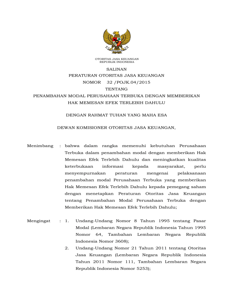 OTORITAS JASA KEUANGAN REPUBLIK INDONESIA SALINAN PERATURAN OTORITAS JASA KEUANGAN NOMOR 32 /POJK.04/2015 TENTANG SALINAN PENAMBAHAN MODAL PERUSAHAAN TERBUKA DENGAN MEMBERIKAN REPUBLIK INDONESIA HAK MEMESAN EFEK TERLEBIH DAHULU SALINAN DENGAN RAHMAT TUHAN YANG MAHA ESA DEWAN KOMISIONER OTORITAS JASA KEUANGAN, Menimbang : bahwa dalam rangka memenuhi kebutuhan Perusahaan Terbuka dalam penambahan modal dengan memberikan Hak Memesan Efek Terlebih Dahulu dan meningkatkan kualitas keterbukaan informasi menyempurnakan kepada peraturan masyarakat, mengenai perlu pelaksanaan penambahan modal Perusahaan Terbuka yang memberikan Hak Memesan Efek Terlebih Dahulu kepada pemegang saham dengan menetapkan Peraturan Otoritas Jasa Keuangan tentang Penambahan Modal Perusahaan Terbuka dengan Memberikan Hak Memesan Efek Terlebih Dahulu; Mengingat : 1. Undang-Undang Nomor 8 Tahun 1995 tentang Pasar Modal (Lembaran Negara Republik Indonesia Tahun 1995 Nomor 64, Tambahan Lembaran Negara Republik Indonesia Nomor 3608); 2. Undang-Undang Nomor 21 Tahun 2011 tentang Otoritas Jasa Keuangan (Lembaran Negara Republik Indonesia Tahun 2011 Nomor 111, Tambahan Lembaran Negara Republik Indonesia Nomor 5253); -2- MEMUTUSKAN: Menetapkan : PERATURAN OTORITAS JASA KEUANGAN TENTANG PENAMBAHAN MODAL PERUSAHAAN TERBUKA DENGAN MEMBERIKAN HAK MEMESAN EFEK TERLEBIH DAHULU. BAB I KETENTUAN UMUM Pasal 1 Dalam Peraturan Otoritas Jasa Keuangan ini yang dimaksud dengan: 1. Hak Memesan Efek Terlebih Dahulu yang selanjutnya disingkat HMETD adalah hak yang melekat pada saham yang memberikan kesempatan pemegang saham yang bersangkutan untuk membeli saham dan/atau Efek Bersifat Ekuitas lainnya baik yang dapat dikonversikan menjadi saham atau yang memberikan hak untuk membeli saham, sebelum ditawarkan kepada Pihak lain. 2. Perusahaan Terbuka adalah Emiten yang telah melakukan Penawaran Umum Efek Bersifat Ekuitas atau Perusahaan Publik. 3. Pembeli Siaga adalah Pihak yang akan membeli baik sebagian maupun seluruh sisa saham dan/atau Efek Bersifat Ekuitas lainnya yang tidak diambil oleh pemegang HMETD. 4. Waran adalah Efek yang diterbitkan oleh suatu perusahaan yang memberi hak kepada pemegang Efek untuk memesan saham dari perusahaan tersebut pada harga tertentu setelah 6 (enam) bulan sejak Efek dimaksud diterbitkan. 5. Rapat Umum Pemegang Saham yang selanjutnya disingkat RUPS adalah organ Perusahaan Terbuka yang mempunyai wewenang yang tidak diberikan kepada Direksi atau Dewan Komisaris sebagaimana dimaksud dalam Undang-Undang tentang Perseroan dan/atau anggaran dasar Perusahaan Terbuka. Terbatas -3- Pasal 2 Jika Perusahaan Terbuka bermaksud melakukan penambahan modal melalui penerbitan saham dan/atau Efek Bersifat Ekuitas lainnya baik yang dapat dikonversi menjadi saham atau yang memberikan hak untuk membeli saham, Perusahaan Terbuka tersebut wajib memberikan HMETD kepada setiap pemegang saham sesuai dengan rasio tertentu terhadap persentase kepemilikan sahamnya. Pasal 3 Kewajiban memberikan HMETD dalam penerbitan saham dan/atau Efek Bersifat Ekuitas lainnya sebagaimana dimaksud dalam Pasal 2 tidak berlaku jika Perusahaan Terbuka mengeluarkan saham berupa: a. Saham Bonus yang merupakan Dividen Saham sebagai hasil dari Saldo Laba yang dikapitalisasi menjadi modal; dan/atau b. Saham Bonus yang bukan merupakan Dividen Saham sebagai hasil dari agio saham atau unsur ekuitas lainnya yang dikapitalisasi menjadi modal. Pasal 4 HMETD merupakan hak yang dapat dialihkan dan dibuktikan dengan: a. catatan pemilikan dalam daftar pemegang saham Perusahaan Terbuka atau Biro Administrasi Efek; b. sertifikat HMETD yang dikeluarkan oleh Perusahaan Terbuka untuk pemegang saham yang terdaftar pada tanggal tertentu; c. kupon HMETD yang dapat dilepas dari surat saham; atau d. konfirmasi atau laporan rekening Efek yang diterbitkan oleh Kustodian. -4- Pasal 5 (1) Penambahan modal dengan memberikan HMETD yang dilakukan oleh Perusahaan Terbuka yang mempunyai lebih dari 1 (satu) klasifikasi saham dilakukan dengan ketentuan: a. jika penerbitan saham dilakukan dalam setiap klasifikasi saham secara proporsional, pemegang saham wajib diberi HMETD sesuai dengan rasio tertentu terhadap persentase kepemilikan sahamnya dalam masing-masing klasifikasi saham; atau b. jika penerbitan saham: 1. dilakukan hanya pada 1 pada semua (satu) klasifikasi saham; 2. dilakukan klasifikasi saham namun tidak proporsional; atau 3. dilakukan melalui Penawaran Umum atas Efek Bersifat Ekuitas dikonversi lainnya menjadi baik saham yang dapat atau yang memberikan hak untuk membeli saham, pemegang saham wajib diberi HMETD sesuai dengan persentase pemilikan sahamnya dalam Perusahaan Terbuka. (2) Penambahan Modal sebagaimana dimaksud pada ayat (1) wajib disetujui oleh pemegang saham yang mewakili sebagian besar saham dalam setiap klasifikasi saham. Pasal 6 Dalam hal penambahan modal disertai dengan penerbitan Waran, jumlah Waran yang akan diterbitkan dan Waran yang telah beredar tidak boleh melebihi 35% (tiga puluh lima persen) dari jumlah saham yang telah ditempatkan dan disetor penuh pada saat Pernyataan Pendaftaran disampaikan kepada Otoritas Jasa Keuangan. -5- Pasal 7 Perusahaan Terbuka dilarang melakukan penyesuaian jumlah Waran sebagaimana dimaksud dalam Pasal 6 kecuali dalam hal terjadi pemecahan saham atau penggabungan saham. BAB II PERSYARATAN PENAMBAHAN MODAL Pasal 8 (1) Dalam melakukan memberikan penambahan HMETD, modal Perusahaan dengan Terbuka wajib memenuhi ketentuan sebagai berikut: a. telah memperoleh persetujuan RUPS; b. telah menyampaikan Pernyataan Pendaftaran dan dokumen pendukungnya kepada Otoritas Jasa Keuangan; dan c. Pernyataan Pendaftaran sebagaimana dimaksud pada huruf b sudah menjadi efektif. (2) Penyelenggaraan RUPS sebagaimana dimaksud pada ayat (1) huruf a wajib dilakukan sesuai dengan ketentuan sebagaimana diatur dalam Peraturan Otoritas Jasa Keuangan tentang Rencana dan Penyelenggaraan Rapat Umum Pemegang Saham Perusahaan Terbuka dan anggaran dasar Perusahaan Terbuka. (3) J