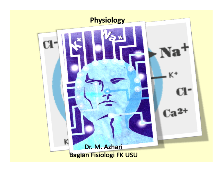 Physiology From cell to systems Referensi : 1. Ganong, W.F , Fisiologi kedokteran, Ed 17, 1998. 2. Guyton, A.C , Fisiologi manusia, Edisi revisi, 1990. 3. Mackenna, B.R, Illustrated physiology, Sixth edition, 1997. 4. Carola, R, Human anatomy & Physiology. Body system Physiology Physiology is the study of the functions of the body, or how the body works Level of organization in the body Chemical level : various atoms and molecules make up the body -Cellular level -Tissue level -Organ level -Body system level -Organis level Misal : Proses pada muskuloskeletal,pencernaan, sistem pernapasan, sistem kardiovaskular, sistem endokrin. Sistem yang mempunyai fungsi kusus: sistem saraf. sistem endokrin. Yang paling penting adalah sistem kardiovaskular. Dalam keadaan normal, semua sistem dalam tubuh manusia ikut terlibat, hanya saja kuantitasnya berbeda – beda. Sistem yang bekerja dalam keadaan apapun: - Sistem kardiovaskular. - Sistem pernapasan. - Sistem persarafan. - Sistem endokrin. Semua sel berada didalam lingkungan ( cairan ) extra cellulair. intra cellulair. Cairan : harus senantiasa tersedia dalam jumlah, konsentrasi, komposisi, suhu , P H yang konstan agar dapat berfungsi normal. Agar konstan dipertahankan oleh kerja sistim tubuh ( self regulation ) HOMEOSTASIS Body systems maintain homeostasis, adynamic steady state in the internal environment (Sherwood. L) keadaan yang konstan dari cairan ekstra selular yang dipertahankan oleh proses Fisiologis yang kompleks dan terpadu, agar sel dapat berfungsi dengan optimal . (Cannon W.B.) Skematik homeostasis Misal : apabila suhu cairan interstisial tidak konstan / tinggi, maka sistem didalam tubuh akan berusaha menormalkannya kekeadaan semula. seperti : pembuangan panas melalui urine dan keringat. Kalau hal ini tidak bisa dilakukan tubuh, maka tubuh dikatakan dalam keadaan sakit ( pathofisiologi ). Jika semuanya dalam keadaan normal, maka tubuh dikatakan berada dalam keadaan sehat ( fisiologis ). MEMBRAN S E L Disekitar membran sel dan didalam membran sel terdapat suatu perbedaan muatan (potensial), hal ini terjadi pada semua sel – sel. Catatan : potensial didalam sel lebih ( - ) dari pada diluar sel nilainya antara - 90 mV. Pada sel saraf -70 mv. Hal ini disebabkan : - sifat khas dari membran itu sendiri. - distribusi elektrolit / ion didalam dan diluar sel. Didalam sel lebih banyak ion K+. Diluar sel lebih banyak ion Natrium dan Chlor. Gbr. Sel Transpor aktif Natrium dan kalium dan pompa Natrium Kalium Dalam keadaan istirahat (normal) konsentrasi natrium diluar sel lebih besar dari pada didalam sel begitu pula dengan kalium lebih banyak didalam sel dari pada diluar sel jadi muatan diluar sel lebih (+) dari pada didalam sel. Sifat natrium cenderung berdifusi kedalam sel dan kalium keluar sel, kalau ini berlangsung lama maka sel akan bengkak. Dengan bantuan enzim ATPase, pompa natrium kalium aktif maka natrium dipompa kembali keluar sel dan kalium kedalam sel homeostasis. Transpor aktif dan pompa NaK Extra cell membran Intra cell Permeabilitas membran sel dan depolarisasi membran dan potensial membran Suatu stimulus pembukaan saluran ion Na diluar membran influx kedalam sel muatan didalam sel lebih positif dari diluar Akibatnya membran tidak permeabel lagi bagi ion Na, sebaliknya lebih permeabel terhadap K depolarisasi membran. Perbedaan muatan yang tiba-tiba ini disebut dengan potensialaksi membran. Potensial membran ini merambat keseluruh sel. Perbedaan muatan ini berlangsung singkat sekali (mSec) membran tidak permeabel lagi bagi Na perpindahan ion K kembali kedalam sel muatan diluar kembali (+) dari pada didalam sel repolarisasi. Keadaan ini berlaku juga bagi semua sel, kususnya sel saraf dan otot. . JARINGAN PEKA RANGSANG SEL SARAF DAN OTOT Persamaan sel otot dan syaraf : 1. mempunyai perbedaan potensial. 2. dapat dirangsang ( exitability ) sehingga terjadi perubahan potensial membran. 3. dapat menghantar rangsang keseluruh bagian sel (conductivity) Perbedaan sel otot dan syaraf : 1. sel otot akan berubah secara fisik ( kontraksi ). 2. sel syaraf respon ( aksi potensial ) akan melepaskan (release) neurotransmitter. SEL SYARAF ( NEURON ) Neuron Jaringan peka rangsang. Neuron terdiri dari : 100 miliar neuron. fungsi : integrasi dan penghantaran impuls syaraf. bentuk : badan dan inti sel. dendrit (Gr) dendron tree branche. segmen awal = axon Hillock. axon myelin (nodus of Ranvier). tidak bermyelin. cabang terminal. tombol terminal ( terminaux bouton ) terdapat granula tempat menyimpan zat transmitter sinaps yang akan disekresikan, hal ini bisa kita lihat pada gambar berikut. Secara Fisiologis - zona dendritik / reseptor tempat beberapa perubahan lokal diintegrasikan. - segmen awal ( motoric spinal nerve ) - nodus of Ranvier ( cencoryc nerve ) tempat beberapa perubahan lokal diintegrasikan - axon menghantarkan impuls ke ujung syaraf. - ujung syaraf ( terminal button ) tempat potensial aksi menye babkan pelepasan zat neuro transmitter. Neuron termasuk sel sekresi zona sekresi jauh dari soma ( body ). Sintesa zat sekresi ( protein ) retikulum endoplasma dan golgiaparatus di soma aliran eksoplasma tombol sinaps( terminal button ). Animasi Penjalaran impuls ( potensial aksi ) pada neuron SEL BERKOMUNIKASI SYNAPS Hubungan satu neuron dengan neuron berikutnya untuk mengatur penghantaran isarat melalui zat neurotransmitter. hubungan antra satu neuron dengan neuron lain, spt: - synaptic junction. - gap junction. - paracrine / autocrine. - endocrine. hubungan neuron dengan otot (neuromuscular junction) Hubungan yang lain presinaptic soma body dengan axon. postsinaptic soma body dengan dendrit Gbr, Synaps ( neuromuscular junction ) Axon terminale Sifat dan fungsi membran peka rangsang Potensial membran dapat berubah secara cepat oleh karena rangsang. Membran sel lapisan tipis dari lemak, terikat dengan protein yang menjelaskan batas masing – masing sel. Fungsi :1. menjaga lingkungan kimia yang tepat untuk proses metabolisme. 2. media transfer informas