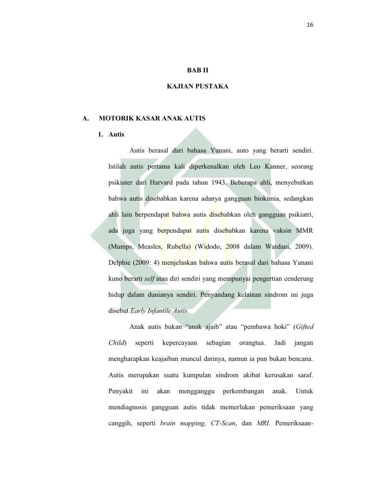16 BAB II KAJIAN PUSTAKA A. MOTORIK KASAR ANAK AUTIS 1. Autis Autis berasal dari bahasa Yunani, auto yang berarti sendiri. Istilah autis pertama kali diperkenalkan oleh Leo Kanner, seorang psikiater dari Harvard pada tahun 1943. Beberapa ahli, menyebutkan bahwa autis disebabkan karena adanya gangguan biokimia, sedangkan ahli lain berpendapat bahwa autis disebabkan oleh gangguan psikiatri, ada juga yang berpendapat autis disebabkan karena vaksin MMR (Mumps, Measles, Rubella) (Widodo, 2008 dalam Wardani, 2009). Delphie (2009: 4) menjelaskan bahwa autis berasal dari bahasa Yunani kuno berarti self atau diri sendiri yang mempunyai pengertian cenderung hidup dalam dunianya sendiri. Penyandang kelainan sindrom ini juga disebut Early Infantile Autis. $QDN DXWLV EXNDQ ³DQDN DMDLE´ DWDX ³SHPEDZD KRNL´ Gifted Child) seperti kepercayaan sebagian orangtua. Jadi jangan mengharapkan keajaiban muncul darinya, namun ia pun bukan bencana. Autis merupakan suatu kumpulan sindrom akibat kerusakan saraf. Penyakit ini akan mengganggu perkembangan anak. Untuk mendiagnosis gangguan autis tidak memerlukan pemeriksaan yang canggih, seperti brain mapping, CT-Scan, dan MRI. Pemeriksaan- 17 pemeriksaan itu hanya dilakukan jika ada indikasi tambahan misalnya jika anak sering kejang, baru dilakukan brain mapping atau EEG untuk melihat apakah mengidap epilepsi (Widyawati, 2003: 2). Autis (autisme) memiliki cara berpikir yang dikendalikan oleh kebutuhan dirinya sendiri. Penyandang autis ini akan menanggapi dunia berdasarkan penglihatan, harapan sendiri, dan menolak realitas. Autis juga tenggelam dalam keasikan yang ekstrim dengan pikiran fantasi mereka. Anak-anak yang menyandang status autis sering juga disebut autistic child yaitu memiliki kecenderungan diam dan suka menyendiri. Ketika hal ini terjadi, mereka bisa duduk dan bermain selama berjamjam lamanya dengan jari-jarinya atau dengan serpihan-serpihan kertas. Maka dari sini tampak jelas bahwasanya mereka tenggelam dalam fantasi yang dimiliki (Chaplin, 2006: 46). Menurut Winarno (2013: 1) autis pada masa kanak-kanak adalah gangguan perkembangan yang biasanya tampak jelas sebelum anak mencapai usia 3 tahun. Tampak secara nyata anak-anak autis mempunyai kesulitan untuk belajar berkomunikasi secara verbal dan non verbal. Sehingga penyandang autistik usia dini dapat di deteksi melalui suatu diagnosis khusus oleh medis atau psikolog sejak usia 30 bulan (APA, 1980 dalam Delphie, 2009: 5). Menurut Wing (1996 dalam Thompson, 2010: 86 ± 87) autis mengalami gangguan perkembangan di antaranya gangguan komunikasi sosial, gangguan interaksi sosial, dan gangguan imajinasi sosial. Sehingga mereka memerlukan perhatian yang 18 lebih agar tidak mengabaikan semua hal yang berhubungan dengan dunia luar. Hadis (2006 dalam Ulmi, 2013) berpendapat bahwa autis adalah salah satu anak berkebutuhan khusus yang memerlukan pendidikan dan layanan khusus untuk mengembangkan potensi kemanusian mereka secara sempurna. Menurut Safaria (2005, dalam Mufadhilah, 2014) mendefinisikan autis sebagai suatu gangguan perkembangan perpasif yang secara menyeluruh mengganggu fungsi kognitif, emosi, dan psikomotorik anak. Pendapat Rarick, 1973 (dalam Saputra Y, 2005: 40 dalam Assjari, 2011) menyatakan bahwa anak yang di identifikasi sebagai autis, kemampuan geraknya kurang dibanding dengan anak normal sebayanya. Hal ini diukur dari kemampuan gerak statis dan dinamis, kekuatan, koordinasi, keseimbangan dan kelincahan. Senada dengan Veskarisyanti, A. (2008: 47 dalam Assjari, 2011) menyatakan bahwa beberapa anak penyandang autis mengalami gangguan pada perkembangan motorik, otot kurang kuat untuk berjalan, serta keseimbangan tubuhnya kurang baik. Sherill, 1984; Astati, (2001 dalam Assjari, 2011) menjelaskan bahwa anak autis umumnya memiliki kemampuan motorik yang lebih rendah dibandingkan dengan kelompok anak sebayanya, baik secara kualitatif maupun kuantitatif. Adapun pendapat bahwasanya sekitar 40 persen anak autis memiliki beberapa ketidaknormalan kepekaan inderawi (Rimland, 1990 19 Assjari, 2011). Maka perkembangan mental yang tertinggal akan membawa dampak pada kemampuan motorik anak autis yang disebabkan adanya gangguan pada sistem saraf pusat. Hal ini ditunjukkan dengan kurang mampu dalam aktifitas motorik untuk tugastugas yang memerlukan kecepatan gerakan serta dalam melakukan reaksi gerak yang memerlukan koordinasi motorik dan keterampilan gerak yang lebih kompleks, misalnya keterampilan bola, keseimbangan, deksteritas manual, gerakan cepat dan menulis dengan tangan. 2. Perkembangan Motorik Setiap makhluk hidup pasti mengalami perkembangan dalam hidup mereka sejak dalam kandungan, terlahir ke dunia, hingga masa tua dan mati. Begitu kompleks sistem perkembangan yang dialami oleh seseorang dalam menjalani hidup di dunia ini. Yusuf (2005: 66) menjelaskan bahwa tugas-tugas perkembangan akan berkaitan dengan sikap, perilaku, atau keterampilan yang dimiliki oleh individu yang sesuai dengan usia atau fase perkembangannya. Bagian tubuh manusia atau fisik adalah sistem organ yang kompleks dan sangat mengagumkan. Sehingga Kuhlen dan Thompson (Hurlock, 1956 dalam Yusuf, 2005: 101) mengemukakan bahwa perkembangan fisik individu meliputi empat aspek, yaitu: a. Sistem saraf, yang sangat mempengaruhi perkembangan kecerdasan dan emosi. 20 b. Otot-otot, yang mempengaruhi perkembangan kekuatan dan kemampuan motorik. c. Kelenjar endokrin, yang menyebabkan munculnya pola-pola tingkah laku baru. d. Struktur tubuh, yang meliputi tinggi, berat dan proporsi. Berdasarkan penelitian genetika, khususnya neurologis yang dilakukan terhadap kasus utama anak autis ditemukan bahwasanya secara signifikan anak dengan sindrom autistik berasal dari luasnya defisit dalam otak yang menyebabkan ketidakberfungsian sistem saraf pusat pada otak (Durand, V. M. dan Barlow D. H., 2006: 552 dalam Delphie 2009: 87). Dalam buku anak prasekolah (2010 dalam Sujiono, 2010: 1.3) tertulis bahwa masa lima tahun pertama adalah masa pesatnya perkembangan m