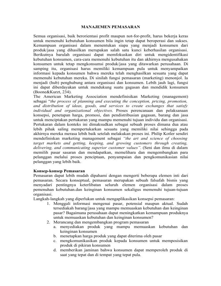 MANAJEMEN PEMASARAN Semua organisasi, baik berorientasi profit maupun not-for-profit, harus bekerja keras untuk memenuhi kebutuhan konsumen bila ingin tetap dapat beroperasi dan sukses. Kemampuan organisasi dalam menentukan siapa yang menjadi konsumen dari produk/jasa yang dihasilkan merupakan salah satu kunci keberhasilan organisasi. Berikutnya barulah organisasi dapat memfokuskan diri untuk mengidentifikasi kebutuhan konsumen, cara-cara memenuhi kebutuhan itu dan akhirnya mengusahakan konsumen untuk tetap mengkonsumsi produk/jasa yang ditawarkan perusahaan. Di samping itu, organisasi harus memiliki kemampuan pula untuk menyampaikan informasi kepada konsumen bahwa mereka telah menghasilkan sesuatu yang dapat memenuhi kebutuhan mereka. Di sinilah fungsi pemasaran (marketing) menonjol. Ia menjadi (hub) penghubung antara organisasi dan konsumen. Lebih jauh lagi, fungsi ini dapat diberdayakan untuk mendukung suatu gagasan dan mendidik konsumen (Boone&Kurzt, 234). The American Marketing Association mendefinisikan Marketing (management) sebagai “the process of planning and executing the conception, pricing, promotion, and distribution of ideas, goods, and services to create exchanges that satisfy individual and organizational objectives. Proses perencanaan dan pelaksanaan konsepsi, penetapan harga, promosi, dan pendistribusian gagasan, barang dan jasa untuk menciptakan pertukaran yang mampu memenuhi tujuan individu dan organisasi. Pertukaran dalam konteks ini dimaksudkan sebagai sebuah proses dimana dua atau lebih pihak saling mempertukarkan sesuatu yang memiliki nilai sehingga pada akhirnya mereka merasa lebih baik setelah melakukan proses ini. Philip Kotler sendiri mendefiniskan marketing management sebagai “the art and science of choosing target markets and getting, keeping, and growing customers through creating, delivering, and communicating superior customer values”. (Seni dan ilmu di dalam memilih pasar sasaran dan mendapatkan, memelihara dan mengembangkan para pelanggan melalui proses penciptaan, penyampaian dan pengkomunikasian nilai pelanggan yang lebih baik. Konsep-konsep Pemasaran Pemasaran dapat lebih mudah dipahami dengan mengerti beberapa elemen inti dari pemasaran. Secara konseptual, pemasaran merupakan sebuah falsafah bisnis yang menyadari pentingnya keterlibatan seluruh elemen organisasi dalam proses pemenuhan kebutuhan.dan keinginan konsumen sekaligus memenuhi tujuan-tujuan organisasi. Langkah-langkah yang diperlukan untuk mengaplikasikan konsepsi pemasaran: 1. Menggali informasi mengenai pasar, potensial maupun aktual. Sudah tersediakah barang/jasa yang mampu memuaskan kebutuhan dan keinginan pasar? Bagaimana perusahaan dapat meningkatkan kemampuan produknya untuk memuaskan kebutuhan dan keinginan konsumen? 2. Merancang dan mengembangkan program pemasaran a. menyediakan produk yang mampu memuaskan kebutuhan dan keinginan konsumen b. menetapkan harga produk yang dapat diterima oleh pasar c. mengkomunikasikan produk kepada konsumen untuk memposisikan produk di pikiran konsumen d. memberikan jaminan bahwa konsumen dapat memperoleh produk di saat yang tepat dan di tempat yang tepat pula. 3. Mengevaluasi melalui proses penggalian informasi mengenai erektivitas program-program pemasaran perusahaan. Aktivitas-aktivitas pemasaran seharusnya dilaksanakan dengan mempertimbangkan efisiensi, efektivitas, dan tanggung jawab sosial pemasaran. Di dalam khasanah pemasaran terdapat lima konsep yang mendasari aktivitas pemasaran perusahaan: konsep produksi, konsep produk, konsep penjualan, konsep pemasaran, dan konsep pemasaran sosial. Konsep Produksi: Konsep produksi meyakini bahwa konsumen akan lebih menyukai produk-produk yang tersedia di mana-mana dan dengan harga murah. (The production concept holds that consumers will prefer products that are widely available and inexpensive.) Konsep Produk Konsep produk meyakini bahwa konsumen akan lebih menyukai produk-produk yang menawarkan kualitas yang baik, kinerja, atau fitur-fitur yang inovatif. (The product concept holds that consumers will favor those products that offer the most quality, performance, or innovative features.) Konsep Penjualan Konsep penjualan meyakini bahwa bila konsumen dan pelaku bisnis dibiarkan saja, maka mereka tidak akan membeli dalam jumlah yang memadai produk-produk perusahaan. Perusahaan haruslah melakukan usaha penjualan dan promosi yang agresif. (The selling concept holds that consumers and businesses, if left alone, will ordinarily not buy enough of the organization’s products. The organization must, therefore, undertake an aggressive selling and promotion effort.) Konsep Pemasaran Konsep pemasaran meyakini bahwa kunci untuk mencapai tujuan perusahaan mencakup usaha perusahaan untuk menjadi lebih efektif daripada para pesaingnya dalam hal menciptakan, menyampaikan, dan mengkomunikasikan kepada pasar sasaran yang ditetapkan nilai manfaat bagi konsumen (The marketing concept holds that the key to achieving its organizational goals consists of the company being more effective than competitors in creating, delivering, and communicating customer value to its chosen target markets.) Konsep Pemasaran Sosial Konsep pemasaran sosial meyakini bahwa tugas perusahaan adalah menetapkan kebutuhan, keinginan, dan kepentingan pasar sasaran dan memberikan kepuasan yang diinginkan secara lebih efektif dan efisien daripada para pesaing dengan cara-cara yang menjaga atau meningkatkan kesejahteraan konsumen dan masyarakat. (The social Marketing concept holds that the organization’s task is to determine the needs, wants, and interests of target markets and to deliver the desired satisfactions more effectively and efficiently than competitors in a way that preserves or enhances the consumer’s and the society’s well-being.) PRODUCTS NEEDS & WANTS MARKETING CORE CONCEPTS MARKET EXCHANGE VALUES, SATISFACTION ELEMEN INTI PEMASARAN 1. Pasar Banyak cara orang mendefinisikan konsep pasar. Pasar di sini dimaksudkan sebagai sekelo