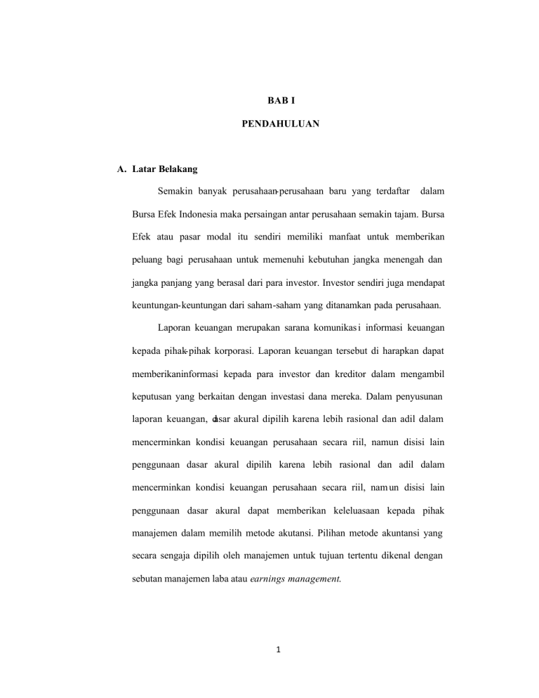 1 BAB I PENDAHULUAN A. Latar Belakang Semakin banyak perusahaan-perusahaan baru yang terdaftar dalam Bursa Efek Indonesia maka persaingan antar perusahaan semakin tajam. Bursa Efek atau pasar modal itu sendiri memiliki manfaat untuk memberikan peluang bagi perusahaan untuk memenuhi kebutuhan jangka menengah dan jangka panjang yang berasal dari para investor. Investor sendiri juga mendapat keuntungan-keuntungan dari saham-saham yang ditanamkan pada perusahaan. Laporan keuangan merupakan sarana komunikas i informasi keuangan kepada pihak-pihak korporasi. Laporan keuangan tersebut di harapkan dapat memberikaninformasi kepada para investor dan kreditor dalam mengambil keputusan yang berkaitan dengan investasi dana mereka. Dalam penyusunan laporan keuangan, dasar akural dipilih karena lebih rasional dan adil dalam mencerminkan kondisi keuangan perusahaan secara riil, namun disisi lain penggunaan dasar akural dipilih karena lebih rasional dan adil dalam mencerminkan kondisi keuangan perusahaan secara riil, nam un disisi lain penggunaan dasar akural dapat memberikan keleluasaan kepada pihak manajemen dalam memilih metode akutansi. Pilihan metode akuntansi yang secara sengaja dipilih oleh manajemen untuk tujuan tertentu dikenal dengan sebutan manajemen laba atau earnings management. 1 2 Manajemen laba merupakan salah satu topik penelitian yang sangat menarik perhatian peneliti. Berbagai hasil penelitian terdahulu membuktikan manajer menggunakan kebijakan pengelolahan akrual untuk berbagai alasan. Laba terakhir dari sebuah proses akuntansi yang memberikan kebebasan bagi para penyusunnya untuk memilih metode akutansi. Manajer dapat menggunakan kebijakannya untuk menetapkan waktu dan jumlah dari pendapatan dan biaya yang terjadi dalam perusahaan (Assih, Hastuti & Parawiyati, 2005). Jika pada suatu kondisi dimana pihak manajemen ternyata tidak berhasil mencapai target laba yang ditentukan, maka manajemen akan memanfaatkan fleksibilitas yang diperbolehkan oleh standar akuntansi dalam menyusun laporan keuangan untuk memodifikasi laba yang dilaporkan. Manajemen termotivasi untuk memperlihatkan kinerja yang baik dalam menghasilkan nilai atau keuntungan maksimal bagi perusahaan sehingga manajemen cenderung memilih dan menerapkan metode akuntansi yang dapat memberikan informasi laba lebih baik. Adanya asimetri informasi memungkinkan manajemen untuk melakukan manajemen laba. .Penelitian menunjukan adanya hubungan yang positif antara asimetri informasi dengan manajemen laba (Richardson, 1998). Kebijakan dividen merupakan salah satu bagian yang mempengaruhi keputusan pendanaan perusahaan sehingga menjadi suatu hal yang penting dan harus di pertimbangkan secara seksama. Kebijakan dividen menyangkut 3 apakah laba akan di bayarkan sebagai dividen atau ditahan untuk reinvestasi dalam perusahaan (Sawir, 2004). Dividen memiliki arti penting bagi perusahaan karena berkaitan dengan pengalokasian laba yang tepat sehingga pertumbuhan perusahaan dan kesejahteraan para pemegang saham dapat terjamin.Penetapan dividen di pengaruhi oleh dua kelompok faktor yaitu keuangan dan non-keuangan. Penelitian ini memfokuskan pada pembahasan faktor keuangan yang diukur dengan rasio keuangan karena dapat memberikan gambaran mengenai kinerja perusahaa. Perusahaan selalu berusaha meningkatkan citranya dengan cara setiap peningkatan laba akan diikuti dengan peningkatan porsi laba yang akan dibagi sebagai dividen dan juga dapat mendorong peningkatan nilai saham perusahaan. Atribut laba disini diukur dengan Earning Per Share (EPS) (Marlina & Danika, 2009). Perusahaan menetapkan kebijakan laba untuk mentindaklanjuti perolehan laba yang dapat dialokasikan pada dua komponen yaitu dividen dan laba ditahan. Dividen merupakan bagian laba yang tersedia bagi para pemegang saham biasa dalam bentuk tunai. Laba ditahan (retained eraning) adalah bagian dari laba yang tersedia bagi para pemegang saham yang ditahan oleh perusahaan untuk diinvestasikan kembali (reinvestment) dengan tujuan untuk mengejar pertumbuhan perusahaan. Oleh karena itu, berdasarkan da ri uruaian latar belakang peneliti ingin meneliti “ ANALISIS MANAJEMEN LABA YANG MEMPENGARUHI 4 KEBIJAKAN DEVIDEN (STUDI PERUSAHAAN MANUFAKTUR YANG TERDAFTAR DI Bursa Efek Indonesia PERIODE 2009-2011) “. B. Rumusan Masalah 1. Apakah ada pengaruh yang signifikan antara manajemen laba dan profitabilitas terhadap kebijakan dividen pada perusahaan yang terdaftar di Bursa Efek Indonesia 2009-2011? 2. Apakah ada pengaruh manajemen laba dan profitabilitas secara bersamasama dan signifikan terhadap kebijakan dividen pada perusahaan yang terdaftar di Bursa Efek Indonesia 2009-2011? C. Tujuan Penelitian 1. Mengetahui pengaruh antara manajemen laba dan profitabilitas terhadap kebijakan dividen yang signifikan secara parsial pada perusahaan yang terdaftar di Bursa Efek Indonesia 2009-2011. 2. Mengetahui pengaruh antara manajemen laba dan profitabilitas terhadap kebijakan dividen yang bersama-sama dan signifikan pada perusahaan yang terdaftar di Bursa Efek Indonesia 2009-2011. 5 D. Manfaat Penelitian 1. Manfaat Teoritis Manfaat teoritis dari penelitian ini dapat mengaplikasikan manfaaat dari manajemen laba dan profitabilitas yang berkaitan dengan kebijakan deviden perusahaan. 2. Manfaat Akademis Manfaat bagi akademi penelitian ini diharapkan dapat menjadi referensi dan acuan dalam penelitian selanjutnnya. E. Sistematika Penulisan BAB I : PENDAHULUAN Bab pertama menjelaskan tentang latar belakang masalah, rumusan masalah, tujuan dan manfaat penelitian, serta sistematika penulisan. BAB II : LANDASAN TEORI Bab kedua menjelaskan tentang landasan teori yang digunakan sebagai acuan perbandingan untuk membahas masalah manajemen laba, dividen, kebijakan dividen dan penelitian terdahulu. BAB III : METODOLOGI PENELITIAN Bab tiga menjelaskan tentang metodologi penelitian yang terdiri dari pengidentifikasian variable -variabel penelitian dan penjelasan pengukuran variable tersebut, gambaran populasi dan sempel 6 perusaha