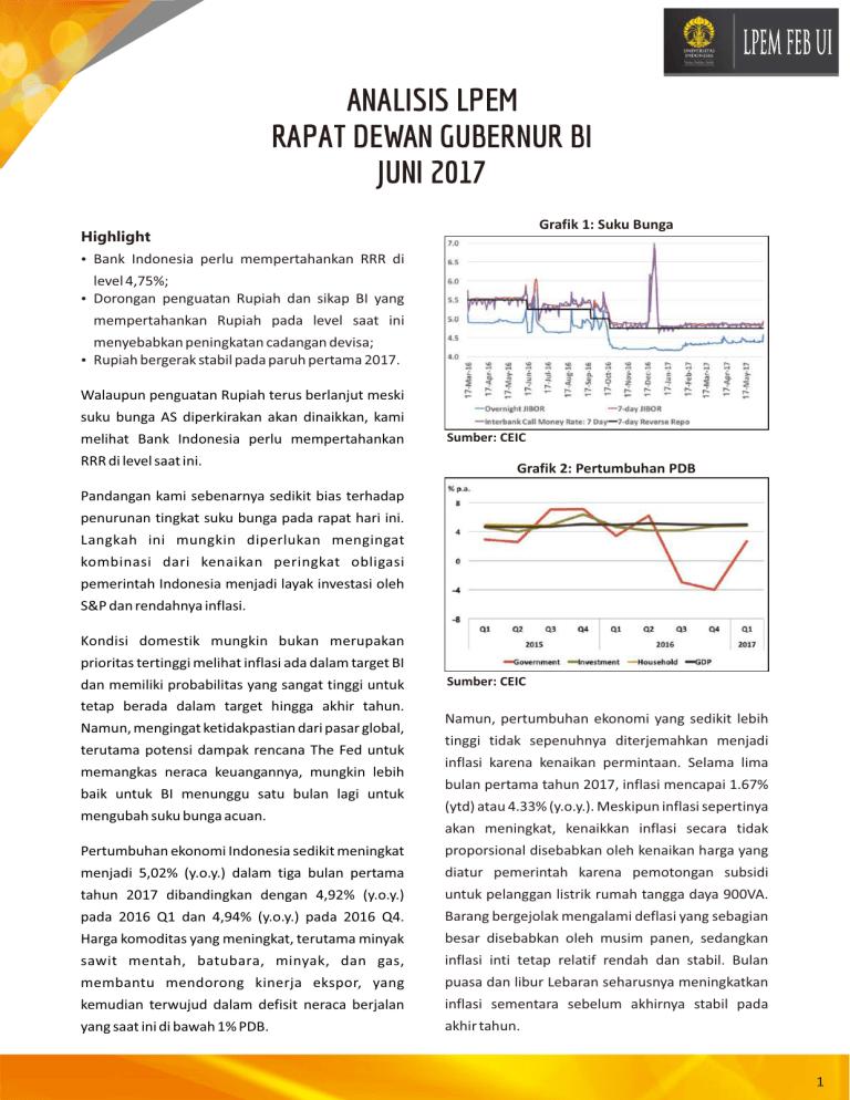 LPEM FEB UI ANALISIS LPEM RAPAT DEWAN GUBERNUR BI JUNI 2017 Grafik 1: Suku Bunga Highlight Ÿ Bank Indonesia perlu mempertahankan RRR di level 4,75%; Ÿ Dorongan penguatan Rupiah dan sikap BI yang mempertahankan Rupiah pada level saat ini menyebabkan peningkatan cadangan devisa; Ÿ Rupiah bergerak stabil pada paruh pertama 2017. Walaupun penguatan Rupiah terus berlanjut meski suku bunga AS diperkirakan akan dinaikkan, kami melihat Bank Indonesia perlu mempertahankan RRR di level saat ini. Sumber: CEIC Grafik 2: Pertumbuhan PDB Pandangan kami sebenarnya sedikit bias terhadap penurunan tingkat suku bunga pada rapat hari ini. Langkah ini mungkin diperlukan mengingat kombinasi dari kenaikan peringkat obligasi pemerintah Indonesia menjadi layak investasi oleh S&P dan rendahnya inflasi. Kondisi domestik mungkin bukan merupakan prioritas tertinggi melihat inflasi ada dalam target BI dan memiliki probabilitas yang sangat tinggi untuk tetap berada dalam target hingga akhir tahun. Namun, mengingat ketidakpastian dari pasar global, terutama potensi dampak rencana The Fed untuk memangkas neraca keuangannya, mungkin lebih baik untuk BI menunggu satu bulan lagi untuk mengubah suku bunga acuan. Sumber: CEIC Namun, pertumbuhan ekonomi yang sedikit lebih tinggi tidak sepenuhnya diterjemahkan menjadi inflasi karena kenaikan permintaan. Selama lima bulan pertama tahun 2017, inflasi mencapai 1.67% (ytd) atau 4.33% (y.o.y.). Meskipun inflasi sepertinya akan meningkat, kenaikkan inflasi secara tidak Pertumbuhan ekonomi Indonesia sedikit meningkat proporsional disebabkan oleh kenaikan harga yang menjadi 5,02% (y.o.y.) dalam tiga bulan pertama diatur pemerintah karena pemotongan subsidi tahun 2017 dibandingkan dengan 4,92% (y.o.y.) untuk pelanggan listrik rumah tangga daya 900VA. pada 2016 Q1 dan 4,94% (y.o.y.) pada 2016 Q4. Barang bergejolak mengalami deflasi yang sebagian Harga komoditas yang meningkat, terutama minyak besar disebabkan oleh musim panen, sedangkan sawit mentah, batubara, minyak, dan gas, inflasi inti tetap relatif rendah dan stabil. Bulan membantu mendorong kinerja ekspor, yang puasa dan libur Lebaran seharusnya meningkatkan kemudian terwujud dalam defisit neraca berjalan inflasi sementara sebelum akhirnya stabil pada yang saat ini di bawah 1% PDB. akhir tahun. 1 Karena inflasi tetap terjaga dan diperkirakan akan Bank Indonesia juga mungkin tertarik untuk tetap demikian hingga akhir tahun, kami melihat menjaga agar Rupiah tidak terdepresiasi sehingga bahwa pertumbuhan ekonomi masih bisa terus membantu eksportir, seperti yang meningkat tanpa mempercepat inflasi, sebuah sebelumnya dilakukan. Grafik 4: IDR/USD dan Akumulasi Arus Modal Masuk (Portfolio) selama 12 Bulan Terakhir indikasi bahwa perekonomian secara keseluruhan masih berjalan sedikit di bawah potensinya. Pengeluaran pemerintah masih di bawah pertumbuhan ekonomi dan pertumbuhan ekonomi secara keseluruhan tetap berada di bawah target. Namun demikian, pengeluaran pemerintah seharusnya meningkat pada tiga kuartal ke depan dibandingkan dengan pertumbuhan yang rendah dalam dua kuartal terakhir tahun 2016 karena pemotongan anggaran. Grafik 3: Inflasi (mtm) Sumber: CEIC Mempertahankan Rupiah dengan cara memeningkatkan cadangan devisa dapat menjadi relatif mahal, terutama jika kondisi domestik memungkinkan untuk penurunan suku bunga. Arus modal masuk ke obligasi pemerintah dalam Rupiah telah menghasilkan imbal hasil 10 tahun dan 1 tahun masing-masing mencapai 7.13% dan 5.86%, level terendah dalam 4 tahun terakhir. Sekali lagi, Sumber: CEIC kami melihat terdapat ruang bagi BI untuk menurunkan tingkat suku bunga acuan, mengingat Rupiah menunjukkan kinerja yang stabil sejauh ini, pada kisaran IDR 13,255 – IDR 13,485 per USD. Namun, kestabilan ini menutupi penguatan Rupiah; risiko yang rendah untuk melakukannya. Grafik 5: Cadangan Devisa dalam Bulan Impor dan Pembayaran Utang Luar Negeri cadangan devisa hamper menyentuh level USD 125 miliar, tertinggi dalam sejarah, meskipun The Fed diprediksi akan meningkatkan suku bunga acuan AS. Tingkat cadangan devisa juga berada pada rekor tertinggi dalam bulan impor dan pembayaran utang luar negeri seperti yang terlihat pada Grafik 5. Bank Indonesia mungkin ingin Rupiah tetap pada tingkat yang stabil agar tidak terjadi depresiasi mendadak jika terjadi arus modal keluar yang Sumber: Bank Indonesia mendadak, karena arus masuk modal jangka pendek ke pasar finansial Indonesia berlanjut setelah S&P meningkatkan peringkat obligasi pemerintah ditingkatkan menjadi layak investasi. LPEM FEB UI Jl. Salemba Raya No. 4, Jakarta 10430, Indonesia Kajian Makroekonomi dan Pasar Keuangan Febrio Kacaribu, Ph.D., Kepala Kajian Alvin Ulido Lumbanraja, S.E., Asisten Peneliti Faradina Alifia Maizar, S.E. , Asisten Peneliti Phone. +62-21-3143177, Fax. +62-21-31934310 E-mail. [email protected] Website. www.lpem.org