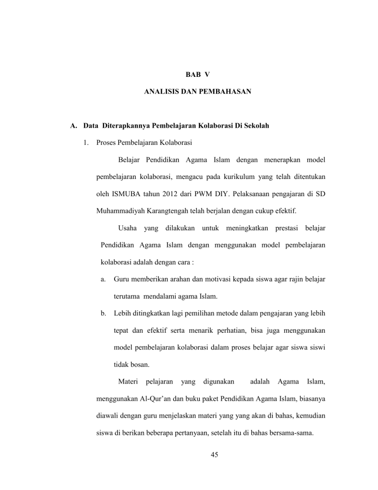 BAB V ANALISIS DAN PEMBAHASAN A. Data Diterapkannya Pembelajaran Kolaborasi Di Sekolah 1. Proses Pembelajaran Kolaborasi Belajar Pendidikan Agama Islam dengan menerapkan model pembelajaran kolaborasi, mengacu pada kurikulum yang telah ditentukan oleh ISMUBA tahun 2012 dari PWM DIY. Pelaksanaan pengajaran di SD Muhammadiyah Karangtengah telah berjalan dengan cukup efektif. Usaha yang dilakukan untuk meningkatkan prestasi belajar Pendidikan Agama Islam dengan menggunakan model pembelajaran kolaborasi adalah dengan cara : a. Guru memberikan arahan dan motivasi kepada siswa agar rajin belajar terutama mendalami agama Islam. b. Lebih ditingkatkan lagi pemilihan metode dalam pengajaran yang lebih tepat dan efektif serta menarik perhatian, bisa juga menggunakan model pembelajaran kolaborasi dalam proses belajar agar siswa siswi tidak bosan. Materi pelajaran yang digunakan adalah Agama Islam, menggunakan Al-Qur’an dan buku paket Pendidikan Agama Islam, biasanya diawali dengan guru menjelaskan materi yang yang akan di bahas, kemudian siswa di berikan beberapa pertanyaan, setelah itu di bahas bersama-sama. 45 2. Penerapan Pembelajaran Kolaborasi a. Membuka kegiatan pembelajaran dengan memberikan motivasi dan apersepsi kepada siswa. b. Menjelaskan secara ringkas materi pembelajaran dengan menggunakan media pembelajaran power point materi Pendidikan Agama Islam. c. Membentuk kelompok belajar yang terdiri dari 4 atau 5 orang siswa. d. Memberikan soal atau tugas yang mendorong eksplorasi dalam bentuk lembar kerja siswa (LKS) e. Guru mendorong aktifitas diskusi antara sesama siswa dalam satu kelompok, maupun antara kelompok dalam satu kelas. Guru membantu siswa untuk menghubungkan antara pendapat sendiri dengan pendapat temannya, dan dengan menghubungkan pendapat yang berkembang selama diskusi dengan materi pembelajaran. f. Guru memperhatikan dan mendekati siswa yang kurang mampu berinteraksi dengan siswa lain, atau yang tidak dapat mengikuti pembelajaran karena kurangnya pengetahuan dan pemahaman. g. Memberikan penghargaan bagi kelompok dengan kinerja yang baik. Berdasarkan tata laksana pembelajaran diatas, maka secara garis besar metode kolaborasi yang digunakan adalah perpaduan antara 3 jenis metode kolaborasi secara langsung, yakni jenis STAD, TAI dan CIRC. Bukti kegiatan dengan menggunakan metode STAD (Student Team Achievement Divisions) terlihat pada bagian ketika guru membagi murid 46 dalam 4-5 kelompok kecil dan memberikan penghargaan bagi kelompok yang terbaik. Tentu, hal tersebut bersesuaian dengan pengertian STAD itu sendiri, yakni keberhasilan kelompok ditentukan oleh kelompok dan setiap anggota dalam kelompok itu sendiri. Sehingga berkat keberhasilan tersebut, kelompok bisa diberikan hadiah berupa penghargaan seperti tambahan nilai dan/atau semacamnya. Kedua, bukti kegiatan dengan menggunakan metode TAI (Team Accelerated Instruction ) terlihat dengan jelas melalui kegiatan ketika guru membagikan tugas – tugas kepada siswa dalam bentuk LKS ( Lembar Kerja Siswa ). Gurupun memberikan bimbingan kepada siswa / kelompok yang kurang mampu untuk menyelesaikan permasalahan pada tahap awal hingga siswa / kelompok tersebut mengerti dan mampu memahami tugas yang diberikan sebelum mengerjakan tugas yang lain. Hal itu secara langsung menegaskan bahwa aktivitas diatas menunjukan kesesuaian dengan pengertian metode TAI itu sendiri. Terakhir, bukti kegiatan dengan menggunakan metode CIRC (Cooperative Integrated Reading and Composition) terlihat pada bagian ketika guru meminta setiap kelompok untuk memperhatikan secara seksama materi yang disampaikan dan membacanya. Selain itu siswapun diminta untuk membaca LKSnya sebelum mengerjakan. Ini berarti, aktivitas tersebut sudah memperlihatkan aktivitas membaca yang merupakan salah satu bagian dari metode CIRC 47 3. Prestasi Siswa Juara III lomba hafalan surat-surat pendek dan doa tingkat kecamatan. 4. Penggunaan Pembelajaran Kolaborasi di Kelas Secara umum, penggunaan pembelajaran kolaborasi di kelas memililki kegiatan sebagai berikut : a. Para siswa dalam kelompok menetapkan tujuan belajar dan membagi tugas sendiri-sendiri. b. Semua siswa dalam kelompok membaca, berdiskusi, dan menulis. c. Kelompok kolaboratif bekerja secara bersinergi mengidentifikasi, mendemontrasikan, meneliti, menganalisis, dan memformulasikan jawaban-jawaban tugas atau masalah dalam LKS atau masalah yang ditemukan sendiri. d. Setelah kelompok kolaboratif menyepakati hasil pemecahan masalah, masingmasing siswa menulis laporan sendiri-sendiri secara lengkap. e. Guru menunjuk salah satu kelompok secara acak (selanjutnya diupayakan agar semua kelompok dapat giliran ke depan) untuk melakukan presentasi hasil diskusi kelompok kolaboratifnya di depan kelas, siswa pada kelompok lain mengamati, mencermati, membandingkan hasil presentasi tersebut, dan menanggapi. Kegitan ini dilakukan selama lebih kurang 20-30 menit. 6. Masing-masing siswa dalam kelompok kolaboratif melakukan elaborasi, inferensi, dan revisi (bila diperlukan) terhadap laporan yang akan dikumpulan. 48 f. Laporan masing-masing siswa terhadap tugas-tugas yang telah dikumpulkan, disusun perkelompok kolaboratif. g. Laporan siswa dikoreksi, dikomentari, dinilai, dikembalikan pada pertemuan berikutnya, dan didiskusikan. Namun, urutan diatas tidak selalu menjadi patokan dalam melaksanakan sistem pembelajran kolabosrasi. Hal tersbut dapat disesuaikan dengan kondisi dan strategi yang digunakan. Salah satu contoh strategi pembelajaran kolaboratif adalah card sort. Strategi ini digunakan untuk mengajarkan konsep, penggolongan sifat, fakta tentang obyek, atau mengulangi informasi. Strategi ini menguras banyak energi, sehingga tidak disarankan digunakan ketika siswa dalam kondisi letih. Prosedurnya adalah sebagai berikut: a. Berilah siswa kartu indeks yang memberikan informasi atau contoh yang cocok dengan satu atau lebih katagori. b. Mintalah siswa untuk mencari temannya dan menemukan orang yang memiliki kartu dengan katagori yang sama. c. Bi