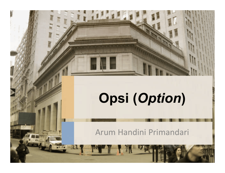 Opsi (Option) Arum Handini Primandari Definisi • Opsi adalah sebuah kontrak (sekuritas) yang memberikan hak kepada pemegangnya untuk membeli atau menjual suatu aset (contohnya: saham) tertentu saat jatuh tempo atau sebelumnya, pada harga yang telah disepakati. • Opsi merupakan produk derivatif (turunan), artinya opsi memiliki aset acuan. Jenis Opsi Ada dua tipe dasar opsi, yaitu: 1) Opsi call (Call Option) Opsi call atau disebut juga opsi beli adalah opsi yang memberikan hak kepada pemegangnya untuk membeli saham tertentu pada waktu dan harga yang telah disepakati. 2) Opsi put (Put Option) Opsi put atau disebut juga opsi jual adalah opsi yang memberikan hak kepada pemegangnya untuk menjual saham tertentu pada waktu dan harga yang telah disepakati. Dilihat dari fleksibilitas waktu untuk menjalankannya, terdapat beberapa tipe opsi yaitu: 1) Opsi Eropa Opsi Eropa memberikan pemegangnya hak untuk melaksanakan opsi pada saat jatuh tempo. 2) Opsi Amerika Opsi Amerika memberikan pemegangnya hak untuk melaksanakan opsi pada sembarang waktu sebelum jatuh tempo. 3) Opsi Bermuda Merupakan gabungan dari tipe Eropa dan Amerika, yaitu opsi dapat dijalankan pada saat jatuh tempo dan waktu tertentu sebelum jatuh tempo. Opsi Call • Fungsi keuntungan opsi call adalah fT maks ( ST K ,0) • Harga opsi merupakan harapan keuntungan opsi pada waktu jatuh tempo yang terdiskon (di-presentvalue-kan) oleh suku bunga bebas resiko r C e rT E[maks ( ST K ,0)] – Dimana ST adalah harga saham pada waktu T, K adalah harga kontrak, dan E menunjukkan nilai harapan Formula Black-Scholes • Model yang digunakan untuk menentukan harga opsi call maupun put tipe Eropa adalah model BlackScholes Merton (atau disebut Black-Scholes). • Model penentuan harga opsi yang populer dan banyak digunakan oleh praktisi. Formula BS untuk Opsi Call • Formula Black-Scholes untuk opsi call adalah C S0 N d1 Ke r N d 2 Dengan: 1 2 S0 log r 2 K d1 , 1 2 S0 log r 2 K d2 d1 S0 : harga saham saat t = 0 K: harga kontrak τ (tau): umur opsi dalam satuan tahun r: suku bunga bebas resiko σ (sigma): volatilitas saham N(.): nilai kumulatif distribusi normal standar Contoh Diketahui data saham milik Yahoo, Inc.: • Opsi call milik Yahoo, Inc.: Misalkan pada tanggal 27 Mei 2014 kita melakukan pembelian opsi call Yahoo yang memiliki jatuh tempo 27 Juni 2014. Opsi tersebut memiliki harga kontrak $34.50. Menggunakan suku bunga bebas resiko US sebesar 0,25%, tentukan harga opsi tersebut dengan menggunakan formula Black-Scholes! Ambil data historis Yahoo selama 1 tahun untuk mengestimasi volatilitasnya Lakukan estimasi volatilitas Hitung harga opsi menggunakan formula Black-Scholes • Estimasi volatilitas historis: 0.32803 • Perhitungan S0 34.98; K 34.5; r 0.0025; 24 252 0.0952; 0.3280 1 34.98 2 log 0.0025 (0.3280) 0.0952 2 34.5 d1 0.1895 0.3280 0.0952 d 2 0.1895 0.3280 0.0952 0.0882 C 34.98* N (0.1895) 34.5* e 0.0025*0.0952 * N (0.0882) 1.6598 • File perhitungan: yhoo.xls Opsi Put • Fungsi keuntungan opsi put adalah fT maks ( K ST ,0) • Harga opsi merupakan harapan keuntungan opsi pada waktu jatuh tempo yang terdiskon oleh suku bunga bebas resiko r P e rT E[maks ( K ST ,0)] – Dimana ST adalah harga saham pada waktu T, K adalah harga kontrak, dan E menunjukkan nilai harapan Formula BS untuk Opsi Put • Formula Black-Scholes untuk opsi put adalah P Ke r N d 2 S0 N d1 • Nilai d1 dan d2 sama dengan formula BS untuk opsi call. Contoh • Opsi call milik Yahoo, Inc.: Misalkan pada tanggal 27 Mei 2014 kita melakukan pembelian opsi put Yahoo yang memiliki jatuh tempo 27 Juni 2014. Opsi tersebut memiliki harga kontrak $34.50. Menggunakan suku bunga bebas resiko US sebesar 0,25%, tentukan harga opsi tersebut dengan menggunakan formula BlackScholes! • Perhitungan: yahoo.xls Batas-Batas Harga Opsi Call • Batas atas harga opsi call: Pada kondisi apa pun, baik opsi tipe Eropa maupun Amerika tidak pernah melebihi harga saham pokoknya. Dengan demikian batas atas harga opsi adalah: C S0 • Batas bawah harga opsi call: Harga minimal opsi (tanpa adanya pembayaran dividen) adalah C S0 Ke r , sehingga batas bawah harga opsi call adalah: C S0 Ke r Batas-Batas Harga Opsi Put • Batas atas harga opsi put: – – Tidak peduli seberapa pun harga saham akan turun, harga opsi put tidak lebih besar dari K. Untuk opsi put tipe Eropa, opsi put tidak dapat bernilai lebih dari K, sehingga harga opsi put (sekarang) tidak melebihi present-value dari K: P Ke r • Batas bawah harga opsi put: – Untuk opsi put tipe Eropa (tanpa pembayaran dividen), batas bawah opsi put adalah: P Ke r S0 Put Call Parity • Hubungan antara opsi call dan opsi put secara matemetis disebut dengan put call parity • Put Call Parity: C Ke r P S0 Referensi • Desmond J. Higham, 2004, An Introduction to Financial Option Valuation, Cambridge University Press: US. • John C. Hull, 2012, Option, Future, and Other Derivative, Pearson: England.