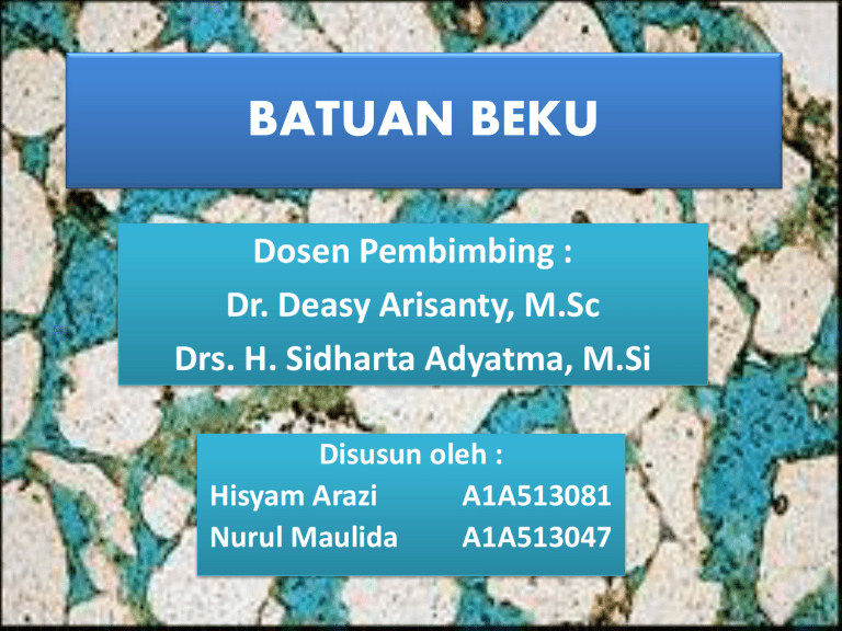 BATUAN BEKU Dosen Pembimbing : Dr. Deasy Arisanty, M.Sc Drs. H. Sidharta Adyatma, M.Si Disusun oleh : Hisyam Arazi A1A513081 Nurul Maulida A1A513047 ROCK CYCLE Batuan Beku 4.1 Pembagian Genetik Batuan Beku Batuan beku atau Igneos Rocks adalah jenis batuan yang terbentuk dari proses pembekuan magma dalam perjalanannya menuju permukaan bumi baik pembekuannya didalam (intrusi) karena magma belum mencapai permukaan bumi atau pembekuannya diluar (ekstrusi) karena magma sudah mengalir di permukaan bumi atau disebut juga Lava. Ciri khas batuan beku adalah kenampakannya yang kristalin, yaitu kenampakan suatu massa dari unit-unit Kristal yang saling mengisi kecuali gelas yang bersifat non kristalin. 4.1.1 Batuan Ekstrusi Batuan ekstrusi merupakan batuan beku yang terbentuk dari pembekuan magma di permukaan bumi. Batuan ini terdiri dari mineral-mineral yang dikeluarkan ke permukaan bumi baik yang di daratan maupun yang ada di permukaan laut. Gambar 1: lava yang membentuk batuan ekstrusif. Mineral-mineral ini mengalami proses pendinginan yang sangat cepat akibat dari perbedaan suhu yang cukup tinggi antara suhu awal dan suhu permukaan bumi. Mineralmineral ini dapat berupa debu atau cairan kental dan panas yang disebut lava. 2 tipe lava yang biasanya membentuk batuan ekstrusi adalah : • Lava basaltik, atau lava yang bersifat basa dengan ciri kandungan silika yang rendah dan viskositasnya juga relatif rendah. Lava basaltik ini muncul di permukaan bumi melalui celah yang berhubungan langsung dengan bagian dalam bumi dan setelah mencapai permukaan, lava ini akan mengalir, menyebar ke segala arah karena sifatnya yang sangat cair.contoh: pada Mauna Loa, gunung api di Iceland yang bertipe basaltic magma • Lava asam. Lava jenis ini memiliki viskositas dan kandungan silika yang tinggi dan apabila mencapai permukaan akan menjadi suatu aliran sepanjang lembah Lava basaltik Lava asam. Tekstur Batuan Ekstrusif Tekstur dalam batuan beku ekstrusif merupakan suatu kenampakan yang lebih memperlihatkan hubungan antara massa mineral dan massa gelas yang membentuk batuan ekstrusif ini. Karena proses pendinginan yang cepat, mineralmineral yang terdapat dalam batuan ekstrusif ini tidak sempat mengalami pengkristalan sempurna, sehingga mineral yang terbentuk berukuran sangat kecil atau bahkan tidak sempat mengkristal dan hanya membentuk gelas-gelas vulkanik. • Afanitik : Semua butir mineral sangat halus, tidak dapat dikenali dengan mata telanjang • Glassy : Batuan tersusun seluruhnya oleh gelas vulkanik (holohyalin) dikarenakan tidak sempatnya mineral mengkristal yang disebabkan penurunan suhu yang cepat. Struktur Batuan Ekstrusif • Masif / padat Dalam batuan beku tidak terdapat lubang-lubang. • Vesicular Jika pada batuan beku terdapat lubang lubang yangsejajar yang terbentuk akibat keluarnya gas-gas pada saat proses pembekuan • Scoriaceous Jika pada batuan beku terdapat lubang-lubang yang tidak teratur Masif Vesicular Scoriaceous • Amygdaloidal Jika pada batuan beku terdapat lubang lubang yang kemudian terisi oleh mineral mineral sekunder atau yang biasa disebut dengan Amygdule. • Flow-structure Jika pada batuan beku telihat adanya kesejajaran mineral mineral yang menunjukkan srtuktur aliran. • Pumoceous Apabila dalam suatu batuan beku terdapat lubang-lubang halus dan banyak serta berbentuk silinder maka batuan tersebut dapat dikatakan memiliki struktur pumiceous. Amygdaloidal Flow-structure 4.1.2 Batuan Intrusi Batuan beku intrusif adalah batuan beku yang proses pembekuannya berlangsung dibawah permukaan bumi. berdasarkan kedudukannya terhadap perlapisan batuan yang diterobosnya struktur tubuh batuan beku intrusif terbagi menjadi dua yaitu konkordan dan diskordan. Konkordan • • • • Tubuh batuan beku intrusif yang sejajar dengan perlapisan disekitarnya, jenis jenis dari tubuh batuan ini yaitu : Sill, tubuh batuan yang berupa lembaran dan sejajar dengan perlapisan batuan disekitarnya. Laccolith, tubuh batuan beku yang berbentuk kubah (dome), dimana perlapisan batuan yang asalnya datar menjadi melengkung akibat penerobosan tubuh batuan ini, sedangkan bagian dasarnya tetap datar. Diameter laccolih berkisar dari 2 sampai 4 mil dengan kedalaman ribuan meter. Lopolith, bentuk tubuh batuan yang merupakan kebalikan dari laccolith, yaitu bentuk tubuh batuan yang cembung ke bawah. Lopolith memiliki diameter yang lebih besar dari laccolith, yaitu puluhan sampai ratusan kilometer dengan kedalaman ribuan meter. Paccolith, tubuh batuan beku yang menempati sinklin atau antiklin yang telah terbentuk sebelumnya. Ketebalan paccolith berkisar antara ratusan sampai ribuan kilometer. Diskordan Tubuh batuan beku intrusif yang memotong perlapisan batuan disekitarnya. Jenis-jenis tubuh batuan ini yaitu: • Dyke, yaitu tubuh batuan yang memotong perlapisan disekitarnya dan memiliki bentuk tabular atau memanjang. Ketebalannya dari beberapa sentimeter sampai puluhan kilometer dengan panjang ratusan meter. • Batolith, yaitu tubuh batuan yang memiliki ukuran yang sangat besar yaitu > 100 km2 dan membeku pada kedalaman yang besar. • Stock, yaitu tubuh batuan yang mirip dengan Batolith tetapi ukurannya lebih kecil struktur batuan beku intrusif 4.2 PEMBAGIAN BATUAN BEKU BERDASARKAN SENYAWA KIMIANYA Batuan beku disusun oloeh senyawa-senyawa kimia yang membentuk mineral dan mineral penyusun batuan beku. Salah satu klasifikasi batuan beku dari kimianya adalah senyawa oksidanya, seperti SiO2, TiO2, Al2O3, Fe2O3, FeO, MnO, MgO, CaO, Na2O, K2O, H2O+, P2O5. Dari persentase setiap senyawa kimia dapat mencerminkan jenis batuan beku itu dan dapat pula mencerminkan beberapa lingkungan pembentukan mineral. Analisa kimia batuan dapat dipergunakan sebagai dasar untuk penentuan jenis magma asal, pendugaan temperature pembentukan magma, kedalaman magma asal dan banyak lagi kegunaan yang lainnya. Dalam analisa kimia batuan beku, diasumsikan bahwa batuan tersebut mempunyai komposisi kimia yang sama dengan magma sebagai pembentuknya. Bat