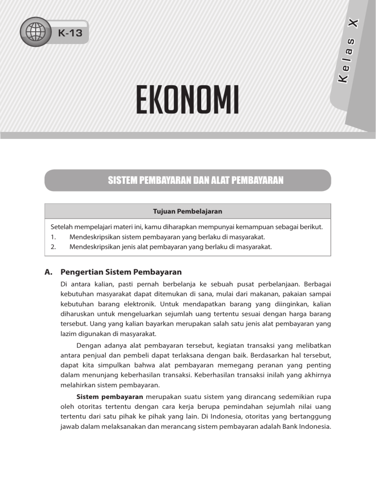 X ekonomi SISTEM PEMBAYARAN DAN ALAT PEMBAYARAN Tujuan Pembelajaran Setelah mempelajari materi ini, kamu diharapkan mempunyai kemampuan sebagai berikut. 1. Mendeskripsikan sistem pembayaran yang berlaku di masyarakat. 2. Mendeskripsikan jenis alat pembayaran yang berlaku di masyarakat. A. Pengertian Sistem Pembayaran Di antara kalian, pasti pernah berbelanja ke sebuah pusat perbelanjaan. Berbagai kebutuhan masyarakat dapat ditemukan di sana, mulai dari makanan, pakaian sampai kebutuhan barang elektronik. Untuk mendapatkan barang yang diinginkan, kalian diharuskan untuk mengeluarkan sejumlah uang tertentu sesuai dengan harga barang tersebut. Uang yang kalian bayarkan merupakan salah satu jenis alat pembayaran yang lazim digunakan di masyarakat. Dengan adanya alat pembayaran tersebut, kegiatan transaksi yang melibatkan antara penjual dan pembeli dapat terlaksana dengan baik. Berdasarkan hal tersebut, dapat kita simpulkan bahwa alat pembayaran memegang peranan yang penting dalam menunjang keberhasilan transaksi. Keberhasilan transaksi inilah yang akhirnya melahirkan sistem pembayaran. Sistem pembayaran merupakan suatu sistem yang dirancang sedemikian rupa oleh otoritas tertentu dengan cara kerja berupa pemindahan sejumlah nilai uang tertentu dari satu pihak ke pihak yang lain. Di Indonesia, otoritas yang bertanggung jawab dalam melaksanakan dan merancang sistem pembayaran adalah Bank Indonesia. Kela s K-13 Bank Indonesia memiliki peran sebagai operator, regulator, dan pengguna sistem pembayaran baik dalam bentuk sistem pembayaran tunai maupun nontunai. Selain bank sentral, pihak lain yang mendukung kelancaran sistem pembayaran ini adalah bank umum atau bank komersial. Komponen yang membentuk terciptanya sistem pembayaran adalah sebagai berikut. 1. Payment Instruments atau Alat Pembayaran Setiap jenis transaksi memerlukan alat pembayaran yang memenuhi standar fisik, hukum, dan peraturan baik dalam bentuk alat pembayaran tunai maupun nontunai. Alat pembayaran tunai contohnya adalah uang, sementara alat pembayaran nontunai contohnya adalah kartu kredit. 2. Interbank Fund Transfer System atau Sistem Transfer Dana Antarbank Sistem ini memungkinkan terjadinya pemindahan dana dari bank yang satu ke bank yang lain. Faktor penting yang memengaruhi pengoperasian sistem transfer antarbank adalah penggunaan teknologi informasi. Di Indonesia sistem ini dikenal dengan sistem pengolahan data elektronik dan telekomunikasi yang disebut Real Time Gross Settlement (RTGS). RTGS adalah proses penyelesaian akhir transaksi (settlement) pembayaran yang dilakukan per transaksi dan bersifat real time. Melalui mekanisme BI-RTGS, rekening peserta dapat didebit dan dikredit berkali-kali dalam sehari sesuai dengan perintah pembayaran dan penerimaan pembayaran. 3. Payment Systems Operators atau Lembaga yang Memproses Sistem Pembayaran Di Indonesia, lembaga yang dapat menjadi operator teknis dalam proses sistem pembayaran adalah Bank Indonesia, PT Kustodian Sentral Efek Indonesia (KSEI) untuk transaksi keuangan di pasar modal, dan switching atau Penyelenggara Kliring Alat Pembayaran Menggunakan Kartu (APMK). 4. Delivery Channel atau Saluran Pembayaran Beberapa saluran pembayaran yang digunakan dalam sistem pembayaran di Indonesia di antaranya kartu debit, kartu kredit, teller input, mesin ATM, mobile banking, internet banking, phone banking, dan electronic data capturing (EDC). B. Peranan Sistem Pembayaran Dalam perekonomian, sistem pembayaran memberikan peranan yang penting adalah sebagai berikut. 2 1. Menjamin kelancaran pasar sebagai tempat transaksi. 2. Membantu menentukan efisiensi transaksi yang dilakukan dan diselesaikan. 3. Memengaruhi tingkat laju pertumbuhan ekonomi dan efisiensi pasar keuangan. 4. Mendorong mobilitas aliran dana secara lebih cepat melalui layanan sistem pembayaran yang lebih beragam. Sistem pembayaran modern yang didukung oleh teknologi informasi memang memberikan kemudahan, kecepatan, dan kelancaran transaksi. Akan tetapi, keberhasilannya sangat ditentukan pada keandalan infrastruktur jaringan komunikasi. Kinerja yang kurang baik atas jaringan komunikasi dapat menimbulkan sejumlah risiko, mulai dari risiko operasional yang berpotensi memperlambat mekanisme settlement dana, risiko likuiditas karena pihak yang berutang tidak dapat memenuhi kewajiban pada waktunya, hingga risiko sistemik yang dapat menggoncang stabilitas sistem keuangan. Risiko-risiko tersebut menjadi tanggung jawab penyelenggara sistem pembayaran. Di sinilah tanggung jawab Bank Indonesia sebagai bank sentral yang menyelenggarakan sistem pembayaran. Bank Indonesia memiliki tujuan untuk menjaga stabilitas nilai tukar rupiah dengan mengatur dan menjaga kelancaran Sistem Pembayaran Nasional (SPN). Bank sentral adalah satu-satunya lembaga yang berhak mengeluarkan dan mengedarkan alat pembayaran tunai seperti uang rupiah. Selain itu, dalam menjalankan perannya sebagai operator, regulator, dan pengguna sistem pembayaran, Bank Indonesia memiliki kewajiban yaitu sebagai berikut. 1. Merumuskan dan menetapkan kebijakan dalam bentuk regulasi atau bentuk lainnya. 2. Memberikan izin penyelenggaraan sistem pembayaran. 3. Konsultasi dan fasilitasi penyelenggaraan sistem pembayaran. 4. Pengawasan (oversight) terutama kepada penyelenggara sistem pembayaran untuk menilai kesesuaian sistem yang dikelolanya dengan kebijakan-kebijakan Bank Indonesia di bidang sistem pembayaran. 5. Sosialisasi dan edukasi sistem pembayaran kepada masyarakat luas. Selain menyelenggarakan sistem pembayaran tunai, Bank Indonesia juga bertanggung jawab dalam penyediaan sistem pembayaran nontunai. Transaksi pembayaran nontunai dengan nilai yang besar diselenggarakan Bank Indonesia melalui sistem BI-RTGS (Real Time Gross Settlement) dan sistem kliring. Sejak dioperasikan oleh Bank Indonesia pada tanggal 17 November 2000, BI-RTGS berperan penting dalam memproses aktivitas transaksi pembayaran, khususnya untuk memproses transaksi pembayaran yang termasuk high value payment sy