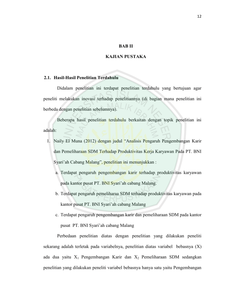 12 BAB II KAJIAN PUSTAKA 2.1. Hasil-Hasil Penelitian Terdahulu Didalam penelitian ini terdapat penelitian terdahulu yang bertujuan agar peneliti melakukan inovasi terhadap penelitiannya (di bagian mana penelitian ini berbeda dengan penelitian sebelumnya). Beberapa hasil penelitian terdahulu berkaitan dengan topik penelitian ini adalah: 1. Naily El Muna (2012) dengan judul “Analisis Pengaruh Pengembangan Karir dan Pemeliharaan SDM Terhadap Produktivitas Kerja Karyawan Pada PT. BNI Syari’ah Cabang Malang”, penelitian ini menunjukkan : a. Terdapat pengaruh pengembangan karir terhadap produktivitas karyawan pada kantor pusat PT. BNI Syari’ah cabang Malang. b. Terdapat pengaruh pemeliharaa SDM terhadap produktivitas karyawan pada kantor pusat PT. BNI Syari’ah cabang Malang c. Terdapat pengaruh pengembangan karir dan pemeliharaan SDM pada kantor pusat PT. BNI Syari’ah cabang Malang Perbedaan penelitian diatas dengan penelitian yang dilakukan peneliti sekarang adalah terletak pada variabelnya, penelitian diatas variabel bebasnya (X) ada dua yaitu X1 Pengembangan Karir dan X2 Pemeliharaan SDM sedangkan penelitian yang dilakukan peneliti variabel bebasnya hanya satu yaitu Pengembangan 13 karir. Sedangkan variabel terikatnya (Y) pada penelitian diatas adalah Produktivitas Kerja Karywan dan penelitian saat ini variabel terikatnya (Y) adalah Kinerja karyawan. Persamaan penelitian diatas dengan penelitian yang dilakukan peneliti adalah sama-sama meneliti tentang pengembangan karir, dan juga menggunakan metode penelitian yang sama yaitu metode kuantitatif. 2. Puji Isyanto, Sungkono dan Cynthia Desriani (2013) dengan judul “ Pengaruh Pengembangan Karir Terhadap Motivasi Kerja Karyawan Pada PT. Excel Utama Indonesia Karawang”, penelitian ini menunjukkan: (Jurnal.feunsika.) a. Pengembangan karir di PT. Excel Utama Indonesia Karawang, kebanyakan menyatakan baik terhadap pengembangan karir berdasarkan pendidikan formal, pengalaman kerja, prestasi kerja, keterampilan kerja, produktivitas kerja, penaikan jabatan, peningkatan karir, pelatihan karyawan, jenjang karir, dan perencanaan kerja. b. Motivasi kerja yang diberikan PT. Excel Utama Indonesia Karawang umumnya karyawan menilai baik terhadap motivasi yang diberikan berdasarkan pemberian gaji, tunjangan makan dan minum, tunjangan kesehatan,jaminan tenaga kerja, tunjangan perumahan, tunjangan pensiun, hubungan rekan kerja, hubungan dengan atasan, kerja sama kelompok, pemberian bonus, pemberian penghargaan, kenaikan gaji, promosi jabatan, kebebasan pendapat, penilaian dan kritik. 14 c. Pengembangan karir berpengaruh positif dan signifikan (α=5%) terhadap motivasi kerja karyawan PT. Excel Utama Indonesia Karawang, dengan nilai koefisien determinasi sebesar 49% artinya pengaruh pengembangan karyawan terhadap motivasi kinerja adalah 49%, sedangkan sisanya 51 % di pengaruhi oleh faktor-faktor lain yang tidak di teliti dalam penelitian ini. Perbedaan penelitian diatas dengan penelitian yang dilakukan peneliti adalah terletak pada variabel terikat (Y), pada penelitian diatas variabel terikat (Y) adalah Motivasi Karyawan dan penelitian saat ini variabel terikatnya (Y) adalah Kinerja karyawan. Perbedaan yang lain antara penelitian diatas dengan penelitian yang dilakukan peneliti adalah metode penelitiannya, penelitian diatas menggunakan dua metode analisis yaitu analisis kuantitatif dan analisis deskriptif verifikatif sedangkan penelitian yang dilakukan peneliti hanya menggunakan metode analisis kuantitatif. Persamaan penelitian diatas dengan penelitian yang dilakukan peneliti adalah sama-sama meneliti tentang pengembangan karir. 3. Mawarni, Iskandarsyah Madjid, dan Fachrurrazi Zamzami (2012) dengan judul “Pengaruh Iklim Organisasi Dan Pengembangan Karir Terhadap Kinerja Pegawai Dinas Sosial Aceh”. Penelitian ini menunjukkan: a. Hasil penelitian menunjukkan bahwa variabel iklim organisasi diperoleh nilai koefisien regresi sebesar 0.211, kemudian variabel pengembangan karir diperoleh nilai koefisien regresi sebesar 0.087. b. Berdasarkan hasil penelitian menunjukkan bahwa secara parsial iklim organisasi berpengaruh terhadap peningkatan kinerja pegawai pada Dinas 15 Sosial Aceh, dengan nilai thitung sebesar 5.912 dan ttabel = 1.984 dengan tingkat signifikansi sebesar 0.000. c. Hasil penelitian juga menunjukkan bahwa secara parsial variabel pengembangan karir berpengaruh terhadap peningkatan kinerja pegawai pada Dinas Sosial Aceh, dengan nilai thitung sebesar 2.387 dan ttabel = 1.984 dengan tingkat signifikansi sebesar 0.000. d. Sedangkan hasil pengujian berdasarkan uji-F (simultan) diperoleh nilai Fhitung sebesar 53.702, sedangkan Ftabel sebesar 3.085, hal ini menunjukkan bahwa secara bersama-sama variabel iklim organisasi dan pengembangan karir mempunyai pengaruh yang signifikan terhadap peningkatan kinerja pegawai pada Dinas Sosial Aceh. Perbedaan penelitian diatas dengan penelitian yang dilakukan peneliti sekarang adalah terletak pada variabelnya, penelitian diatas variabel bebasnya (X) ada dua yaitu X1 Iklim Organisasi dan X2 Pengembangan Karir sedangkan penelitian yang dilakukan peneliti variabel bebasnya hanya satu yaitu Pengembangan karir. Kesamaan penelitian yang peneliti lakukan dengan penelitian tersebut diatas adalah bahwa penelitian tersebut sama– sama menggunakan variabel dependennya, yaitu kinerja pegawai dan persamaan penelitian yang dilakukan peneliti dengan penelitian diatas adalah metode penelitiannya yaitu sama-sama menggunakan metode kuantitatif. Hasil-hasil penelitian terdahulu dapat dirangkum dalam matrik table (teoritical mapping) sebagai berikut: 16 No 1. 1. Tabel 2.1 Matrik Table Penelitian Terdahulu Judul Penelitian, Variabel Metode Hasil Penelitian Nama Peneliti, Penelitian Tahun Analisis Pengaruh Variabel bebas Dalam Terdapat pengaruh Pengembangan penelitian ini (X) dalam pengembangan karir Karir dan penelitian ini menggunakan terhadap produktivitas Pemeliharaan metode ada dua yaitu: karyawan pada kantor pusat SDM Terha
