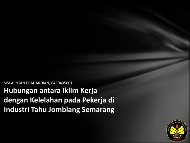 SISKA INTAN PRAHARDIAN, 6450405001 Hubungan antara Iklim Kerja dengan Kelelahan pada Pekerja di Industri Tahu Jomblang Semarang Identitas Mahasiswa - NAMA : SISKA INTAN PRAHARDIAN - NIM : 6450405001 - PRODI : Kesehatan Masyarakat - JURUSAN : Ilmu Kesehatan Masyarakat - FAKULTAS : Ilmu Keolahragaan - EMAIL : intan_keboo pada domain yahoo.co.id - PEMBIMBING 1 : Drs. Herry Koesyanto, MS - PEMBIMBING 2 : dr. Mahalul Azam, M.Kes - TGL UJIAN : 2011-01-24 Judul Hubungan antara Iklim Kerja dengan Kelelahan pada Pekerja di Industri Tahu Jomblang Semarang Abstrak Abstrak belum ditemukan Terima Kasih http://unnes.ac.id