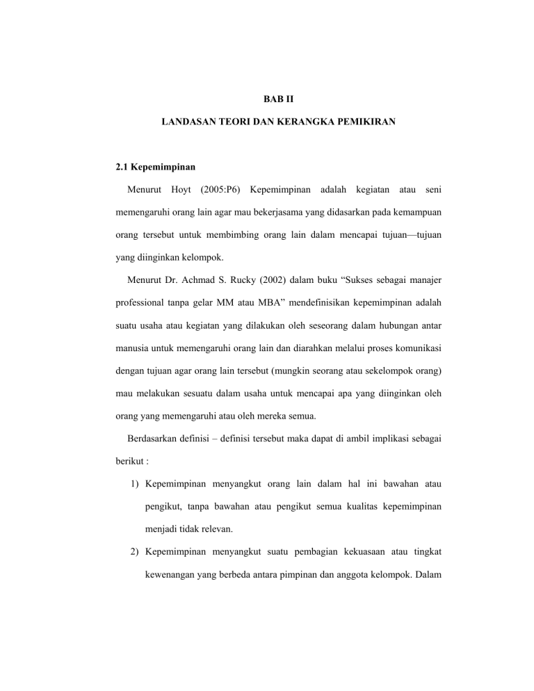 BAB II LANDASAN TEORI DAN KERANGKA PEMIKIRAN 2.1 Kepemimpinan Menurut Hoyt (2005:P6) Kepemimpinan adalah kegiatan atau seni memengaruhi orang lain agar mau bekerjasama yang didasarkan pada kemampuan orang tersebut untuk membimbing orang lain dalam mencapai tujuan—tujuan yang diinginkan kelompok. Menurut Dr. Achmad S. Rucky (2002) dalam buku “Sukses sebagai manajer professional tanpa gelar MM atau MBA” mendefinisikan kepemimpinan adalah suatu usaha atau kegiatan yang dilakukan oleh seseorang dalam hubungan antar manusia untuk memengaruhi orang lain dan diarahkan melalui proses komunikasi dengan tujuan agar orang lain tersebut (mungkin seorang atau sekelompok orang) mau melakukan sesuatu dalam usaha untuk mencapai apa yang diinginkan oleh orang yang memengaruhi atau oleh mereka semua. Berdasarkan definisi – definisi tersebut maka dapat di ambil implikasi sebagai berikut : 1) Kepemimpinan menyangkut orang lain dalam hal ini bawahan atau pengikut, tanpa bawahan atau pengikut semua kualitas kepemimpinan menjadi tidak relevan. 2) Kepemimpinan menyangkut suatu pembagian kekuasaan atau tingkat kewenangan yang berbeda antara pimpinan dan anggota kelompok. Dalam hal ini, pemimpin mempunyai wewenang dalam mengarahkan pekerjaan untuk tercapainya tujuan. 3) Pemimpin harus mampu mengendalikan orang – orang dalam organisasi agar perilaku mereka sesuai dengan perilaku yang di inginkan oleh pemimpin. Kepemimpinan yang baik menggerakkan orang pada suatu arah yang benar – benar merupakan tujuan jangka panjang mereka. Tidak menyia – nyiakan sumber daya yang berharga dan memberdayakan seluruh potensi yang ada tanpa meng eksploitasi SDM yang ada. 2.1.1 Gaya Kepemimpinan Menurut John Back dan Neil Yager dalam Moeljono (2008;P.33) ada 4 gaya kepemimpinan yang lazim disebut sebagai kepemimpinan situasional berdasarkan interaksi antara direction dengan support dengan deskripsi sebagai berikut : 1) Telling (Directing atau structuring) Seorang pemimpin yang senang mengambil keputusan sendiri dengan memberikan instruksi yang jelas dan mengawasinya secara ketat serta memberikan penilaian kepada mereka yang tidak melaksanakannya sesuai dengan apa yang dia harapkan. 2) Selling (Coaching) Seorang pemimpin yang mau melibatkan bawahan dalam pembuatan suatu keputusan. Pemimpin bersedia membagi persoalan dengan bawahannya dan sebaliknya persoalan dari bawahan selalu didengarkan serta memberikan pengarahan mengenai apa yang seharusnya dikerjakan. 3) Patricipating (Developing atau encouraging) Salah satu ciri dari kepemimpinan ini adalah kesedian dari pemimpin untuk memberi kesempatan bawahan untuk berkembang dan bertanggung jawab serta memberikan dukungan sepenuhnya mengenai apa yang mereka perlukan. 4) Delegating (Delegasi) Dalam gaya kepemimpinan ini, pemimpin banyak memberikan tanggung jawab kepada bawahan dan memberikan kesempatan kepada mereka untuk memecahkan permasalahan. 2.1.2 Kelebihan dan kekurangan masing-masing gaya kepemimpinan Setiap gaya kepemimpinan tentunya memiliki nilai lebih dan kekurangan masing-masing, berikut ini adalah kekurangan dan kelebihannya dimasukan dalam table 2.1 Table 2.1 Kelebihan dan kekurangan gaya kepemimpinan Kelebihan Telling Kejelasan Kekurangan tentang apa yang Selalu ingin mendominasi diinginkan, kapan keinginan itu seluruh permasalahan sehingga harus dilaksanakan bagaimana caranya dan ide dan gagasan bawahan tidak berkembang. Semua persoalan akan bermuara kepada pemimpin sehingga mengundang unsur ketergantungan yang tinggi kepadanya Selling Adanya keterlibatan dalam memecahkan bawahan Tidak tercapainya efisiensi yang suatu tinggi dalam proses pengambilan masalah sehingga mengurangi keputusan unsur ketergantungan pemimpin. kepada Keputusan yang dibuat akan lebih mewakili tim dari pada pribadi Participacing Adanya kemampuan yang tinggi Diperlukannya waktu yang lebih dari pemimpin menciptakan untuk banyak suasana menyenangkan dalam proses yang pengambilan sehingga Pemimpin keputusan. harus selalu bawahan merasa senang, baik menyediakan waktu yang banyak dalam menyampaikan masalah untuk berdiskusi dengan bawahan maupun hal-hal lain yang tidak dapat mereka putuskan. selalu memberikan Pemimpin kesempatan kepada bawahan untuk dapat berkembang Delegating Terciptanya sikap memiliki dari Saat bawahan memerlukan bawahan atas semua tugas yang keterlibatan pemimpin maka ada diberikan. Pemimpin lebih kecenderungan merasa santai sehingga memiliki mengembalikan waktu yang cukup untuk kepada bawahan Ia akan persoalannya meskipun memikirkan hal-hal lain yang sebenarnya itu tugas pimpinan memerlukan perhatian lebih banyak 2.2 Budaya Organisasi Menurut David C. Thomas dan Kerr inkson dalam Wibowo (2010;P.15) menyatakan bahwa budaya terdiri dari Mental Program bersama yang mensyaratkan respons individual pada lingkungannya. Definisi tersebut mengandung makna bahwa kita melihat budaya dalam perilaku sehari-hari, tetapi dikontrol oleh mental program yang ditanamkan sangat dalam. Budaya bukan hanya perilaku di permukaan, tetapi sangat dalam ditanamkan dalam diri kita masing- masing karyawan. Menurut Wibowo (2010;P.19) budaya organisasi adalah filosofi dasar organisasi yang memuat keyakinan, norma-norma, dan nilai bersama yang menjadi karakteristik inti tentang bagaimana cara melakukan sesuatu dalam organisasi. 2.2.1 Karakteristik Budaya Organisasi Budaya organisasi dalam suatu organisasi yang satu dapat berbeda dengan organisasi yang lain. Namun budaya organisasi menunjukan ciri-ciri, sifat, atau karakteristik tertentu yang menunjukan kesamaannya. Menurut Robbins (2008), ada 7 ciri-ciri budaya organisasi, yaitu : 1. Inovasi dan pengambilan resiko. Sejauh mana karyawan didukung untuk menjadi inovatif dan berani mengambil resiko. 2. Perhatian terhadap detail. Sejauh mana karyawan diharapkan dapat menunjukkan kecermatan, analisis dan perhatian terhadap detail. 3. Orientasi hasil. Sejauh mana manajemen memfokuskan pada hasil bukannya pada teknik dan proses yang digunakan untuk mencapai hasil ter