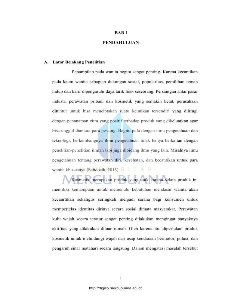 BAB I PENDAHULUAN A. Latar Belakang Penelitian Penampilan pada wanita begitu sangat penting. Karena kecantikan pada kaum wanita sebagian dukungan sosial, popularitas, pemilihan teman hidup dan karir dipengaruhi daya tarik fisik seseorang. Persaingan antar pasar industri perawatan pribadi dan kosmetik yang semakin ketat, perusahaan dituntut untuk bisa menciptakan suatu keunikan tersendiri yang diiringi dengan penanaman citra yang positif terhadap produk yang dikeluarkan agar bisa unggul diantara para pesaing. Begitu pula dengan ilmu pengetahuan dan teknologi, berkembangnya ilmu pengetahuan tidak hanya berkaitan dengan penelitian-penelitian ilmiah tapi juga dibidang ilmu yang lain. Misalnya ilmu pengetahuan tentang perawatan diri, kesehatan, dan kecantikan untuk para wanita khususnya (Sabdosih, 2013). Kosmetik merupakan produk yang unik karena selain produk ini memiliki kemampuan untuk memenuhi kebutuhan mendasar wanita akan kecanrtikan sekaligus seringkali menjadi sarana bagi konsumen untuk memperjelas identitas dirinya secara sosial dimata masyarakat. Perawatan kulit wajah secara teratur sangat penting dilakukan mengingat banyaknya aktifitas yang dilakukan diluar rumah. Oleh karena itu, diperlukan produk kosmetik untuk melindungi wajah dari asap kendaraan bermotor, polusi, dan pengaruh sinar matahari secara langsung. Dalam mengatasi masalah tersebut 1 http://digilib.mercubuana.ac.id/ 2 setiap orang selalu mencari produk yang sesuai dengan jenis kulit dan terbaik untuk dirinya. Hal ini dilihat dari sisi bisnis oleh para produsen produk kecantikan, dimana banyaknya perusahaan-perusahaan yang menghasilkan produk-produk yang sejenis, maka konsumen memiliki banyak peluang untuk memilih produk yang dibutuhkan yang sesuai dengan apa yang diinginkan (Bafna, 2016) Saat ini penggunaan kosmetik di Indonesia tergolong berkembang pesat. Hal ini terbukti dari semakin meningkatnya konsumsi kosmetik setiap tahunnya. Berdasarkan data Kementerian Perindustrian, penjualan kosmetik pada tahun 2015 meningkat 9% menjadi Rp 64,3 triliun dibanding sebelumnya tahun 2014 sebesar Rp 59,03 triliun, menurut perhitungan data duniaindustri.com. pertumbuhan tersebut dikategorikan relative tinggi seiring perlambatan perekonomian sosial (www.duniaindustri.com). Agar produk yang ditawarkan pemasar melalui media iklan memiliki daya tarik bagi calon konsumen, maka diperlukannya dukungan dari bintang iklan (celebrity endorser) sebagai penyampai pesan atau iklan. Celebrity endorsement merupakan bagian penting dari suatu kampanye pemasaran produk. Kredibilitas endorser positif dapat mengembangkan sikap positif terhadap iklan yang mengarah untuk membangun sikap terhadap merek yang akan menyebabkan keinginan lebih besar untuk membangun niat beli yang positif (Shanmugan Joghee dan Sajal Kabiraj, 2013). Sebuah penelitian menunjukkan bahwa dibandingkan dengan penggunaan non celebrity endorser, penggunaan celebrity endorser mendapatkan respon yang http://digilib.mercubuana.ac.id/ 3 lebih positif dan intensitas terhadap pembelian yang lebih tinggi. Penjualan akan meningkat dengan adanya penggunaan celebrity endorser yang menarik konsumen (Byrne & Breen dalam Abedniya, Hakim dan Zaeim, 2011). Dalam menerapkan bauran pemasaran, kualitas dari sebuah produk harus sesuai dengan yang telah dijanjikan. Menurut Kotler dan Keller (2009), kualitas produk adalah totalitas fitur dan karakteristik produk atau jasa yang bergantung pada kemampuannya untuk memuaskan kebutuhan yang dinyatakan atau tersirat. Kualitas produk yang diinginkan oleh konsumen menyangkut manfaatnya bagi pemenuhan kebutuhan dan keamanannya bagi diri konsumen, sehingga konsumen merasa tenang lahir dan batin dalam menggunakan produk tersebut. Untuk memenuhi keinginan konsumen agar tenang lahir dan batin dalam mengkonsumsi produk, perusahaan harus memberitahukan manfaat produk dan cara penggunaannya. Demi memenuhi kebutuhan pelanggannya, perusahaan harus selalu memperbarui produk lama dengan memunculkan produk-produk baru dan juga memperbaiki kualitasnya ke arah yang semakin baik. Apabila produk dianggap berkualitas di mata konsumen, maka produk itu akan selalu dicari. Konsumen memberikan penilaian pada suatu produk setelah konsumen mencoba untuk menggunakan suatu produk. Lalu konsumen bisa menilainya dari segi kualitas produk. Dengan ini diduga bahwa dari sisi kualitas kosmetik Wardah sudah mengetes di labolatorium Badan Pengawas Obat dan Makanan (Badan POM). Sehingga kualitas produk yang terdapat pada kosmetik Wardah dapat menarik minat konsumen untuk membeli kembali http://digilib.mercubuana.ac.id/ 4 produk tersebut. Perolehan sertifikasi CPKB (Cara Pembuatan Kosmetika yang Baik) tahun 2005 oleh Badan Pengawasan Obat dan Makanan (BPOM), serta Halal Award untuk kategori Brand Kosmetik Halal pada tahun 2011 berhasil menciptakan mindset di benak konsumen menjadi brand kosmetik halal (Luki, (2013) & Supriadi, (2014)). Top Brand Index ini disajikan dalam situs online yaitu topbrandaward.com. Top Brand Award merupakan apresiasi terhadap merek yang tergolong sebagai merek teratas (www.topbrand-award.com). Dalam situs ini juga disebutkan bahwa predikat kriteria top dari suatu produk didasarkan pada survei yang dilakukan oleh Kelompok Konsultasi Perbatasan (Frontier Consulting Group). Table 1.1 Top Brand Index Kategori Produk Lipstik Merek TBI (2014) Merek TBI (2015) Wardah 13,0% Wardah 14,9% Revlon 12,6% Revlon 12,8% Sariayu 9,2% Pixy 11,0% Pixy 9,0% Oriflame 7,7% Viva 8,2% Sariayu 7,6% Mirabella 7,8% La Tulipe 7,3% Oriflamme 6,6% La Tulipe 5,3% Sumber: topbrand-award.com (2014-2015) http://digilib.mercubuana.ac.id/ 5 Dari tabel diatas, dapat dilihat bahwa terjadinya peningkatan penjualan kosmetik Wardah yang sedang menguasai pangsa pasar. Hal ini terbukti dari meningkatnya Top Brand Index Wardah dari tahun 2014 sebesar 13,0% menjadi 14,9% pada tahun 2015 untuk kategori produk lipstik. Dibandingkan dengan merek kosmetik lainnya. Kosmetik Wardah termasuk sukses di pangsa pasar kosmeti