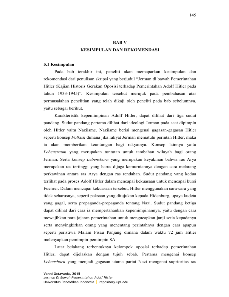 145 BAB V KESIMPULAN DAN REKOMENDASI 5.1 Kesimpulan Pada bab terakhir ini, peneliti akan memaparkan kesimpulan dan rekomendasi dari penulisan skripsi yang berjudul “Jerman di bawah Pemerintahan Hitler (Kajian Historis Gerakan Oposisi terhadap Pemerintahan Adolf Hitler pada tahun 1933-1945)”. Kesimpulan tersebut merujuk pada pembahasan atas permasalahan penelitian yang telah dikaji oleh peneliti pada bab sebelumnya, yaitu sebagai berikut. Karakteristik kepemimpinan Adolf Hitler, dapat dilihat dari tiga sudut pandang. Sudut pandang pertama dilihat dari ideologi Jerman pada saat dipimpin oleh Hitler yaitu Naziisme. Naziisme berisi mengenai gagasan-gagasan Hitler seperti konsep Folkish dimana jika rakyat Jerman mematuhi perintah Hitler, maka ia akan memberikan keuntungan bagi rakyatnya. Konsep lainnya yaitu Lebensraum yang merupakan tuntutan untuk tambahan wilayah bagi orang Jerman. Serta konsep Lebensborn yang merupakan keyakinan bahwa ras Arya merupakan ras tertinggi yang harus dijaga kemurniannya dengan cara melarang perkawinan antara ras Arya dengan ras rendahan. Sudut pandang yang kedua terlihat pada proses Adolf Hitler dalam mencapai kekuasaan untuk mencapai kursi Fuehrer. Dalam mencapai kekuasaan tersebut, Hitler menggunakan cara-cara yang tidak seharusnya, seperti paksaan yang ditujukan kepada Hidenburg, upaya kudeta yang gagal, serta propaganda-propaganda tentang Nazi. Sudut pandang ketiga dapat dilihat dari cara ia mempertahankan kepemimpinannya, yaitu dengan cara mewajibkan para jajaran pemerintahan untuk mengucapkan janji setia kepadanya serta menyingkirkan orang yang menentang perintahnya dengan cara apapun seperti peristiwa Malam Pisau Panjang dimana dalam waktu 72 jam Hitler melenyapkan pemimpin-pemimpin SA. Latar belakang terbentuknya kelompok oposisi terhadap pemerintahan Hitler, dapat dijelaskan dengan tujuh sebab. Pertama mengenai konsep Lebensborn yang menjadi gagasan utama partai Nazi mengenai suprioritas ras Vanni Octavania, 2015 Jerman Di Bawah Pemerintahan Adolf Hitler Universitas Pendidikan Indonesia | repository.upi.edu 146 Arya. Kedua mengenai penerapan wajib militer oleh Adolf Hitler. Semenjak usia 6 tahun, anak-anak di jerman sudah mulai mengikuti latihan militer. Ketika anak berusia 13 tahun, setiap hari diharuskan melakukan latihan baris-berbaris dan berjalan kaki sejauh 11 mil dan setelah 16 tahun, mereka diwajibkan bergabung dengan Jugenfuehrer (Pemuda Hitler) serta Bund Duetscher Maedel (Liga Gadis Jerman). Selain itu dalam bidang pendidikan, kurikulum sekolah di Jerman disisipkan propaganda-propaganda Nazi. Ketiga mengenai ekspansi Jerman ke wilayah Eropa. Dalam konsep Lebensraum, Jerman membutuhkan tambahan wilayah, oleh karena itu Hitler melancarkan aksinya untuk menaklukan berbagai wilayah di Eropa. Keempat mengenai Kekhawatiran rakyat Jerman atas pendudukan Cekoslovakia yang menandakan bahwa Jerman mengingkari perjanjian Munich. Hal tersebut membuat rakyat takut akan terjadi perang kembali. Kelima mengenai Peristiwa Holocaust yang merupakan implementasi dari konsep Lebensborn yang menganggap bahwa ras Arya merupakan ras yang paling unggul diantara ras lainnya dan harus memusnahkan ras-ras rendah lainnya agar kemurnian ras Arya terjaga. Oleh karena itu, Hitler membuat kamp-kamp konsentrasi yang tersebar di seluruh Jerman dan negara taklukan untuk memusnahkan bangsa Yahudi dan Slavia yang dianggapnya sebagai ras rendahan serta narapidana politik, dan orang-orang yang menentangnya. Keenam mengenai Penyimpangan kebijakan Adolf Hitler dalam peperangan karena ia melanggar ketentuan perang yang menyebutkan melarang melibatkan warga sipil, namun Hitler melanggar larangan tersebut. Ketujuh mengenai konflik antara Abwehr dan Gestapo yang merupakan agen intelijen dari Wehrmacht dan SS. Wehrmacht yang merupakan angkatan bersenjata Jerman menentang upaya militerisasi pasukan SS dengan alasan bahwa SS merupakan pasukan satgas partai Nazi yang hanya melindungi partai bukan negara. Ketujuh hal tersebut melatarbelakangi para perwira dan jenderal AD untuk bergabung menjadi kelompok oposisi dengan tujuan menggulingkan pemerintahan Hitler. Upaya kelompok oposisi dalam menggulingkan pemerintahan Hitler dilakukan pada tahun 1933-1945. Dalam kurun waktu tersebut terdapat enam upaya kudeta dan empat upaya pembunuhan. Upaya kelompok oposisi yang Vanni Octavania, 2015 Jerman Di Bawah Pemerintahan Adolf Hitler Universitas Pendidikan Indonesia | repository.upi.edu 147 pertama dilakukan pada September 1938 dengan cara menyerbu Kantor Kanselir lalu menahan Pemimpin besar SS Heinrich Himmler beserta Kepala Intelijen SS Reinhard Heydrich dan membawa Hitler ke sebuah kastil di Bavaria. Tindakan selanjutnya adalah mengadili Hitler secara terbuka atas kejahatan terhadap negara dan pelanggaran hukum internasional. Kegagalan kudeta disebabkan oleh terjadinya perjanjian Munich yang memperbolehkan Jerman mengambil Sudetenland. Upaya kedua dilakukan pada November 1939. Kelompok oposisi melakukan upaya kudeta dengan cara yang sama dengan upaya kudeta sebelumnya yaitu menyerbu Kantor Kanselir lalu menahan Hitler, Himmler, Goering, Goebbels dan komandan senior SS Sepp Dietrich. Kegagalan kudeta disebabkan oleh kepanikan Halder yang menganggap bahwa Hitler mengetahui tentang upaya kudeta, sehingga Halder ketakutan dan membatalkan kudeta tersebut. Upaya selanjutnya dilakukan dengan berusaha membunuh Hitler yang dilakukan Jenderal Kurt von Hammerstain dengan cara mengundang Hitler untuk memeriksa pertahanan di Barat dan ketika Hitler tiba maka ia segera disergap. Namun hal tersebut gagal karena Hitler tidak menerima undangan Hammerstein. Upaya pembunuhan selanjutnya dilakukan oleh Schulenberg dengan cara menembak Hitler ketika sedang berada di parade militer di Paris pada 1940. Namun kembali gagal karena Hitler mendadak membatalkan hadir pada parade tersebut. Selanjutnya pada tahun 1941 Witzleben melakukan aksi yang sama seperti pada tahun 1940 namun kembali gagal dengan penyebab yang sama. Kem