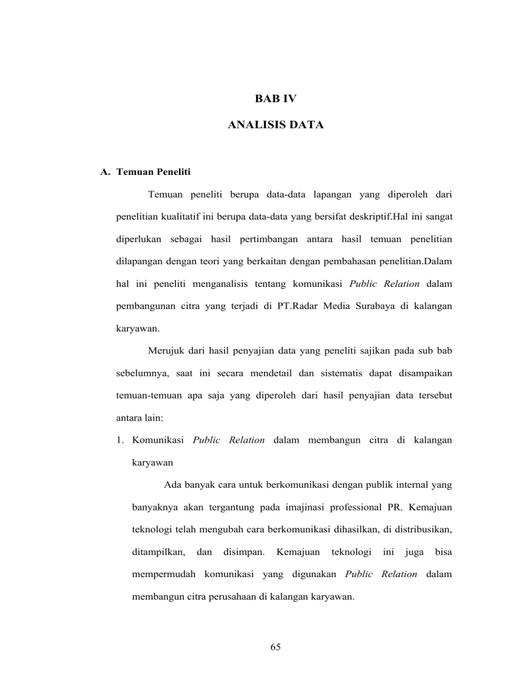 BAB IV ANALISIS DATA A. Temuan Peneliti Temuan peneliti berupa data-data lapangan yang diperoleh dari penelitian kualitatif ini berupa data-data yang bersifat deskriptif.Hal ini sangat diperlukan sebagai hasil pertimbangan antara hasil temuan penelitian dilapangan dengan teori yang berkaitan dengan pembahasan penelitian.Dalam hal ini peneliti menganalisis tentang komunikasi Public Relation dalam pembangunan citra yang terjadi di PT.Radar Media Surabaya di kalangan karyawan. Merujuk dari hasil penyajian data yang peneliti sajikan pada sub bab sebelumnya, saat ini secara mendetail dan sistematis dapat disampaikan temuan-temuan apa saja yang diperoleh dari hasil penyajian data tersebut antara lain: 1. Komunikasi Public Relation dalam membangun citra di kalangan karyawan Ada banyak cara untuk berkomunikasi dengan publik internal yang banyaknya akan tergantung pada imajinasi professional PR. Kemajuan teknologi telah mengubah cara berkomunikasi dihasilkan, di distribusikan, ditampilkan, dan disimpan. Kemajuan teknologi ini juga bisa mempermudah komunikasi yang digunakan Public Relation dalam membangun citra perusahaan di kalangan karyawan. 65 66 a. Proses Membangun Citra perusahaan dikalangan karyawan baru Karyawan Baru adalah orang yang baru masuk dalam suatu perusahaan untuk bekerja, dalam menerima seorang karyawan, perusahaan tidak boleh salah dalam memilih seorang karyawan. Perusahaan harus benar-benar selektif dalam memilih karyawan dan perusahaan telah menyiapkan beberapa tes dalam menyaring calon karyawan, yang pertama berdasarkan kelengkapan persyaratan lamaran kerja, semakin lengkap persyaratannya semakin menunjukkan kalau sang calon karyawan memang benar-benar berniat untuk bergabung dalam perusahaan tersebut. Kemudian yang kedua adalah tes tulis, karena perusahaan harus mengetahui sedalam apa pengetahuan para calon karyawan dalam suatu ilmu dan semua calon karyawan harus mengikutinya agar pihak perusahaan bisa mengetahui sejauh apa pengetahuan sang calon karyawan baru, dan tes yang terakhir adalah tes psikis. Tes ini diperlukan untuk mengetahui tentang psikologi seorang calon karyawan dan karyawan yang telah lolos dalam tahap dua harus mengikuti tahapan ini untuk dapagt bergabung dalam suatu perusahaan. Pembangunan citra perusahaan terjadi ketika para calon karyawan telah menyelesaikan semua tahapan tersebut. Para calon karyawan diajak untun mengenal sedikit tentang perusahaan, agar apabila para karyawan tidak diterima setidaknya dia telah mengetahui 67 perusahaan tersebut mempunyai citra yang bagus, dan apabila mereka diterima maka mereka akan senang sekali bekerja di perusahaan. Pengenalan perusahaan lebih lanjut terjadi ketika para karyawan baru telah masuk dalam perusahaan, mereka diajak berkeliling ke seluruh ruangan di perusahaan agar bisa mengenal semua tentang perusahaan dan ketika mengelilingi seluruh ruang di perusahaan, karyawan baru diajak untuk berkenalan dengan semua karyawan yang bekerja di sana agar tidak terjadi kecanggungan apabila meminta tolong. Public Relation atau humas memiliki kemampuan dalam membangun citra atau image organisasi yang akan berkontribusi pada terwujudnya reputasi organisasi atau institusi. Singkat kata, baik buruknya sebuah organisasi bisnis atau institusi juga dipengaruhi seberapa maksimal peran humas.44Public Relation harus bisa maksimal untuk mengenalkan perusahaan pada calon karyawan baru agar terbentuk citra perusahaan yang baik dari karyawan baru. b. Proses Membangun Citra Di Kalangan Karyawan Karyawan yang dimaksud adalah karyawan senior yang memang sudah lebih dari 1 bulan kerja disuatu perusahaan. Diperlukan teknik khusus untuk memmbangun citra di kalangan karyawan memang sudah mengenal seluk beluk perusahaan tersebut. 44 Fitriana Utami Dewi, Publik Speaking: Kunci Sukses Bicara di depan Publik”Teori dan Praktik” (Yogyakarta: Pustaka Pelajar ,2013) 68 Komunikasi verbal sangat diperlukan untuk pembentukan citra perusahaan di kalangan karyawan senior, namun untuk membangun sebuah komunikasi verbal tak semudak yang dibayangkan. Simbol atau pesan verbal atau semua jenis simbol yang menggunakan satu kata atau lebih. Hampir semua rangsangan wicara yang kita sadari termasuk ke dalam kategori pesan verbal disengaja, yaitu usaha-usaha yang dilakukan secara sadar untuk berhubungan dengan orang lain secara sadar. Suatu sistem kode verbal disebut bahasa. Bahasa sangat rentan dengan suatu kesalah pahaman karena disuatu perusahaan bukan hanya memiliki karyawan 1 suku saja atau 1 bahasa saja, di PT. Radar Media Surabaya, para karyawan berasal dari berbagai macam daerah di Indonesia. Koordinasi dan mediasi yang dibutuhkan untuk menghadapi karyawan dewasa ini telah menempatkan staf PR, dengan pengetahuan dan keahlian komunikasinya, ditengah-tengah pengelolaan hubungan internal. Misalnya, mantan pimpinan dan CEO Delta Airlines, Ronald W.Allen yang naik keposisi atas itu dengan menjalankan departemen training dan sumber daya manusia, memandang tugas utamanya adalah sebagai pemberi motivasi dan menanamkan kesetiaan dalam diri karyawan.45 Memang para karyawan saat ini banyak yang cerdas bisa menempatkan 45 dirinya pada pekerjaan masing-masing Linda Grant, “The Ascent of Delta,” Los Angeles Times Magazine (16 Juni 1991) namun 69 koordinasi dan mediasi dari seorang PR lebih dibutuhkan untuk hubungan internal para karyawan. Citra perusahaan memang harus dikomunikasikan dengan baik agar tercipta sebuah tujuan utama PR yaitu sebuah persepsi perusahaan yang baik. Jika masalah citra adalah problem yang nyata, hanya tindakan nyata pula yang akan menolong. Masalah-masalah nyata yang berkaitan dengan kinerja organisasi, yaitu kualitas teknis atau fungsional yang sebenarnya menyebabkan masalah citra. Tindakan internal yang memperbaiki kinerja organisasi dibutuhkan, jika citra yang buruk ingin diperbaiki.46 Memang komunikasi yang tepat harus dilakukan dalam pembentukan citra perusahaan apabila karyawan tidak mengenal perusahaan dengan baik maka akan tercipta 