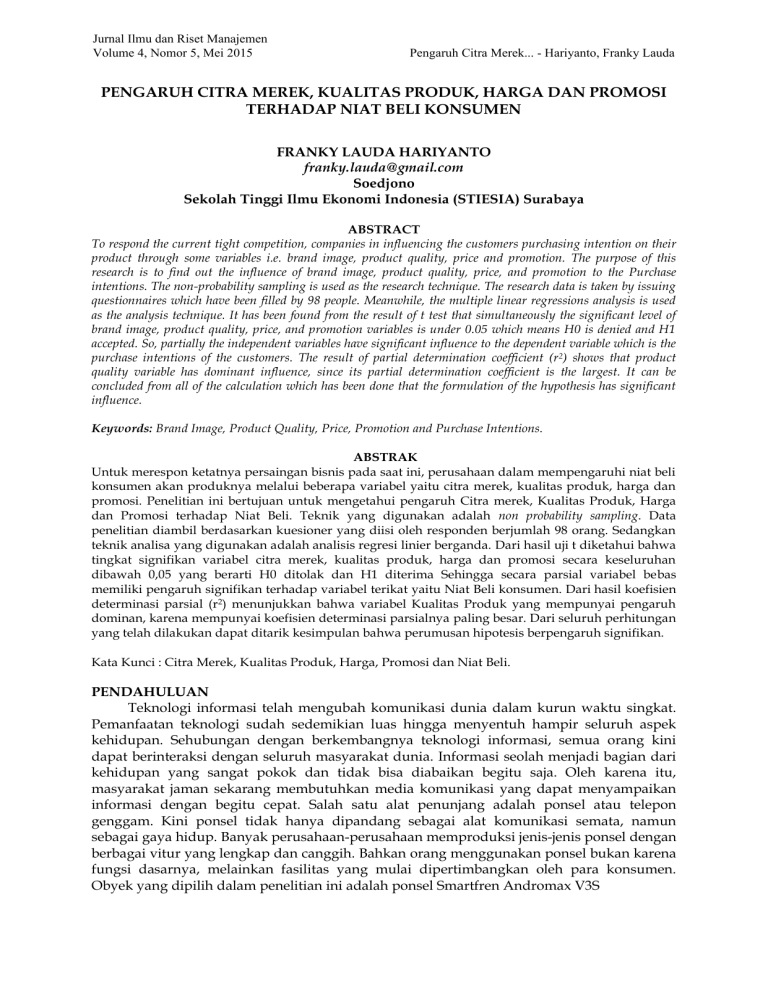 Jurnal Ilmu dan Riset Manajemen Volume 4, Nomor 5, Mei 2015 Pengaruh Citra Merek... - Hariyanto, Franky Lauda PENGARUH CITRA MEREK, KUALITAS PRODUK, HARGA DAN PROMOSI TERHADAP NIAT BELI KONSUMEN FRANKY LAUDA HARIYANTO [email protected] Soedjono Sekolah Tinggi Ilmu Ekonomi Indonesia (STIESIA) Surabaya ABSTRACT To respond the current tight competition, companies in influencing the customers purchasing intention on their product through some variables i.e. brand image, product quality, price and promotion. The purpose of this research is to find out the influence of brand image, product quality, price, and promotion to the Purchase intentions. The non-probability sampling is used as the research technique. The research data is taken by issuing questionnaires which have been filled by 98 people. Meanwhile, the multiple linear regressions analysis is used as the analysis technique. It has been found from the result of t test that simultaneously the significant level of brand image, product quality, price, and promotion variables is under 0.05 which means H0 is denied and H1 accepted. So, partially the independent variables have significant influence to the dependent variable which is the purchase intentions of the customers. The result of partial determination coefficient (r 2) shows that product quality variable has dominant influence, since its partial determination coefficient is the largest. It can be concluded from all of the calculation which has been done that the formulation of the hypothesis has significant influence. Keywords: Brand Image, Product Quality, Price, Promotion and Purchase Intentions. ABSTRAK Untuk merespon ketatnya persaingan bisnis pada saat ini, perusahaan dalam mempengaruhi niat beli konsumen akan produknya melalui beberapa variabel yaitu citra merek, kualitas produk, harga dan promosi. Penelitian ini bertujuan untuk mengetahui pengaruh Citra merek, Kualitas Produk, Harga dan Promosi terhadap Niat Beli. Teknik yang digunakan adalah non probability sampling. Data penelitian diambil berdasarkan kuesioner yang diisi oleh responden berjumlah 98 orang. Sedangkan teknik analisa yang digunakan adalah analisis regresi linier berganda. Dari hasil uji t diketahui bahwa tingkat signifikan variabel citra merek, kualitas produk, harga dan promosi secara keseluruhan dibawah 0,05 yang berarti H0 ditolak dan H1 diterima Sehingga secara parsial variabel bebas memiliki pengaruh signifikan terhadap variabel terikat yaitu Niat Beli konsumen. Dari hasil koefisien determinasi parsial (r2) menunjukkan bahwa variabel Kualitas Produk yang mempunyai pengaruh dominan, karena mempunyai koefisien determinasi parsialnya paling besar. Dari seluruh perhitungan yang telah dilakukan dapat ditarik kesimpulan bahwa perumusan hipotesis berpengaruh signifikan. Kata Kunci : Citra Merek, Kualitas Produk, Harga, Promosi dan Niat Beli. PENDAHULUAN Teknologi informasi telah mengubah komunikasi dunia dalam kurun waktu singkat. Pemanfaatan teknologi sudah sedemikian luas hingga menyentuh hampir seluruh aspek kehidupan. Sehubungan dengan berkembangnya teknologi informasi, semua orang kini dapat berinteraksi dengan seluruh masyarakat dunia. Informasi seolah menjadi bagian dari kehidupan yang sangat pokok dan tidak bisa diabaikan begitu saja. Oleh karena itu, masyarakat jaman sekarang membutuhkan media komunikasi yang dapat menyampaikan informasi dengan begitu cepat. Salah satu alat penunjang adalah ponsel atau telepon genggam. Kini ponsel tidak hanya dipandang sebagai alat komunikasi semata, namun sebagai gaya hidup. Banyak perusahaan-perusahaan memproduksi jenis-jenis ponsel dengan berbagai vitur yang lengkap dan canggih. Bahkan orang menggunakan ponsel bukan karena fungsi dasarnya, melainkan fasilitas yang mulai dipertimbangkan oleh para konsumen. Obyek yang dipilih dalam penelitian ini adalah ponsel Smartfren Andromax V3S Jurnal Ilmu dan Riset Manajemen Volume 4, Nomor 5, Mei 2015 Pengaruh Citra Merek... - Hariyanto, Franky Lauda2 Kebutuhan dasar yang baru ini membuat perusahaan-perusahaan dibidang telekomunikasi membuat produk yang dapat memuaskan keinginan masyarakat. smartphone termasuk salah satu alat telekomunikasi yang saat ini menjadi kebutuhan dasar manusia. Perkembangan teknologi smartphone sangat cepat dengan perbedaan yang terletak pada bentuk, ukuran, serta fasilitasnya. Semakin lama bentuk smartphone semakin menarik dengan ukuran yang bervariasi serta kelengkapan fasilitas yang dimilikinya. Dengan banyaknya merek handphone tersebut memungkinkan konsumen memiliki keleluasaan untuk memilih produk yang sesuai dengan kebutuhan dan kemampuan daya belinya. Didalam niat beli konsumen dalam melakukan pembelian produk smartfren Andromax V3s. Menurut Keller (2008:57) citra merek adalah merupakan persepsi tentang merek yang tercemin dari asosiasi merek yang ada dibenak konsumen. Mengingat persaingan yang sangat tinggi, mendorong industri smartphone untuk melakukan berbagai strategi dalam memenangkan persaingan tersebut. Salah satunya dengan menawarkan kualitas produk, harga dan promosi yang menarik agar mampu menimbulkan niat beli konsumen. Smartfren Andromax V3s memiliki keunggulan di dual sim card yaitu GSM dan CDMA, hiburan dan terdapat ribuan aplikasi yang siap digunakan mulai dari aplikasi yang mendukung pekerjaan sehari-hari, aplikasi gallery foto, aplikasi jejaring sosial, permainan, dan lain-lain, yang memenuhi kebutuhan konsumen. Selain itu Smartfren Andromax merupakan pioneer utama dari smartphone kartu CDMA dengan berbasis android. Salah satu konsep utama dalam pemasaran adalah bauran pemasaran (marketing mix) yang merupakan alat bagi marketer yang terdiri dari berbagai elemen suatu program pemasaran yang perlu dipertimbangkan agar implementasi strategi pemasaan dan positioning yang ditetapkan dapat berjalan dengan sukses. Bauran pemasaran (marketing mix) yang terdiri dari 4P yang meliputi antara lain: l) Produk (Product), adalah merupakan suatu yang ditawarkan ke dalam pasar untuk diperhatikan, 