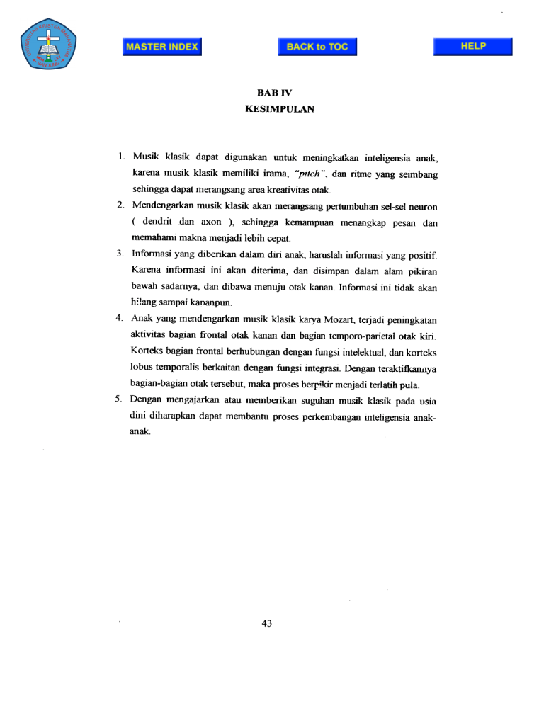 BAB IV KESIMPULAN I. Musik klasik dapat digunakan untuk meningkatkan inteligensia anak, karena musik klasik memiliki irama, "pitch", dan ritme yang seimbang sehingga dapat merangsang area kreativitas otak. 2. Mendengarkan musik klasik akan merangsang pertumbuhan sel-sel neuron ( dendrit .dan axon ), sehingga kemampuan menangkap pesan dan memahami makna menjadi lebih cepat. 3. Informasi yang diberikan dalam diri anak, haruslah informasi yang positif. Karena informasi ini akan diterima, dan disimpan dalam alam pikiran bawah sadamya, dan dibawa menuju otak kanan. Informasi ini tidak akan h:!ang sampai ka!Janpun. 4. Anak yang mendengarkan musik klasik karya Mozart, terjadi peningkatan aktivitas bagian ITontaI otak kanan dan bagian temporo-parietal otak kiri. Korteks bagian frontal berhubungan dengan fungsi intelektual, dan korteks lobus temporalis berkaitan dengan fungsi integrasi. Dengan teraktitkanuya bagian-bagian otak tersebut, maka proses berpikir menjadi terlatih pula. 5. Dengan mengajarkan atau memberikan suguhan musik klasik pada usia dini diharapkan dapat membantu proses perkembangan inteligensia anakanak. 43 BABV SARAN 1. Memberikan infonnasi sebanyak mWIgkin pada orangtua agar anaknya diberi kesempatan WItuk menikmati anugerah yang tersedia dalam musik klasik, sehingga dapat mengoptimalkan kecerdasan I inteligensia yang terdapat dalam diri anak. 2. Menyarankan bagi ibu hamil supaya menyediakan waktunya un.tuk mendengarkan musik klasik, sehingga dapat merangsang pertumbuhan otak janin. 44