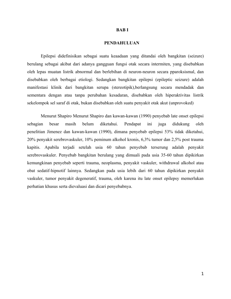 BAB I PENDAHULUAN Epilepsi didefinisikan sebagai suatu keaadaan yang ditandai oleh bangkitan (seizure) berulang sebagai akibat dari adanya gangguan fungsi otak secara intermiten, yang disebabkan oleh lepas muatan listrik abnormal dan berlebihan di neuron-neuron secara pparoksismal, dan disebabkan oleh berbagai etiologi. Sedangkan bangkitan epilepsi (epileptic seizure) adalah manifestasi klinik dari bangkitan serupa (stereotipik),berlangsung secara mendadak dan sementara dengan atau tanpa perubahan kesadaran, disebabkan oleh hiperaktivitas listrik sekelompok sel saraf di otak, bukan disebabkan oleh suatu penyakit otak akut (unprovoked) Menurut Shapiro Menurut Shapiro dan kawan-kawan (1990) penyebab late onset epilepsi sebagian besar masih belum diketahui. Pendapat ini juga didukung oleh penelitian Jimenez dan kawan-kawan (1990), dimana penyebab epilepsi 53% tidak diketahui, 20% penyakit serebrovaskuler, 10% peminum alkohol kronis, 6,3% tumor dan 2,5% post trauma kapitis. Apabila terjadi setelah usia 60 tahun penyebab terserung adalah penyakit serebrovaskuler. Penyebab bangkitan berulang yang dimuali pada usia 35-60 tahun dipikirkan kemungkinan penyebab seperti trauma, neoplasma, penyakit vaskuler, withdrawal alkohol atau obat sedatif-hipnotif lainnya. Sedangkan pada usia lebih dari 60 tahun dipikirkan penyakit vaskuler, tumor penyakit degeneratif, trauma, oleh karena itu late onset epilepsy memerlukan perhatian khusus serta dievaluasi dan dicari penyebabnya. 1 BAB II TINJAUAN PUSTAKA 2.1 Definisi Epilepsi didefinisikan sebagai suatu keaadaan yang ditandai oleh bangkitan (seizure) berulang sebagai akibat dari adanya gangguan fungsi otak secara intermiten, yang disebabkan oleh lepas muatan listrik abnormal dan berlebihan di neuron-neuron secara pparoksismal, dan disebabkan oleh berbagai etiologi. Sedangkan bangkitan epilepsi (epileptic seizure) adalah manifestasi klinik dari bangkitan serupa (stereotipik),berlangsung secara mendadak dan sementara dengan atau tanpa perubahan kesadaran, disebabkan oleh hiperaktivitas listrik sekelompok sel saraf di otak, bukan disebabkan oleh suatu penyakit otak akut (unprovoked) 2.2 Etiologi Penyebab bangkitan berulang yang dimuali pada usia 35-60 tahun dipikirkan kemungkinan penyebab seperti trauma, neoplasma, penyakit vaskuler, withdrawal alkohol atau obat sedatif-hipnotif lainnya. Sedangkan pada usia lebih dari 60 tahun dipikirkan penyakit vaskuler, tumor penyakit degeneratif, trauma, oleh karena itu late onset epilepsy memerlukan perhatian khusus serta dievaluasi dan dicari penyebabnya. Menurut Shapiro Menurut Shapiro dan kawan-kawan (1990) penyebab late onset epilepsi sebagian besar masih belum diketahui. Pendapat ini juga didukung oleh penelitian Jimenez dan kawan-kawan (1990), dimana penyebab epilepsi 53% tidak diketahui, 20% penyakit serebrovaskuler, 10% peminum alkohol kronis, 6,3% tumor dan 2,5% post trauma kapitis. Apabila terjadi setelah usia 60 tahun penyebab terserung adalah penyakit serebrovaskuler. 2.3 Patofisiologi Bangkitan epilepsi disebabkan oleh ketidakseimbangan sekresi maupun fungsi neurotransmiter eksitatorik dan inhibitorik di otak. Keadaan ini bisa disebabkan sekresi neurotransmiter dari presinaptik tidak terkontrol ke sinaptik yang selanjutnya berperan pada 2 reseptor NMDA atau AMPA di post-sinaptik. Keterlibatan reseptor NMDA subtipe dari reseptor glutamat (NMDAR) disebut-sebut sebagai patologi terjadinya kejang dan epilepsi. Secara farmakologik, inhibisi terhadap NMDAR ini merupan prinsip kerja dari obat antiepilepsi. Beberapa penelitian neurogenetik membuktikan adanya beberapa faktor yang bertanggungjawab atas bangkitan epilepsi antara lain kelainan pada ligand-gate (sub unit dari reseptor nikotinik) begitu juga halnya dengan voltage-gate (kanal natrium dan kalium). Hal ini terbukti pada epilepsi lobus frontalis yang ternyata ada hubungannya dengan terjadinya mutasi dari resepotor nikotinik subunit alfa 4.9 Berbicara mengenai kanal ion maka peran natrium, kalium dan kalsium merupakan ion-ion yang berperan dalam sistem komunikasi neuron lewat reseptor. Masuk dan keluarnya ion-ion ini menghasilkan bangkitan listrik yang dibutuhkan dalam komunikasi sesame neuron.9 Jika terjadi kerusakan atau kelainan pada kanal ion-ion tersebut maka bangkitan listrik akan juga terganggu sebagaimana pada penderita epilepsi. Kanal ion ini berperan dalam kerja reseptor neurotransmiter tertentu. Dalam hal epilepsi dikenal beberapa neurotransmiter seperti gamma aminobutyric acid (GABA) yang dikenal sebagai inhibitorik, glutamat (eksitatorik), serotonin (yang sampai sekarang masih tetap dalam penelitian kaitan dengan epilepsi, asetilkholin yang di hipokampus dikenal sebagai yang bertanggungjawab terhadap memori dan proses belajar.2,6 2.4 Klasifikasi Terdapat berbagai cara klasifikasi, klafikikasi yang ditetapkan oleh International League Against Epilepsy (ILAE) terdiri dari jenis klasifikasi, yaitu klasifikasi untuk jenis bangkitan epilepsi dan klasifikasi untuk sindrom, untuk kepentingan klinis, biasanya digunakan kiasifikasi berdasarkan sifat serangan:2,5 Klasifikasi ILAE 1981 untuk tipe bangkitan epilepsy. I. Serangan parsial. 3 A. Serangan sederhana • Dengan manifestasi motorik • Dengan manifestasi sensorik • Dengan manifestasi autonomik • Dengan manifestasi psikik B. Serangan parsial kompleks (dapat diikuti dengan automatisme) • Dengan gambaran parsial sederhana (Al¬A4) pada awalnya, disusul serangan lena (absence) • Dengan serangan lena pada awalnya C. Serangan umum sekunder dengan evolusi dan serangan parsial sederhana/kompleks menjadi serang umum. • Parsial sederhana yang menjadi umum tonik-klonik • Parsial kompleks menjadi umum tonik klonik • Parsial sederhana menjadi parsial kompleks menjadi umum tonik-klonik 2,5 II. Serangan umum A. Serangan lena (petit mal) B. Serangan mioklonik C. Serangan klonik D. Serangan tonik 4 E. Serangan tonik-klonik (grand mal) F. Serangan atonik III. Serangan tak tergolongkan 2.5 Manifestasi Klini