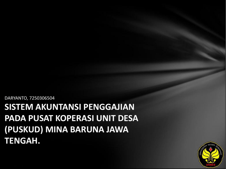 DARYANTO, 7250306504 SISTEM AKUNTANSI PENGGAJIAN PADA PUSAT KOPERASI UNIT DESA (PUSKUD) MINA BARUNA JAWA TENGAH. Identitas Mahasiswa - NAMA : DARYANTO - NIM : 7250306504 - PRODI : Akuntansi - JURUSAN : Akuntansi - FAKULTAS : Ekonomi - EMAIL : acoy_krasak pada domain yahoo.co.id - PEMBIMBING 1 : Bestari Dwi Handayani, SE., M.Si. - PEMBIMBING 2 : - TGL UJIAN : 2011-08-04 Judul SISTEM AKUNTANSI PENGGAJIAN PADA PUSAT KOPERASI UNIT DESA (PUSKUD) MINA BARUNA JAWA TENGAH. Abstrak Daryanto, 2011. Sistem Akuntansi Penggajian pada Pusat Koperasi Unit Desa (PUSKUD) “Mina Baruna” Jawa Tengah. Jurusan Akuntansi D3 Fakultas Ekonomi Universitas Negeri Semarang. Bestari Dwi Handayani, SE., M. Si., 106 hal. Kata Kunci: Sistem, Akuntansi, Penggajian Penggajian karyawan dalam perusahaan adalah masalah yang menyangkut kepuasan karyawan terhadap ketentuan dan kebijakan yang diberikan oleh perusahaan. Sistem penggajian merupakan salah satu faktor yang sangat penting untuk menarik, memelihara, mendorong semangat kerja dan mempertahankan pegawai bagi kepentingan perusahaan atau instansi. Permasalahan dalam penelitian ini adalah bagaimana Sistem Akuntansi Penggajian, dokumen apa saja yang digunakan dalam Sistem Akuntansi Penggajian serta kelemahan dan kelebihan Sistem Akuntansi Penggajian pada PUSKUD Mina Baruna Jawa Tengah? Tujuan penelitian ini adalah untuk mengetahui Sistem Akuntansi Penggajian, dokumen yang digunakan dalam Sistem Akuntansi Penggajian serta mengetahuai kelemahan dan kelebihan Sistem Akuntansi Penggajian pada PUSKUD Mina Baruna Jawa Tengah. Obyek kajian dalam penelitian ini adalah sistem akuntansi penggajian pada Pusat Kata Kunci Sistem, Akuntansi, Penggajian Referensi Terima Kasih http://unnes.ac.id