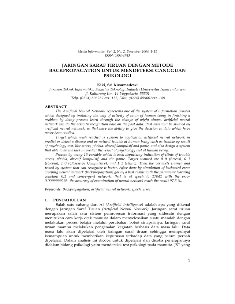 Media Informatika, Vol. 2, No. 2, Desember 2004, 1-11 ISSN: 0854-4743 JARINGAN SARAF TIRUAN DENGAN METODE BACKPROPAGATION UNTUK MENDETEKSI GANGGUAN PSIKOLOGI Kiki, Sri Kusumadewi Jurusan Teknik Informatika, Fakultas Teknologi Industri,Universitas Islam Indonesia Jl. Kaliurang Km. 14 Yogyakarta 55501 Telp. (0274) 895287 ext. 122, Faks. (0274) 895007ext. 148 ABSTRACT The Artificial Neural Network represents one of the system of information process which designed by imitating the way of activity of brain of human being in finishing a problem by doing process learn through the change of wight sinaps. artificial neural network can do the activity recognition base on the past data. Past data will be studied by artificial neural network, so that have the ability to give the decision to data which have never been studied. Target which wish reached is system to application artificial neural network in predict or detect a disease and or natural trouble at human being such as trouble og result of psychology test, like stress, phobia, obsesif kompulsif and panic, and also design a system that able to do the task in predict the result of psychology test at human being. Process by using 13 variable which is each deputizing indication of clinis of trouble stress, phobia, obsesif kompulsif, and the panic. Target wanted are 0 0 (Stress), 0 1 (Phobia), 1 0 (Obsessive Compulsive), and 1 1 (Panic). Then the veriabels trained and tested by system that can recognize it better. After done by simulation of backward error creeping neural network (backpropagation) got by a best result with the parameter learning constant 0.1 and convergent network, that is at epoch to 17041 with the error 0.0099999293. the accuracy of examination of neural network reach the result 97.5 %. Keywords: Backpropagation, artificial neural network, epoch, error. 1. PENDAHULUAN Salah satu cabang dari AI (Artificial Intelligence) adalah apa yang dikenal dengan Jaringan Saraf Tiruan (Artificial Neural Network). Jaringan saraf tiruan merupakan salah satu sistem pemrosesan informasi yang didesain dengan menirukan cara kerja otak manusia dalam menyelesaikan suatu masalah dengan melakukan proses belajar melalui perubahan bobot sinapsisnya. Jaringan saraf tiruan mampu melakukan pengenalan kegiatan berbasis data masa lalu. Data masa lalu akan dipelajari oleh jaringan saraf tiruan sehingga mempunyai kemampuan untuk memberikan keputusan terhadap data yang belum pernah dipelajari. Dalam analisis ini dicoba untuk dipelajari dan dicoba penerapannya didalam bidang psikologi yaitu mendeteksi test psikologi pada manusia. JST yang 1 berupa susunan sel-sel saraf tiruan (neuron) dibangun berdasarkan prinsip-prinsip organisasi otak manusia. Usaha manusia dalam mengembangkan suatu sistem yang meniru kemampuan dan perilaku makhluk hidup telah berlangsung selama beberapa decade belakangan ini. Jaringan saraf tiruan (JST), merupakan hasil perkembangan ilmu dan teknologi yang kini sedang berkembang pesat. JST yang berupa susunan sel-sel saraf tiruan (neuron) dibangun berdasarkan prinsip-prinsip organisasi otak manusia. Perhatian yang besar pada JST disebabkan adanya keunggulan yang dimilikinya seperti kemampuan untuk belajar, komputasi paralel, kemampuan untuk memodelkan fungsi nonlinier dan sifat fault tolerance. Sejak ditemukan pertama kali oleh McCulloch dan Pitts pada tahun 1948, JST telah berkembang pesat dan telah digunakan pada banyak aplikasi. Jaringan saraf tiruan (JST) telah dikembangkan sejak tahun 1940. Belum ada definisi yang baku mengenai JST ini. Teori yang menginspirasi lahirnya sistem jaringan saraf muncul dari bermacam disiplin ilmu: terutama dari neuro science, teknik, dan ilmu komputer, juga dari psikologi, matematika, fisika, dan ilmu bahasa. Ilmuilmu ini bekerja bersama untuk satu tujuan yaitu pengembangan sistem kecerdasan (Dayhoff, 1990) (Kusumadewi, 2002). 2. TUJUAN Pada penelitian ini akan dilakukan studi dan implementasi yang bertujuan untuk mengaplikasikan algoritma jaringan saraf tiruan dengan metode backpropagation dan merancang suatu sistem yang dapat melakukan tugas dalam mendeteksi kondisi psikologi berdasarkan gejala-gejala yang sering terjadi pada manusia. 3. LANDASAN TEORI 3.1 Metode Backpropagation Perambatan galat mundur (backpropagation) adalah sebuah metode sistematik untuk pelatihan multiplayer jaringan saraf tiruan. Metode ini memiliki dasar matematis yang kuat, obyektif dan algoritma ini mendapatkan bentuk persamaan dan nilai koefisien dalam formula dengan meminimalkan jumlah kuadrat galat error melalui model yang dikembangkan (training set) (Brace, 1997). a. Dimulai dengan lapisan masukan, hitung keluaran dari setiap elemen pemroses melalui lapisan luar. b. Hitung kesalahan pada lapisan luar yang merupakan selisih antara data aktual dan target. c. Transformasikan kesalahan tersebut pada kesalahan yang sesuai di sisi masukan elemen pemroses. d. Propagasi balik kesalahan-kesalahan ini pada keluaran setiap elemen pemroses ke kesalahan yang terdapat pada masukan. Ulangi proses ini sampai masukan tercapai. e. Ubah seluruh bobot dengan menggunakan kesalahan pada sisi masukan elemen dan luaran elemen pemroses yang terhubung. 2 Kiki & Kusumadewi – JST dengan Metode Backpropagation untuk Mendeteksi Gangguan Psikologi 3.2 Arsitektur Jaringan Metode Backpropagation Jaringan saraf terdiri dari 3 lapisan, yaitu lapisan masukan/input terdiri atas variabel masukan unit sel saraf, lapisan tersembunyi terdiri atas 10 unit sel saraf, dan lapisan keluaran/output terdiri atas 2 sel saraf. Lapisan masukan digunakan untuk menampung 13 variabel yaitu X1 sampai dengan X13, sedangkan 2 lapisan keluaran digunakan untuk mempresentasikan pengelompokan pola, nilai 00 untuk Gangguan Stress, nilai 01 untuk Gangguan Fobia, nilai 10 untuk Gangguan Obsesif kompulsif, dan nilai 11 untuk Gangguan Panik (Brace, 1997). Keterangan: X = Masukan (input) J = 1..n (n = 10) V = Bobot pada lapisan tersembunyi W = Bobot pada lapisan keluaran n = Jumlah unit peng