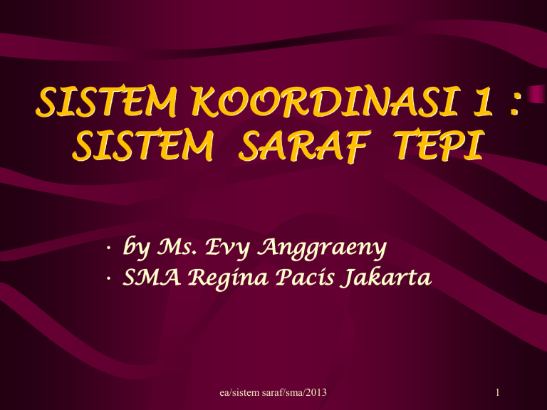 SISTEM KOORDINASI 1 : SISTEM SARAF TEPI • by Ms. Evy Anggraeny • SMA Regina Pacis Jakarta ea/sistem saraf/sma/2013 1 Sistem Saraf Tepi/Perifer (SST) Terdiri dari dua bagian : 1. Saraf somatis/kraniospinal 2. Saraf otonom ea/sistem saraf/sma/2013 2 Saraf Somatik Terdiri dari dua bagian : 1. Saraf cranial : terdiri dari 12 pasang saraf 2. Saraf medulla spinal : terdiri dari 5 pasang saraf Bekerja secara sadar ea/sistem saraf/sma/2013 3 Saraf Cranial Merupakan saraf somatik yang berasal dari otak Disingkat OTikO TroGeAFa Audi GloVa SpiHi Terdiri dari saraf sensorik (nomor I, II, VIII) dan saraf motorik (nomor III, IV, VI, XI, XII) ea/sistem saraf/sma/2013 4 Saraf Spinal Merupakan saraf somatik yang berasal dari medulla spinal Disingkat SePuLuSaKo dengan rumus 812.551 ea/sistem saraf/sma/2013 5 12 pasang Saraf Cranial ea/sistem saraf/sma/2013 6 5 pasang Saraf Spinal ea/sistem saraf/sma/2013 7 Saraf Otonom Merupakan saraf involunter (tidak sadar) Dipengaruhi oleh hipothalamus Terdiri dari dua macam : 1. Saraf simpatik/thoracolumbal (Vertebrae 1-12, Columbar 1-3) : hipothalamus bagian belakang dan samping 2. Saraf parasimpatik/craniosacral (no III, VII, IX, X) : hipothalamus bagian depan dan tengah Bekerja secara antagonis ea/sistem saraf/sma/2013 8 Saraf Otonom ea/sistem saraf/sma/2013 9 Saraf Simpatik Memengaruhi kegiatan : 1. Meningkatkan denyut jantung 2. Meningkatkan volume darah jantung 3. Memperbesar pembuluh koroner 4. Menyempitkan arteri pulmonalis 5. Menyempitkan (vasokontriksi) arteri pada gonad 6. Menstimulus proses ejakulasi ea/sistem saraf/sma/2013 10 Saraf Simpatik Memengaruhi kegiatan : 7. Kontraksi otot radial mata pada iris 8. Relaksasi otot siliari mata 9. Memperlambat gerakan organ pencernaan dan tonus 10. Menghambat sekresi kelenjar pencernaan 11. Terjadi sekresi kelenjar keringat ea/sistem saraf/sma/2013 11 Saraf Simpatik Memengaruhi kegiatan : 12. Menstimulus kelenjar hepar pada proses glikogenolisis 13. Meningkatkan sekresi kelenjar pankreas 14. Menstimulus kelenjar adrenal bagian medula 15. Relaksasi dinding vessica urinaria ea/sistem saraf/sma/2013 12 Saraf Simpatik Memengaruhi kegiatan : 16. Memperbesar bronchus dan bronchiolus 17. Meningkatkan kontraksi otot antar tulang rusuk 18. Meningkatkan tekanan darah pembuluh darah 19. Kontraksi sfinkter vessica urinaria ea/sistem saraf/sma/2013 13 Saraf Simpatik Memengaruhi kegiatan : 20. Kontraksi sfinkter anus 21. Kontraksi otot penegak rambut 22. Tidak berpengaruh pada kelenjar air mata 23. Memperlebar pupil ea/sistem saraf/sma/2013 14 Saraf Parasimpatik Memengaruhi kegiatan : 1. Menghambat denyut jantung 2. Menurunkan volume darah jantung 3. Menyempitkan pembuluh koroner 4. Melebarkan arteri pulmonalis 5. Melebarkan (vasodilatasi) arteri pada gonad 6. Menstimulus organ klitoris dan proses ereksi ea/sistem saraf/sma/2013 15 Saraf Parasimpatik Memengaruhi kegiatan : 7. Kontraksi otot sirkuler mata pada iris 8. Kontraksi otot siliari mata 9. Meningkatkan gerakan organ pencernaan dan tonus 10. Meningkatkan sekresi kelenjar pencernaan 11. Tidak ada pengaruh pada kelenjar keringat ea/sistem saraf/sma/2013 16 Saraf Parasimpatik Memengaruhi kegiatan : 12. Tidak ada pengaruh pada kelenjar hepar 13. Menghambat sekresi kelenjar pankreas 14. Tidak ada pengaruh pada kelenjar adrenal 15. Kontraksi dinding vessica urinaria ea/sistem saraf/sma/2013 17 Saraf Parasimpatik Memengaruhi kegiatan : 16. Menyempitkan bronchus dan bronchiolus 17. Menghambat kontraksi otot antar tulang rusuk 18. Menurunkan tekanan pembuluh darah 19. Relaksasi sfinkter vessica urinaria ea/sistem saraf/sma/2013 18 Saraf Parasimpatik Memengaruhi kegiatan : 20. Relaksasi sfinkter anus 21. Tidak berpengaruh pada otot penegak rambut 22. Menstimulus kelenjar air mata 23. Menyempitkan pupil ea/sistem saraf/sma/2013 19 Pengaruh zat terhadap sel neuron 1. Zat psikoaktif pada narkotika • Golongan sedativa : menurunkan aktivitas otak, ex : barbitura inhalant, lumial, valium, mandrax, dumolid, methaqualon, rohypnol • Golongan stimulan : penambah semangat, tidak mengantuk, euphoria, ex : kafein, nikotin, amphetamine, metamphetamin HCl, kokain • Golongan halusinogen : menimbulkan daya khayal, ex : LSD, mesakolim (dari kaktus peyote), psilosibin (dari fungi), ganja, mariyuana, morfin, ea/sistem saraf/sma/2013 20 Pengaruh zat terhadap sel neuron LAD (Lycergic Acid Diethylamine) • Golongan painkiller : penahan rasa nyeri, ex : morfin dan heroin 2. Zat inhalant : memperlambat kerja otak dan SSP, euphoria, cadel, penurunan kesadaran, ex : tiner, bensin, lem aica aibon, spiritus 3. Zat aditif : menghambat perkembangan sel otak, ex : MSG, pewarna sintetis, ea/sistem saraf/sma/2013 21 Pengaruh zat terhadap sel neuron 4. Alkohol : tidak boleh lebih 0,5% dalam darah, bersifat euphoria dan adiksi. Pemakaian sedikit : lemah cara berfikir, banyak bicara dan tertidur Pemakaian banyak : koordinasi keseimbangan gerak hilang, bicara tidak jelas, mual, manik mata membesar, muka merah, keringat banyak keluar 5. Toksin 6. Mikroorganisme patogen ea/sistem saraf/sma/2013 22 Kelainan sistem saraf 1. Epilepsi : abnormal letusan listrik pada otak. Ada tiga macam : a. Grand mal : kejang dan hilang kesadaran b. Psikomotor : gangguan mental c. Patit mal : kehilangan kesadaran beberapa detik 2. Transeksi : kerusakan medulla spinalis 3. Neuritis : cedera saraf, benturan, tekanan atau kurang vitamin B ea/sistem saraf/sma/2013 23 Kelainan sistem saraf 4. Alzheimer : penurunan daya ingat dan aktivitas 5. Parkinson : neurotransmiter dopamin pada basal ganglia (nukleus cerebrum) berkurang ea/sistem saraf/sma/2013 24 ea/sistem saraf/sma/2013 25 see you in next submateri.... ♥© ea/sistem saraf-ppt/bio xi_ipa/april/2013 ♥ ea/sistem saraf/sma/2013 26