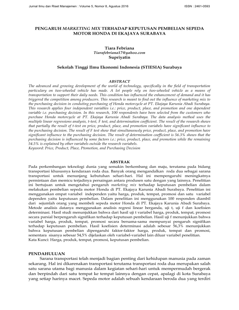 Jurnal Ilmu dan Riset Manajemen : Volume 5, Nomor 8, Agustus 2016 ISSN : 2461-0593 PENGARUH MARKETING MIX TERHADAP KEPUTUSAN PEMBELIAN SEPEDA MOTOR HONDA DI EKAJAYA SURABAYA Tiara Febriana [email protected] Supriyatin Sekolah Tinggi Ilmu Ekonomi Indonesia (STIESIA) Surabaya ABSTRACT The advanced and growing development of the world of technology, specifically in the field of transportation particulary on two-wheeled vehicle has made. A lot people rely on two-wheeled vehicle as a means of transportation to support their daily needs. This condition has influenced the enhancement of demand and it has triggered the competition among producers. This research is meant to find out the influence of marketing mix to the purchasing decision in conduting purchasing of Honda motorcycle at PT. Ekajaya Karunia Abadi Surabaya. This research applies four independent variables i.e.: price, product, place, and promotion and one dependent variable i.e. purchasing decision. In this research, 100 respondents have been selected from the customers who purchase Honda motorcycle at PT. Ekajaya Karunia Abadi Surabaya. The data analysis method uses the multiple linear regressions analysis, t-test, F test, and determination coefficient. The result of the research shows that partially the result of t-test on price, product, place, and promotion variabels have significant influence to the purchasing decision. The result of F test show that simultaneously price, product, place, and promotion have significant influence to the purchasing decision. The result of determination coefficient is 56.3% shows that the purchasing decision is influenced by some factors i.e.: price, product, place, and promotion while the remaining 54.5% is explained by other variabels outside the research variabels. Keyword: Price, Product, Place, Ptomotion, and Purchasing Decision ABSTRAK Pada perkembangan teknologi dunia yang semakin berkembang dan maju, terutama pada bidang transportasi khususnya kendaraan roda dua. Banyak orang mengandalkan roda dua sebagai sarana transportasi untuk menunjang kebutuhan sehari-hari. Hal ini mempengaruhi meningkatnya permintaan dan memicu terjadinya persaingan antara produsen satu dengan yang lainnya. Penelitian ini bertujuan untuk mengetahui pengaruh marketing mix terhadap keputusan pembelian dalam melakukan pembelian sepeda motor Honda di PT. Ekajaya Karunia Abadi Surabaya. Penelitian ini menggunakan empat variabel independen yaitu harga, produk, tempat, promosi dan satu variabel dependen yaitu keputusan pembelian. Dalam penelitian ini menggunakan 100 responden diambil dari sejumlah orang yang membeli sepeda motor Honda di PT. Ekajaya Karunia Abadi Surabaya. Metode analisis datanya menggunakan analisis regresi linear berganda, uji t, uji f dan koefisien determinasi. Hasil studi menunjukkan bahwa dari hasil uji t variabel harga, produk, tempat, promosi secara parsial berpengaruh signifikan terhadap keputusan pembelian. Hasil uji f menunjukkan bahwa variabel harga, produk, tempat, promosi secara bersama-sama mempunyai pengaruh signifikan terhadap keputusan pembelian. Hasil koefisien determinasi adalah sebesar 56,3% menunjukkan bahwa keputusan pembelian dipengaruhi faktor-faktor harga, produk, tempat dan promosi, sementara sisanya sebesar 54,5% dijelaskan oleh variabel-variabel lain diluar variabel penelitian. Kata Kunci: Harga, produk, tempat, promosi, keputusan pembelian. PENDAHULUAN Sarana transportasi telah menjadi bagian penting dari kehidupan manusia pada zaman sekarang. Hal ini dikarenakan transportasi terutama transportasi roda dua merupakan salah satu sarana utama bagi manusia dalam kegiatan sehari-hari untuk mempermudah bergerak dan berpindah dari satu tempat ke tempat lainnya dengan cepat, apalagi di kota Surabaya yang setiap harinya macet. Sepeda motor adalah sebuah kendaraan beroda dua yang terdiri Pengaruh Marketing Mix...-Febriana, Tiara 2 dari kerangka, roda, tangki bahan bakar, tangkai kemudi atau setir dan digerakkan oleh mesin. Untuk menarik minat konsumen untuk membeli produk yang ditawarkan maka dibutuhkan adanya harga yang kompetitif yang akan mempengaruhi konsumen untuk memilih produk tersebut dibandingkan produk yang ada di pasaran lainnya. Produk yang ditawarkan juga harus mendapatkan perhatian, dibeli, dipergunakan atau dikonsumsi sehingga dapat memuaskan para konsumen. Saluran distribusi sangat penting bagi kegiatan untuk menyalurkan, menyebarkan, mengirimkan serta menyampaikan barang yang dipasarkannya kepada konsumen. Promosi ditujukan untuk mempengaruhi konsumen agar dapat menjadi kenal akan produk yang ditawarkan. Faktor harga, produk, tempat, dan promosi yang kurang efektif juga dapat mempengaruhi konsumen untuk membeli karena kurang memberikan gambaran tentang kelebihan motor yang ditawarkan, harga yang lebih mahal dibandingkan harga yang ditawarkan pesaing, kualitas produk yang masih banyak kekurangan terutama desain sepeda motor yang kurang menarik juga memberikan kepuasan kepada pelanggan menjadi faktor penting yang harus diperhatikan oleh honda. Untuk itu diperlukan langkah-langkah yang konkrit dari honda untuk menganalisis perilaku konsumen dalam menentukan pembelian sepeda motor. Keinginan konsumen akan sepeda motor yang memenuhi selera dan kemampuan konsumen harus diperhatikan dengan baik oleh honda. Hal ini diharapkan mampu meningkatkan kembali penjualan dan pangsa pasar sepeda motor honda. Dengan banyaknya bisnis kendaraan roda dua ini termasuk di honda Surabaya yang bermunculan. Maka membuat persaingan diantara honda Surabaya semakin tinggi. Oleh sebab itu diperlukan strategi pemasaran yang tepat untuk dapat mempertahankan pelanggan agar mampu bertahan di bisnis ini. Salah satu strategi yang tepat untuk bertahan dari persaingan tinggi dalam dunia usaha saat ini adalah dengan kegiatan pemasaran. Kegiatan pemasaran perusahaan harus dapat memberikan kepuasan kepada konsumen bila ingin mendapatkan tanggapan yang baik dari konsumen. Perusahaan harus secara penuh tanggung jaw