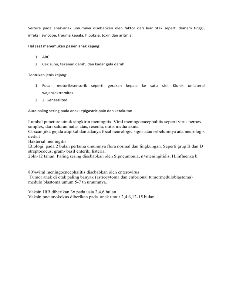 Seizure pada anak-anak umumnya disebabkan oleh faktor dari luar otak seperti demam tinggi, infeksi, syncope, trauma kepala, hipoksia, toxin dan aritmia. Hal saat menemukan pasien anak kejang: 1. ABC 2. Cek suhu, tekanan darah, dan kadar gula darah Tentukan jenis kejang: 1. Focal: motorik/sensorik seperti gerakan kepala ke satu sisi. Klonik unilateral wajah/ektremitas 2. 2. Generalized Aura paling sering pada anak: epigastric pain dan ketakutan Lumbal puncture utnuk singkirin meningitis. Viral meningoencephalitis seperti virus herpes simplex, dari saluran nafas atas, roseola, otitis media akuta Ct-scan jika gejala atipikal dan adanya focal neurologic signs atau sebelumnya ada neurologis deifsit Bakterial meningitis Etiologi: pada 2 bulan pertama umumnya flora normal dan lingkungan. Seperti grup B dan D streptococus, gram- basil enterik, listeria. 2bln-12 tahun. Paling sering disebabkan oleh S.pneumonia, n>meningitidis, H.influenza b. 80%viral meningoencephalitis disebabkan oleh enterovirus Tumor anak di otak paling banyak (astrocytoma dan embrional tumormeduloblastoma) medulo blastoma umum 5-7 th umumnya. Vaksin HiB diberikan 3x pada usia 2,4,6 bulan Vaksin pneumokokus diberikan pada anak umur 2,4,6,12-15 bulan.