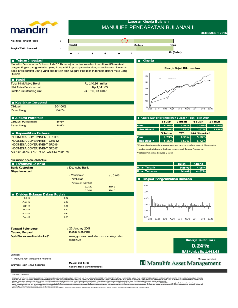 Laporan Kinerja Bulanan MANULIFE PENDAPATAN BULANAN II DESEMBER 2015 Klasifikasi Tingkat Risiko : Jangka Waktu Investasi : Rendah 0 Tinggi Sedang 1 3 6 9 < Tujuan Investasi 18 (Bulan) 12 < Kinerja Manulife Pendapatan Bulanan II (MPB II) bertujuan untuk memberikan alternatif investasi dengan tingkat pengembalian yang kompetitif kepada pemodal dengan melakukan investasi pada Efek bersifat utang yang diterbitkan oleh Negara Republik Indonesia dalam mata uang Rupiah. Kinerja Sejak Diluncurkan 1530 < Posisi MPB II Total Nilai Aktiva Bersih Rp 240.361 milliar Rp 1,041.65 230,750,368.6017 Nilai Aktiva Bersih per unit Jumlah Outstanding Unit Gov Bond with 2 years duration 1410 1290 1170 1050 < Kebijakan Investasi Obligasi Pasar Uang 80-100% 0-20% 930 Jan-09 < Alokasi Portofolio Obligasi Pemerintah Pasar Uang Dec-09 Oct-10 Aug-11 Jun-12 May-13 Mar-14 Jan-15 Dec-15 < Kinerja Manulife Pendapatan Bulanan II dan Tolok Ukur 1 Bulan 80.6% 19.4% 6 Bulan 1 Tahun Fund 0.24% 2.59% 2.06% 4.35% Tolok Ukur** 0.19% 2.83% 2.97% 6.57% < Kepemilikan Terbesar 3 Tahun INDONESIA GOVERNMENT FR0069 INDONESIA GOVERNMENT ORI012 INDONESIA GOVERNMENT SR006 INDONESIA GOVERNMENT SR007 SUKUK IJARAH BKLJT IXL AXIATA THP I TH2015 SERIA 3 Bulan YTD Sejak Diluncurkan* Fund 2.73% 4.35% 5.58% Tolok Ukur** 5.15% 6.57% 6.72% * Kinerja disetahunkan dan menggunakan metode compounding /majemuk (khusus untuk produk yang telah berumur lebih dari setahun sejak Tanggal Penawaran). **Obligasi Pemerintah berdurasi 2 tahun *Diurutkan secara alfabetikal < Informasi Lainnya Bulan Bank Kustodian Biaya Investasi : Deutsche Bank : - Manajemen Kinerja Bulan Terbaik Mar-09 4.96% Bulan Terburuk Feb-09 -4.67% s.d 0.025 < Tingkat Pengembalian Bulanan - Pembelian - Penjualan Kembali 1.25% Thn 1 0.00% Thn 2 < Dividen Bulanan Dalam Rupiah Jul-15 6.37 Aug-15 5.12 Sep-15 6.58 Oct-15 5.30 Nov-15 5.40 Dec-15 6.80 Tanggal Peluncuran Cabang Penjual Sejak Diluncurkan (Disetahunkan)* 10.00% 7.00% 4.00% 1.00% -2.00% -5.00% Jan-09 : 23 January 2009 : BANK MANDIRI : menggunakan metode compounding atau majemuk Dec-09 Oct-10 Aug-11 Jun-12 May-13 Mar-14 Jan-15 Dec-15 Kinerja Bulan Ini : 0.24% NAB/Unit : Rp 1,041.65 Sumber: PT Manulife Aset Manajemen Indonesia Informasi lebih lanjut, hubungi: Manajer Investasi: Mandiri Call 14000 Cabang Bank Mandiri terdekat UNGKAPAN & SANGGAHAN RINGKASAN INFO PRODUK MERUPAKAN DOKUMEN PENAWARAN SEBAGAIMANA DIWAJIBKAN OLEH PERATURAN DAN TIDAK MENGGANTIKAN PROSPEKTUS. REKSA DANA ADALAH PRODUK PASAR MODAL YANG DITERBITKAN BERDASARKAN KONTRAK INVESTASI KOLEKTIF YANG DITANDATANGANI OLEH MANAJER INVESTASI DAN BANK KUSTODIAN, DAN BUKAN MERUPAKAN PRODUK YANG DITERBITKAN OLEH AGEN PENJUAL EFEK REKSA DANA (APERD). APERD TIDAK BERTANGGUNG JAWAB ATAS TUNTUTAN DAN RISIKO PENGELOLAAN PORTOFOLIO REKSA DANA YANG DILAKUKAN OLEH MANAJER INVESTASI. INVESTASI MELALUI REKSA DANA MENGANDUNG RISIKO. CALON INVESTOR WAJIB MEMBACA DAN MEMAHAMI PROSPEKTUS SEBELUM MEMUTUSKAN UNTUK BERINVESTASI MELALUI REKSA DANA. KINERJA MASA LALU TIDAK MENCERMINKAN KINERJA MASA DATANG. PT Manulife Aset Manajemen Indonesia (MAMI) telah melakukan upayanya yang terbaik untuk memastikan bahwa informasi yang terdapat dalam dokumen ini benar. Namun tidak ada jaminan bahwa informasi tersebut lengkap dan akurat dan MAMI tidak bertanggung jawab atas konsekuensi dari keputusan yang diambil berdasarkan informasi yang terdapat dalam dokumen ini. Apabila perlu, investor disarankan untuk meminta pendapat profesional sebelum mengambil keputusan berinvestasi. Reksa Dana Manulife adalah Reksa Dana domestik yang ditawarkan dan dikelola oleh MAMI. Penawaran Reksa Dana tidak didaftarkan sesuai dengan hukum dan peraturan lainnya selain yang berlaku di Indonesia. Kinerja masa lalu tidak serta merta menjadi petunjuk untuk kinerja di masa mendatang, dan bukan juga merupakan perkiraan yang dibuat untuk memberikan indikasi mengenai kinerja atau kecenderungannya di masa mendatang. Tanggal Efektif 24 Oktober 2008 Tanggal Penawaran 23 Januari 2009 MANULIFE PENDAPATAN BULANAN II PROSPEKTUS PEMBAHARUAN OJK TIDAK MEMBERIKAN PERNYATAAN MENYETUJUI ATAU TIDAK MENYETUJUI EFEK INI, TIDAK JUGA MENYATAKAN KEBENARAN ATAU KECUKUPAN ISI PROSPEKTUS INI. SETIAP PERNYATAAN YANG BERTENTANGAN DENGAN HAL-HAL TERSEBUT ADALAH PERBUATAN MELANGGAR HUKUM. Reksa Dana MANULIFE PENDAPATAN BULANAN II (selanjutnya disebut "MANULIFE PENDAPATAN BULANAN II") adalah Reksa Dana berbentuk Kontrak Investasi Kolektif (“KIK”) berdasarkan Undang-Undang No.8 tahun 1995 tentang Pasar Modal (“Undang-Undang Pasar Modal”) beserta peraturan pelaksanaannya. MANULIFE PENDAPATAN BULANAN II bertujuan untuk memberikan alternatif investasi dengan tingkat pengembalian yang kompetitif kepada pemodal dengan melakukan investasi pada Efek bersifat utang yang diterbitkan oleh Negara Republik Indonesia dalam mata uang Rupiah . MANULIFE PENDAPATAN BULANAN II mempunyai komposisi portofolio minimum 80% (delapan puluh per seratus) dan maksimum 100% (seratus per seratus) pada Efek bersifat utang yang diterbitkan oleh Negara Republik Indonesia baik di dalam maupun di luar negeri; serta minimum 0% (nol per seratus) dan maksimum 20% (dua puluh per seratus) pada instrumen pasar uang yang mempunyai jatuh tempo kurang dari 1 (satu) tahun dan diterbitkan berdasarkan peraturan perundang-undangan yang berlaku di Indonesia. Dalam hal akan berinvestasi pada Efek luar negeri, MANULIFE PENDAPATAN BULANAN II akan mengacu pada ketentuan peraturan perundangundangan yang berlaku di Indonesiadan hukum negara yang mendasari penerbitan Efek luar negeri tersebut. PENAWARAN UMUM PT Manulife Aset Manajemen Indonesia sebagai Manajer Investasi melakukan Penawaran Umum atas Unit Penyertaan MANULIFE PENDAPATAN BULANAN II (“Unit Penyertaan”) secara terus-menerus hingga mencapai jumlah 4.000.000.000 (Empat miliar) Unit Penyertaan. Setiap Unit Penyertaan MANULIFE PENDAPATAN BULANAN II ditawarkan dengan harga sama dengan Nilai Aktiva Bersih (NAB) awal yaitu sebesar Rp 1.000,- (seribu Rupi