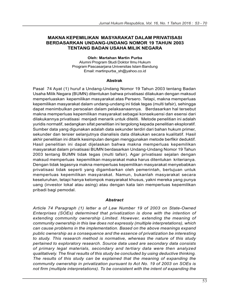 Jurnal Hukum Respublica, Vol. 16, No. 1 Tahun 2016 : 53 - 70 MAKNA KEPEMILIKAN MASYARAKAT DALAM PRIVATISASI BERDASARKAN UNDANG-UNDANG NOMOR 19 TAHUN 2003 TENTANG BADAN USAHA MILIK NEGARA Oleh: Martahan Martin Purba Alumni Program Studi Doktor Ilmu Hukum Program Pascasarjana Universitas Islam Bandung Email: [email protected] Abstrak Pasal 74 Ayat (1) huruf a Undang-Undang Nomor 19 Tahun 2003 tentang Badan Usaha Milik Negara (BUMN) ditentukan bahwa privatisasi dilakukan dengan maksud memperluaskan kepemilikan masyarakat atas Persero. Tetapi, makna memperluas kepemilikan masyarakat dalam undang-undang ini tidak tegas (multi tafsir), sehingga dapat menimbulkan persoalan dalam pelaksanaannya. Berdasarkan hal tersebut makna memperluas kepemilikan masyarakat sebagai konsekuensi dan esensi dari dilakukannya privatisasi menjadi menarik untuk diteliti. Metode penelitian ini adalah yuridis normatif, sedangkan sifat penelitian ini tergolong kepada penelitian eksploratif. Sumber data yang digunakan adalah data sekunder terdiri dari bahan hukum primer, sekunder dan tersier selanjutnya dianalisis data dilakukan secara kualitatif. Hasil akhir penelitian ini ditarik kesimpulan dengan menggunakan metode berfikir deduktif. Hasil penelitian ini dapat dijelaskan bahwa makna memperluas kepemilikan masyarakat dalam privatisasi BUMN berdasarkan Undang-Undang Nomor 19 Tahun 2003 tentang BUMN tidak tegas (multi tafsir). Agar privatisasi sejalan dengan maksud memperluas kepemilikan masyarakat maka harus ditentukan kriterianya. Dengan tidak tegasnya makna memperluas kepemilikan masyarakat menyebabkan privatisasi tidak seperti yang digambarkan oleh pemerintah, bertujuan untuk memperluas kepemilikan masyarakat. Namun, bukanlah masyarakat secara keseluruhan, tetapi hanya kelompok masyarakat khusus, yakni mereka yang punya uang (investor lokal atau asing) atau dengan kata lain memperluas kepemilikan pribadi bagi pemodal. Abstract Article 74 Paragraph (1) letter a of Law Number 19 of 2003 on State-Owned Enterprises (SOEs) determined that privatization is done with the intention of extending community ownership Limited. However, extending the meaning of community ownership in this law does not expressly (multiple interpretations), which can cause problems in the implementation. Based on the above meanings expand public ownership as a consequence and the essence of privatization be interesting to study. This research method is normative, whereas the nature of this study pertained to exploratory research. Source data used are secondary data consists of primary legal materials, secondary and tertiary data were then analyzed qualitatively. The final results of this study be concluded by using deductive thinking. The results of this study can be explained that the meaning of expanding the community ownership in privatization pursuant to Act No. 19 of 2003 on SOEs is not firm (multiple interpretations). To be consistent with the intent of expanding the 53 Makna Kepemilikan Masyarakat Dalam Privatisasi Berdasarkan Undang-Undang.....(Martahan Martin Purba) privatization of public ownership it must be determined criteria. By not specifically expand the meaning of community ownership led to privatization is not as portrayed by the government, aiming to expand public ownership. However, not society as a whole, but only particular groups of people, namely those who have money (local or foreign investor) or in other words extending private ownership to the investor. Kata kunci: Makna, Kepemilikan, BUMN, Privatisasi Pendahuluan Pasal 33 Undang-Undang Dasar (UUD) Negara Republik Indonesia Tahun 1945 merupakan landasan konstitusional perekonomian nasional. Salah satu yang berperan dalam perekonomian nasional adalah Badan Usaha Milik Negara (BUMN). Peran penting BUMN bukan hanya diharapkan sebagai pengemban kepentingan dan pelayanan serta pemenuhan kebutuhan rakyat banyak, tetapi juga sebagai penyumbang terbesar dalam perekonomian nasional.1 Hal itu dapat dilihat secara nyata melalui peranannya selaku perintis kegiatan usaha-usaha (pioneer),2 dalam perekonomian nasional. Secara ekonomi, Indonesia pernah menjadi negara yang disegani di Asia Tenggara. Namun, setelah krisis 1997 ekonomi Indonesia mengalami keterpurukan. Berbagai upaya yang disarankan International Monetary Fund (IMF) telah dijalankan, misalnya format Anggaran Pendapatan Belanja Negara (APBN) dari T-Account menjadi I-Account, yang memungkinkan adanya defisit pada APBN. Salah satu upaya yang ditempuh Pemerintah untuk menutup defisit anggaran tersebut adalah melakukan privatisasi BUMN.3 Tujuan privatisasi saat terjadi krisis tersebut lebih diarahkan untuk memenuhi kebutuhan keuangan negara. Strategi utama privatisasi BUMN dilakukan dengan divestiture (divestasi), yaitu cara pengalihan aset Pemerintah yang terdapat pada BUMN kepada pihak lain. Sampai dengan pertengahan tahun 1997 Pemerintah telah berhasil melakukan privatisasi saham minoritas atas kepemilikan saham mayoritas yang dimiliki Pemerintah pada sejumlah BUMN termasuk penawaran saham perdana untuk 6 perusahaan, yaitu Telkom, Indosat, Tambang Timah, Aneka Tambang, Semen Gresik, dan BNI. Proses privatisasi terus berlanjut, pada tahun 1998-1999 dilakukan privatisasi atas sejumlah perusahaan termasuk Semen Gresik, Telkom (lanjutan), Pelindo, Indosat, Kimia Farma, Bank Mandiri, dan lainnya.4 Secara teori privatisasi membantu terbentuknya pasar bebas, mengembangnya kompetisi kapitalis yang oleh para pendukungnya dianggap akan memberikan harga yang lebih kompetitif kepada publik. Sebaliknya, para sosialis menganggap privatisasi sebagai hal yang negatif, karena memberikan layanan penting untuk publik dan mengakibatkan kualitas Harsono, Kerja Sama Antara Perusahaan Negara, Swasta, dan Koperasi Dalam Rangka Menyukseskan Pembangunan Ekonomi di Indonesia, Pidato Pengukuhan dalam penerimaan jabatan Guru Besar, Universitas Brawijaya, Malang, 1986, hlm. 2. 2 Rudhi Prasetya dan Neil Hamilton, dalam Aminuddin Ilmar, Hak Menguasai Negar