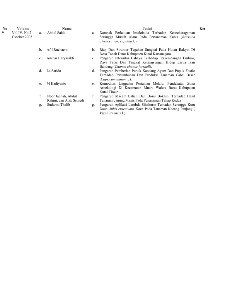 No 9 Volume Vol.IV. No.2 Oktober 2005 a. Nama Abdul Sahid a. b. Afif Ruchaemi b. c. Anshar Haryasakti c. d. La Sarido d. e. M Hadiyanto e. f. Noor Jannah, Abdul Rahmi, dan Atak Semedi Sudarmi Thalib f. g. g. Judul Dampak Perlakuan Insektisida Terhadap Keanekaragaman Serangga Musuh Alam Pada Pertanaman Kubis (Brassica oleracea var. capitata L) Riap Dan Struktur Tegakan Sungkai Pada Hutan Rakyat Di Desa Tanah Datar Kabupaten Kutai Kartanegara. Pengaruh Intensitas Cahaya Terhadap Perkembangan Embrio, Daya Tetas Dan Tingkat Kelangsungan Hidup Larva Ikan Bandeng (Chanos-chanos forskall). Pengaruh Pemberian Pupuk Kandang Ayam Dan Pupuk Fosfat Terhadap Pertumbuhan Dan Produksi Tanaman Cabai Besar (Capsicum annum L). Komoditas Unggulan Pertanian Melalui Pendekatan Zona Aroekologi Di Kecamatan Muara Wahau Barat Kabupaten Kutai Timur. Pengaruh Macam Bahan Dan Dosis Bokashi Terhadap Hasil Tanaman Jagung Manis Pada Penanaman Tahap Kedua Pengaruh Aplikasi Lambda Sihalotrin Terhadap Serangga Kutu Daun Aphis craccivora Koch Pada Tanaman Kacang Panjang ( Vigna sinensis L). Ket