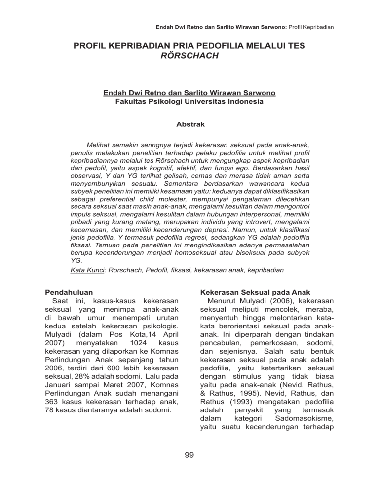 Endah Dwi Retno dan Sarlito Wirawan Sarwono: Profil Kepribadian PROFIL KEPRIBADIAN PRIA PEDOFILIA MELALUI TES RŐRSCHACH Endah Dwi Retno dan Sarlito Wirawan Sarwono Fakultas Psikologi Universitas Indonesia Abstrak Melihat semakin seringnya terjadi kekerasan seksual pada anak-anak, penulis melakukan penelitian terhadap pelaku pedofilia untuk melihat profil kepribadiannya melalui tes Rőrschach untuk mengungkap aspek kepribadian dari pedofil, yaitu aspek kognitif, afektif, dan fungsi ego. Berdasarkan hasil observasi, Y dan YG terlihat gelisah, cemas dan merasa tidak aman serta menyembunyikan sesuatu. Sementara berdasarkan wawancara kedua subyek penelitian ini memiliki kesamaan yaitu: keduanya dapat diklasifikasikan sebagai preferential child molester, mempunyai pengalaman dilecehkan secara seksual saat masih anak-anak, mengalami kesulitan dalam mengontrol impuls seksual, mengalami kesulitan dalam hubungan interpersonal, memiliki pribadi yang kurang matang, merupakan individu yang introvert, mengalami kecemasan, dan memiliki kecenderungan depresi. Namun, untuk klasifikasi jenis pedofilia, Y termasuk pedofilia regresi, sedangkan YG adalah pedofilia fiksasi. Temuan pada penelitian ini mengindikasikan adanya permasalahan berupa kecenderungan menjadi homoseksual atau biseksual pada subyek YG. Kata Kunci: Rorschach, Pedofil, fiksasi, kekarasan anak, kepribadian Pendahuluan Saat ini, kasus-kasus kekerasan seksual yang menimpa anak-anak di bawah umur menempati urutan kedua setelah kekerasan psikologis. Mulyadi (dalam Pos Kota,14 April 2007) menyatakan 1024 kasus kekerasan yang dilaporkan ke Komnas Perlindungan Anak sepanjang tahun 2006, terdiri dari 600 lebih kekerasan seksual, 28% adalah sodomi. Lalu pada Januari sampai Maret 2007, Komnas Perlindungan Anak sudah menangani 363 kasus kekerasan terhadap anak, 78 kasus diantaranya adalah sodomi. Kekerasan Seksual pada Anak Menurut Mulyadi (2006), kekerasan seksual meliputi mencolek, meraba, menyentuh hingga melontarkan katakata berorientasi seksual pada anakanak. Ini diperparah dengan tindakan pencabulan, pemerkosaan, sodomi, dan sejenisnya. Salah satu bentuk kekerasan seksual pada anak adalah pedofilia, yaitu ketertarikan seksual dengan stimulus yang tidak biasa yaitu pada anak-anak (Nevid, Rathus, & Rathus, 1995). Nevid, Rathus, dan Rathus (1993) mengatakan pedofilia adalah penyakit yang termasuk dalam kategori Sadomasokisme, yaitu suatu kecenderungan terhadap 99 JPS VoL. 14 No. 02 Mei 2008 aktivitas seksual yang meliputi pengikatan atau menimbulkan rasa sakit atau penghinaan. Pedofilia dapat diklasifikasikan ke dalam beberapa tipe, antara lain pedofilia yang menetap, pedofilia yang sifatnya regresi, pedofilia seks lawan jenis, pedofilia sesama jenis, dan pedofilia wanita. Sebagian pedofil menderita karena adanya dorongan pemenuhan kebutuhan berhubungan seksual dengan anak dibawah umur. Jika dorongan tidak dipenuhi maka akan menyebabkan distress atau masalah interpersonal, dan jika dipenuhi akan membahayakan orang lain dan dirinya sendiri karena melanggar hukum. Pedofilia dapat diklasifikasikan ke dalam 5 tipe (dalam www.gaul.com) ,yaitu: (a) Pedofilia yang fiksasi. Orang dengan pedofilia tipe ini menganggap dirinya terjebak pada lingkungan anak. Mereka jarang bergaul dengan sesama usianya dan memiliki hubungan yang lebih baik dengan anak. Mereka digambarkan sebagai lelaki dewasa yang tertarik pada anak laki-laki dan menjalin hubungan layaknya sesama anak laki-laki; (b) Pedofilia yang sifatnya regresi. Individu dengan pedofilia regresi tidak tertarik pada anak lelaki, dan biasanya bersifat heteroseks, serta lebih suka pada anak perempuan berumur 8 atau 9 tahun. Beberapa di antara mereka mengeluhkan adanya kecemasan maupun ketegangan dalam perkawinan mereka, dan hal ini yang menyebabkan timbulnya impuls pedofilia. Mereka menganggap anak sebagai pengganti orang dewasa, menjalin hubungan seperti sesama dewasa, dan awalnya terjadi secara tiba-tiba; (c) Pedofilia seks lawan jenis. Merupakan pedofilia yang melibatkan anak perempuan dan didiagnosa sebagai pedofilia regresi. Pedofilia lawan jenis ini umumnya menjadi teman anak perempuan tersebut. Kemudian secara bertahap melibatkan anak tersebut dalam hubungan seksual, dan sifatnya tidak memaksa. Seringkali mereka mencumbu anak atau meminta anak mencumbunya; (d) Pedofilia sesama jenis. Orang dengan pedofilia jenis ini lebih suka berhubungan seks dengan anak laki-laki ataupun anak perempuan dibanding orang dewasa. Anak-anak tersebut berumur antara 10-12 tahun; (e) Pedofilia wanita. Menurut Mulyadi (dalam detik.com 2006), meskipun jarang dilaporkan, ada juga pedofilia juga yang dilakukan oleh wanita, dan biasanya melibatkan anak berumur 12 tahun atau lebih muda. Hal ini mungkin disebabkan oleh adanya perasaan keibuan pada wanita, dan anak lakilaki tidak menganggap hal ini sebagai sesuatu yang sifatnya negatif, karena itu insidennya kurang dilaporkan. Sementara itu dalam DSM-IV-TR pedofilia dapat dispesifikasikan dalam beberapa kelompok antara lain: (a) Sexually attracted to male, (b) Sexually attracted to female, (c) Sexually attracted to both, (d) Limited to incest, (e) Exclusive type, (f) Nonexclusive type. Sementara dalam DSM-IV-TR (2000, p 572) kriteria pedofilia adalah: (a) Berulang, intens, dan terjadi selama periode minimal 6 bulan, fantasi dorongan, perilaku yang menimbulkan gairah seksual yang berkaitan dengan melakukan kontak seksual dengan seorang anak yang belum puber; (b) Orang yang bersangkutan bertindak berdasarkan dorongan tersebut, atau dorongan dan fantasi tersebut menyebabkan orang yang bersangkutan mengalami distress atau masalah interpersonal; (c) Orang yang bersangkutan minimal berusia 16 tahun dan 5 tahun lebih tua dari anak yang 100 Endah Dwi Retno dan Sarlito Wirawan Sarwono: Profil Kepribadian menjadi korbannya. Melihat beberapa kejadian kekerasan seksual dan dampaknya pada korban yang begitu besar, baik dalam hal kepribadian, psikososial dan psikoseksual, maka penulis ingin melakuk
