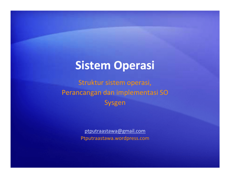 Sistem Operasi Struktur sistem operasi, Perancangan dan implementasi SO Sysgen [email protected] Ptputraastawa.wordpress.com Struktur SO - Sederhana • Struktur Sistem Operasi – Metode untuk mengorganisasi dan membangun sistem operasi • Stuktur Sederhana – Contoh: MS-DOS – Saat dirancang kemampuan PC sangat minimal • Prosesor: 8086 (10 MHz), Max. memory: 640 Kb – MS-DOS – dibuat dengan menyediakan “fungsional” dari OS sebanyak mungkin pada resources yang sangat terbatas (memori) – Tidak dalam bentuk modul => monolithic (satu kesatuan): • MS-DOS menjadi satu kesatuan besar tanpa batasan jelas – fungsional dan interface • Terdapat struktur yang sangat sederhana dan “proteksi” yang longgar (single user system) Sistem Operasi – Putu Putra Astawa 2 Slide 3 - 2/14 Struktur Layer MS-DOS Sistem Operasi – Putu Putra Astawa 3 Slide 3 - 3/14 Struktur SO – MicroKernel • Struktur terbatas pada dua layer – Systems programs: bagian OS yang dibangun di atas kernel – extended machine – Kernel • Operasi vital yang penting dan melindungi resources hardware • Semua service untuk user proses melalui mekanisme system call • Tugas utama kernel menyediakan fasilitas untuk: multiprogramming/multitasking – dimana proses-proses dapat berjalan serentak (concurrent) dan terpisah • UNIX (1978) Sistem Operasi – Putu Putra Astawa 4 Slide 3 - 4/14 Struktur SO – MicroKernel (cont,.) • Keuntungan dari kernel ini adalah – Kemudahan dalam memperluas sistem operasi. – mudah untuk diubah ke bentuk arsitektur baru. – Kode yang kecil dan lebih aman • Kelemahannya adalah kinerja akan berkurang selagi bertambahnya fungsi-fungsi yang digunakan. Sistem Operasi – Putu Putra Astawa Slide 3 - 5/14 Struktur Sistem UNIX Sistem Operasi – Putu Putra Astawa 6 Slide 3 - 6/14 Struktur SO - Modular • • • • Menggunakan pendekatan berorientasi-objek Setiap komponen inti terpisah dan terhubung secara dinamis Pemanggilan modul secara dinamis (Loadable Kernel Modules) Contoh: Solaris, Linux dan MacOSX Sistem Operasi – Putu Putra Astawa Slide 3 - 7/14 Modular - Solaris loadable modules Sistem Operasi – Putu Putra Astawa Slide 3 - 8/14 Struktur SO- Pendekatan Berlapis (layer approach) • Susunan berlapis: – OS dibagi atas sejumlah (lebih dari 2) layer – Setiap layer melingkupi layer di bawahnya (kendali, akses) – Layer paling bawah (0) => hardware – Layer paling atas (N) => user interface • Rancangan modular: – Layer disusun sehingga setiap fungsi/operasi layer atas akan menggunakan “services” pada layer bawah. Sistem Operasi – Putu Putra Astawa 9 Slide 3 - 9/14 Pendekatan Berlapis (layer approach) Sistem Operasi – Putu Putra Astawa Slide 3 - 10/14 Menurut Tanenbaum dan Woodhull, sistem terlapis terdiri dari enam lapisan 1. Lapisan 0. Mengatur alokasi prosesor, pertukaran antar proses ketika interupsi terjadi atau waktu habis. 2. Lapisan 1. Mengalokasikan ruang untuk proses di memori utama 3. Lapisan 2. Menangani komunikasi antara masing-masing proses dan operator console. 4. Lapisan 3. Mengatur peranti I/O dan menampung informasi yang mengalir dari/ke proses tersebut. 5. Lapisan 4. Tempat program pengguna. Pengguna tidak perlu memikirkan tentang proses, memori, atau manajemen I/O. 6. Lapisan 5. Merupakan operator sistem. Sistem Operasi – Putu Putra Astawa Slide 3 - 11/14 Perancangan Sistem Tujuan Perancangan Sistem • Tujuan User – sistem operasi mudah digunakan, mudah dipelajari, handal, aman dan cepat • Tujuan Sistem – sistem operasi mudah didisain, diimplementasikan dan dikelola, memiliki fleksibilitas, handal, bebas kesalahan dan efisien Sistem Operasi – Putu Putra Astawa 12Slide 3 - 12/14 Implementasi Sistem • Secara tradisional ditulis dalam bahasa assemby, saat ini sistem operasi dapat ditulis dalam bahasa tingkat tinggi. • Kode yang ditulis dalam bahasa tingkat tinggi : • Code written in a high-level language: – Dapat ditulis secara cepat. – Lebih compact. – Lebih mudah dipahami dan debug. • Sistem operasi jauh lebih mudah untuk di port (dipindahkan ke hardware lain) jika ditulis dalam bahasa tingkat tinggi) Sistem Operasi – Putu Putra Astawa 13Slide 3 - 13/14 System Generation (SYSGEN) • Sistem operasi didisain untuk dijalankan pada berbagai kelas mesin. Sistem harus dikonfirgurasi untuk setiap komputer secara spesifik • Program SYSGEN memiliki informasi dalam mengkonfigurasi sistem hardware secara spesifik • Booting –awal komputer diaktifkan dengan melakukan loading kernel. • Bootstrap program – kode yang disimpan di ROM yang dapat ditempatkan pada kernel, di load ke memori dan memulai eksekusi. Sistem Operasi – Putu Putra Astawa 14Slide 3 - 14/14 Sistem Operasi – Putu Putra Astawa Slide 3 - 15/14