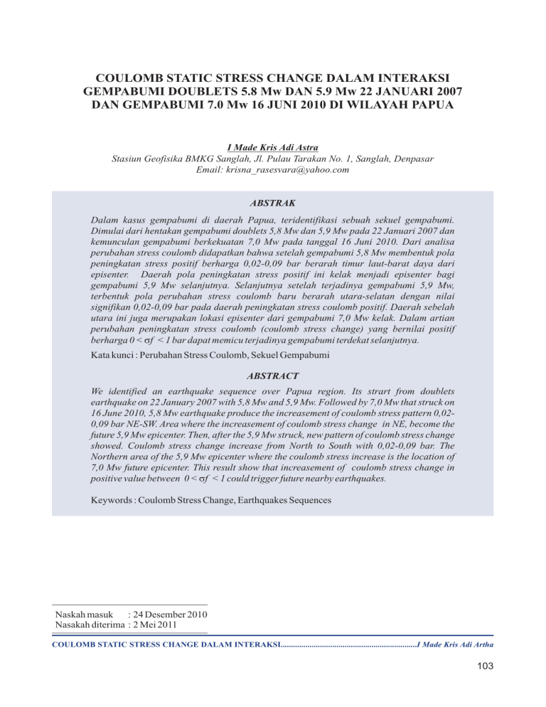 COULOMB STATIC STRESS CHANGE DALAM INTERAKSI GEMPABUMI DOUBLETS 5.8 Mw DAN 5.9 Mw 22 JANUARI 2007 DAN GEMPABUMI 7.0 Mw 16 JUNI 2010 DI WILAYAH PAPUA I Made Kris Adi Astra Stasiun Geofisika BMKG Sanglah, Jl. Pulau Tarakan No. 1, Sanglah, Denpasar Email: [email protected] ABSTRAK Dalam kasus gempabumi di daerah Papua, teridentifikasi sebuah sekuel gempabumi. Dimulai dari hentakan gempabumi doublets 5,8 Mw dan 5,9 Mw pada 22 Januari 2007 dan kemunculan gempabumi berkekuatan 7,0 Mw pada tanggal 16 Juni 2010. Dari analisa perubahan stress coulomb didapatkan bahwa setelah gempabumi 5,8 Mw membentuk pola peningkatan stress positif berharga 0,02-0,09 bar berarah timur laut-barat daya dari episenter. Daerah pola peningkatan stress positif ini kelak menjadi episenter bagi gempabumi 5,9 Mw selanjutnya. Selanjutnya setelah terjadinya gempabumi 5,9 Mw, terbentuk pola perubahan stress coulomb baru berarah utara-selatan dengan nilai signifikan 0,02-0,09 bar pada daerah peningkatan stress coulomb positif. Daerah sebelah utara ini juga merupakan lokasi episenter dari gempabumi 7,0 Mw kelak. Dalam artian perubahan peningkatan stress coulomb (coulomb stress change) yang bernilai positif berharga 0 < s f < 1 bar dapat memicu terjadinya gempabumi terdekat selanjutnya. Kata kunci : Perubahan Stress Coulomb, Sekuel Gempabumi ABSTRACT We identified an earthquake sequence over Papua region. Its strart from doublets earthquake on 22 January 2007 with 5,8 Mw and 5,9 Mw. Followed by 7,0 Mw that struck on 16 June 2010, 5,8 Mw earthquake produce the increasement of coulomb stress pattern 0,020,09 bar NE-SW. Area where the increasement of coulomb stress change in NE, become the future 5,9 Mw epicenter. Then, after the 5,9 Mw struck, new pattern of coulomb stress change showed. Coulomb stress change increase from North to South with 0,02-0,09 bar. The Northern area of the 5,9 Mw epicenter where the coulomb stress increase is the location of 7,0 Mw future epicenter. This result show that increasement of coulomb stress change in positive value between 0 < s f < 1 could trigger future nearby earthquakes. Keywords : Coulomb Stress Change, Earthquakes Sequences Naskah masuk : 24 Desember 2010 Nasakah diterima : 2 Mei 2011 COULOMB STATIC STRESS CHANGE DALAM INTERAKSI..................................................................I Made Kris Adi Artha 103 I. PENDAHULUAN Daerah-daerah margin aktif di wilayah Papua yang ditengarai membangkitkan gempabumi masih melangsungkan dinamika-nya, menghasilkan pola-pola seismisitas yang rumit dan kompleks. Sebut saja sistem lempengan besar seperti Indo-Australia -Eurasia-Pasifik yang berinteraksi satu sama lain. Selain itu sistem sesarsesar lokal juga mengambil peran dalam pola seismisitas di daerah setempat. Te r k a i t d e n g a n g e m p a b u m i y a n g mengguncang daerah Papua pada 22 Januari 2007, dan diikuti beberapa seismisitas signifikan hingga pada 16 Juni 2010 wilayah Papua diguncang gempabumi 7,0 Mw. Permasalahan menjadi penting ketika gempabumi pada 22 Januri 2007 adalah gempa doublets yang terjadi beberapa saat setelah sebuah gempabumi mendahuluinya di daerah yang relatif berdekatan. Lebih lanjut gempabumi 16 Juni 2010 juga terjadi di daerah yang relatif dekat dengan episentrum gempa doublets 2007. Ketiga gempa tersebut memiliki kedalaman yang dangkal. Gempa pertama dengan kedalaman 39 km diikuti dengan 26,20 km dan 20 km pada gempa kedua dan ketiga.1) Lokasi gempa terjadi juga merupakan daerah yang rumit. Berada pada hamparan sistem Palung New Guinea, dan bentangan zona sesar Sorong-Ransiki-Yapen di Teluk Cendrawasih. Efek gempabumi yang dihasilkan oleh gempa-gempa besar dengan kedalaman dangkal akan lebih merusak dibandingkan gempa dalam, disamping pengaruh dari respon batuan setempat. Mengingat kompleksitas tektono-geologi tersebut menjadikan daerah ini penting dan menarik untuk dikaji. Karena tidak tertutup kemungkinan pada zona ini akan terjadi gempagempa besar yang sejenis pada masa yang akan datang. Dalam tulisan ini penulis menganalisa apakah ada keterkaitan antara gempa-gempa tersebut satu sama lain dalam medan perubahan stress coulomb yang dihasilkan oleh masingmasing gempabumi. Coulomb stress telah digunakan secara luas untuk dapat menjelaskan interaksi gempabumi dalam medan stress-nya. Hal ini memiliki implikasi penting dalam pemetaan daerah rawan bencana gempabumi.2) II. TEKTONIK DAN SEISMISITAS PAPUA 2.1. Tektonik Papua Kawasan perairan Maluku (Molucca Sea), laut Banda, dan Irian Jaya berada diantara empat lempengan tektonik (SU (Sunda), PS (Philippine Sea), PA (Pasifik), dan AU (Australia)). Dan membuatnya menjadi kawasan Neotektonik paling kompleks di muka bumi3). Secara umum dari utara ke selatan, geologi daerah Irian Jaya (sekarang Papua) dapat dikelompokkan menjadi tiga daerah geologi : lempengan benua (continental), lempengan samudra (oceanic) dan daerah transisi. Setiap daerah geologi memiliki karakteristik masingmasing. Daerah lempengan benua terdiri dari sedimen yang merupakan bagian dari Perisai Australia (Australian Craton). Daerah lempengan samudra terdiri dari batuan ophiolit dan kompleks busur kepulauan vulkanik yang merupakan bagian dari lempeng Pasifik. Daerah transisi terdiri dari batuan metamorfik sebagai produk dari interaksi antara lempeng. Gambar 1. Kompleks Geologi Wilayah Papua (Sumber : specialpaper.gsapub. org) Proses tektonik daerah tengah (Central Range Orogeny) dibagi menjadi fase pre collisional (pra-tumbukan) dan fase collisional (tumbukan). Fase pre collisional berhubungan dengan dorongan dan proses metamorfosis dari sedimen margin pasif di daerah subduksi yang menuju ke utara. Fase collisional terjadi ketika gaya apungan buoyancy litosfer Australia mengunci zona subduksi. Dasar lempengan benua kristalin menjadi terlibat dalam proses ini. JURNAL METEOROLOGI DAN GEOFISIKA VOLUME 12 NOMOR 1 TAHUN 2011: 103 - 111 104 Deliminasi collisional didalilkan sebagai proses tektonik yang terjadi dalam proses subduksi litosfer Australia 7