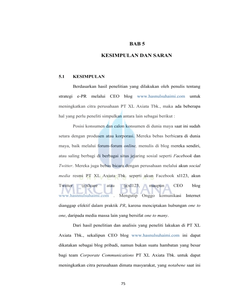 75 BAB 5 KESIMPULAN DAN SARAN 5.1 KESIMPULAN Berdasarkan hasil penelitian yang dilakukan oleh penulis tentang strategi e-PR melalui CEO blog www.hasnulsuhaimi.com untuk meningkatkan citra perusahaan PT XL Axiata Tbk., maka ada beberapa hal yang perlu peneliti simpulkan antara lain sebagai berikut : Posisi konsumen dan calon konsumen di dunia maya saat ini sudah setara dengan produsen atau korporasi. Mereka bebas berbicara di dunia maya, baik melalui forum-forum online, menulis di blog mereka sendiri, atau saling berbagi di berbagai situs jejaring sosial seperti Facebook dan Twitter. Mereka juga bebas bicara dengan perusahaan melalui akun social media resmi PT XL Axiata Tbk. seperti akun Facebook xl123, akun Twitter @xlcare atau @xl123, maupun CEO blog www.hasnnulsuhaimi.com . Mengutip Onggo komunikasi Internet dianggap efektif dalam praktik PR, karena menciptakan hubungan one to one, daripada media massa lain yang bersifat one to many. Dari hasil penelitian dan analisis yang peneliti lakukan di PT XL Axiata Tbk., sekalipun CEO blog www.hasnulsuhaimi.com ini dapat dikatakan sebagai blog pribadi, namun bukan suatu hambatan yang besar bagi team Corporate Communications PT XL Axiata Tbk. untuk dapat meningkatkan citra perusahaan dimata masyarakat, yang notabene saat ini 75 76 hidup di dunia maya melalui CEO blog tersebut. Telah banyak khalayak yang melihat sosok Hasnul Suhaimi sangat melekat dengan XL, begitupun sebaliknya. Sehingga dalam blog www.hasnulsuhaimi.com ini, mau tidak mau, image PT XL Axiata Tbk. ikut terbentuk didalamnya. Dari uraian diatas, dapat diambil kesimpulan bahwa peran Public Relations dalam membangun komunikasi yang positif dengan publiknya tak lepas dari perkembangan dan konvergensi media yang berlangsung sangat cepat sekarang ini. Kebutuhan komunikasi masyarakat luas maupun publik secara khusus yang bersentuhan langsung dengan perusahaan pun sudah sangat saling ketergantungan. Kini perkembangan perusahaan sudah tidak lagi hanya ditentukan oleh seberapa besar penjualan yang berhasil mereka lakukan dan seberapa besar profit yang bisa mereka dapatkan, tetapi juga ditentukan seberapa baik citra dan reputasi perusahaan tersebut di mata publik. Sementara kebutuhan komunikasi publik saat ini adalah web, web, dan web. Sehingga seorang praktisi PR dari sebuah perusahaan baik yang kecil maupun yang raksasa tidak bisa sedikitpun mengabaikan peran web bagi perusahaan. Dalam kaitannya dengan strategi e-PR meningkatkan citra perusahaan, divisi Communication Services secara berkala telah memenuhi criteria sesuai teori dari Bob Julius Onggo seperti : Website Perusahaan Publisitas Situs Pencari (Google/ Yahoo) 77 Press Release Online E-Newsletter Kartu nama elektronik pada e-mail Forum Selain itu, tim PR PT XL Axiata Tbk,. juga melakukan berbagai kegiatan yang bertujuan untuk menjaga hubungan baik dengan khalayak di social media seperti: 1. Online Media Monitoring; memonitor pembicaraan yang terjadi di seputar perusahaan, termasuk isu-isu yang sedang ramai dibicarakan, berita seputar perusahaan terbaru, dan berita atau kasus yang dapat memicu pembicaraan di ranah online. 2. Corporate Communication activity support; membantu mengembangkan aktifitas yang di jalankan secara tradisional (offline) agar dapat di publikasikan di ranah online dengan tujuan memperkuat persepsi perusahaan kepada khalayak banyak, khususnya para pengguna internet. 3. Maintain Relationship with online KOL; menjaga hubungan baik dengan para pengguna internet, khususnya para tokoh masyarakat dan public figure yang menggunakan internet agar tetap memberikan persepsi positif terhadap perusahaan. 78 5.2 SARAN Berdasarkan penjelasan dan kesimpulan di atas maka peneliti menyarankan kepada CEO PT XL Axiata Tbk., selaku penulis ide dan pendiri CEO blog www.hasnulsuhaimi.com , peneliti menyarankan agar kontinuitas dan konsistensi blog dapat ditingkatkan. Sebaiknya blog ditulis setiap satu minggu sekali, karena milihat visitors pada blog www.hasnulsuhaimi.com yang cukup ramai dan antusias para pembaca untuk mengomentari setiap blog yang di publish. Konten atau pesan yang ingin di publikasikan dalam blog www.hasnulsuhaimi.com sebaiknya lebih variatif mengenai XL misalnya saat XL menerima sebuah penghargaan, dapat diceritakan bagaimana tim terkait mampu bekerja dengan baik hingga bisa meraih penghargaan tersebut untuk perusahaan, mengenai produk terbaru XL seperti konsep iklan terbaru seperti saat XL mengeluarkan iklan yang dibintangi Ariel yang cukup kontroversi dikarenakan Ariel dikenal memiliki track record yang buruk pada kehidupannya. Sebenarnya, pada blog www.hasnulsuhaimi.com lah, merupakan wadah yang baik untuk memberikan pengertian kepada masyarakat dengan penyampaian bahasa yang mudah dipahami. Kepada tim PR di divisi Corporate Communications PT XL Axiata Tbk. mampu lebih aktif terjun langsung secara aktif dalam dunia social media dan digital. Kehadiran jejaring social dan juga media online harus membuat PR lebih kreatif . Termasuk dalam menentukan pilihan media. Atau juga saat menghadapi complain yang dilakukan pelanggan melalui 79 dunia maya, PR tak lagi bisa hanya dengan melakukan pendekatan konvesional seperti yang dilakukan sebelumnya. Kepada meningkatkan Manajer monitoring Communication pada media Services, digital. agar Seiring lebih dengan berkembangnya teknologi informasi digital, tentunya akan lebih cepat sebuah isu atau kabar menyebar. Jika kabar itu adalah kabar baik, maka hal itu akan berdampak baik bagi citra perusahaan PT XL Axiata Tbk., namun sebaliknya jika yang tersebar adalah kabar buruk, hal tersebut tentunya dapat memberikan citra negatif perusahaan. Karena kebebasan dalam berinteraksi yang melewati batas ruang ini kerap kali memberikan dampak yang kurang baik, seperti isu-isu negatif tentang suatu organisasi atau perusahaan. Oleh karena itu, diperlukan online monitoring untuk meng-counter ataupun mengklarifikasi isu-isu tersebut dan dijadikan sebagai suatu peluang untuk membangun citra dan repu