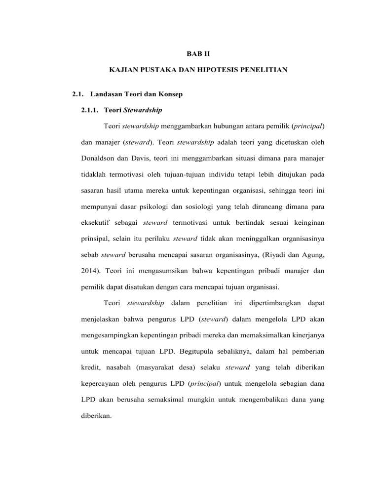 BAB II KAJIAN PUSTAKA DAN HIPOTESIS PENELITIAN 2.1. Landasan Teori dan Konsep 2.1.1. Teori Stewardship Teori stewardship menggambarkan hubungan antara pemilik (principal) dan manajer (steward). Teori stewardship adalah teori yang dicetuskan oleh Donaldson dan Davis, teori ini menggambarkan situasi dimana para manajer tidaklah termotivasi oleh tujuan-tujuan individu tetapi lebih ditujukan pada sasaran hasil utama mereka untuk kepentingan organisasi, sehingga teori ini mempunyai dasar psikologi dan sosiologi yang telah dirancang dimana para eksekutif sebagai steward termotivasi untuk bertindak sesuai keinginan prinsipal, selain itu perilaku steward tidak akan meninggalkan organisasinya sebab steward berusaha mencapai sasaran organisasinya, (Riyadi dan Agung, 2014). Teori ini mengasumsikan bahwa kepentingan pribadi manajer dan pemilik dapat disatukan dengan cara mencapai tujuan organisasi. Teori stewardship dalam penelitian ini dipertimbangkan dapat menjelaskan bahwa pengurus LPD (steward) dalam mengelola LPD akan mengesampingkan kepentingan pribadi mereka dan memaksimalkan kinerjanya untuk mencapai tujuan LPD. Begitupula sebaliknya, dalam hal pemberian kredit, nasabah (masyarakat desa) selaku steward yang telah diberikan kepercayaan oleh pengurus LPD (principal) untuk mengelola sebagian dana LPD akan berusaha semaksimal mungkin untuk mengembalikan dana yang diberikan. 2.1.2. Lembaga Perkreditan Desa Lembaga Perkreditan Desa (LPD) merupakan salah satu lembaga keuangan yang terdapat di Desa Pakraman. Melalui surat keputusan Gubernur Provinsi Bali No.3 Tahun 2007 menyebutkan bahwa LPD merupakan salah satu unsur kelembagaan keuangan Desa Pakraman yang berfungsi untuk mengelola potensi keuangan Desa Pakraman tersebut. Dalam menjalankan usahanya LPD dibimbing oleh LPLPDK (Lembaga Pemberdayaan Lembaga Perkreditan Desa Kabupaten/Kota) yang merupakan lembaga yang berfungsi untuk memberikan pendampingan teknis terkait dengan pemberdayaan LPD dan dikelola oleh pengurus yang bertanggung jawab kepada masyarakat desa. Pengurus LPD setidaknya terdiri dari ketua, sekretaris, dan bendahara yang dapat dilengkapi dengan sejumlah kepala bidang dan karyawan sesuai dengan kebutuhan LPD tersebut. LPD adalah lembaga keuangan dengan dua karakteristik yang unik yaitu sebagai lembaga yang dimiliki dan diatur oleh desa adat yang sepenuhnya terintergrasi ke dalam budaya Bali dan tidak seperti lembaga keuangan lain yang meliputi hampir semua desa adat di Bali dan luas mayoritas penduduknya, (Kusumayanti, 2014). Lembaga Perkreditan Desa (LPD) memiliki beberapa tujuan, yaitu untuk mendorong pembangunan ekonomi masyarakat desa melalui tabungan yang terarah serta penyaluran modal yang efektif, memberantas sistem ijon, gadai gelap dan lain-lain yang bisa disamakan dengan itu di daerah pedesaan, dapat menciptakan pemerataan dan kesempatan kerja bagi warga pedesaan, serta menciptakan daya beli dan melancarkan lalu lintas pembayaran dan pertukaran di desa (Surata, 2011). Berdasarkan Peraturan Daerah Provinsi Bali No.3 Tahun 2007, bidang usaha yang dijalankan LPD meliputi : 1) Menerima simpanan uang dari warga masyarakat desa dalam bentuk tabungan dan simpanan berjangka. 2) Memberikan pinjaman untuk kegiatan-kegiatan yang bersifat produktif pada sektor pertanian, industri/kerajinan kecil, perdagangan dan usaha-usaha lain yang dipandang perlu. 3) Usaha-usaha lain yang bersifat pengerahan dana desa. 4) Penyertaan modal pada unsur-unsur lain. 5) Menerima pinjaman-pinjaman dari lembaga keuangan. 2.1.3. Laporan Keuangan Laporan keuangan merupakan laporan yang memuat tentang informasi keuangan suatu organisasi. Perusahaan menerbitkan laporan keuangan dengan maksud memberikan informasi keuangannya kepada pihak internal dan eksternal perusahaan. Laporan keuangan bank merupakan laporan yang menggambarkan keadaan keuangan bank secara menyeluruh. Melalui laporan keuangan bank, dapat diketahui kondisi keuangan bank yang sesungguhnya, termasuk juga kelemahan dan kelebihan bank tersebut. Laporan yang disajikan suatu perusahaan, yang dalam hal ini lembaga perbankan pada periode tertentu bertujuan (Faud dan Rustan, 2005:13), sebagai berikut : 1) Memberikan informasi tentang posisi keuangan bank menyangkut harta bank, kewajiban bank. 2) Modal bank pada periode tertentu. 3) Memberikan informasi menyangkut laba rugi suatu bank pada periode tertentu. 4) Memberikan informasi bagi pihak-pihak yang berkepentingan dengan laporan keuangan yang disajikan suatu bank. 5) Memberikan informasi tentang performance suatu bank. Laporan keuangan ini dapat diterima oleh pihak-pihak tertentu, jika memenuhi syarat-syarat di bawah ini (Faud dan Rustan, 2005:18) : 1) Relevan Laporan keuangan yang disajikan harus sesuai dengan data yang ada kaitannya dengan transaksi yang dilakukan. 2) Jelas dan dapat dimengerti Laporan keuangan yang disajikan harus jelas dan dapat dimengerti oleh pemakai laporan keuangan 3) Dapat diuji kebenarannya Laporan keuangan yang disajikan datanya dapat diuji kebenarannya dan dapat dipertanggungjawabkan. 4) Netral Laporan yang disajikan harus dipergunakan oleh semua pihak. bersifat netral artinya dapat 5) Tepat waktu Laporan yang disajikan harus memiliki waktu pelaporan atau periode pelaporan yang jelas. 6) Dapat diperbandingkan Laporan keuangan yang disajikan dapat diperbandingkan dengan laporan-laporan sebelumnya, sebagai landasan untuk mengikuti perkembangan dari hasil yang dicapai. Untuk lebih memahami informasi yang terkandung dalam laporan keuangan maka perlu dilakukan analisis laporan keuangan. Analisis laporan keuangan berarti menguraikan pos-pos laporan keuangan menjadi unit informasi yang lebih kecil dan melihat hubungan yang bersifat signifikan atau yang mempunyai makna antara satu dengan yang lain, baik antara data kuantitatif maupun data non-kuantitatif dengan tujuan untuk mengetahui kondisi keuangan lebih dalam yang sangat penting dalam proses menghasilkan keputusan yang tepat (Harahap, 2010:190). Menurut Harahap, (2010:190), ke