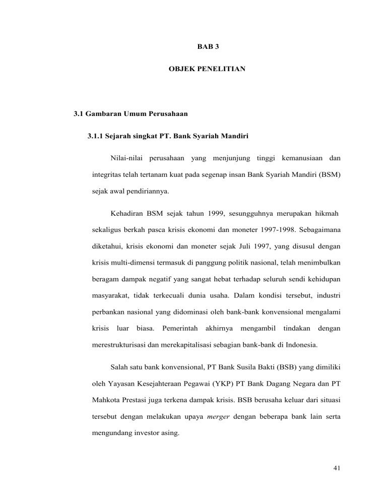 BAB 3 OBJEK PENELITIAN 3.1 Gambaran Umum Perusahaan 3.1.1 Sejarah singkat PT. Bank Syariah Mandiri Nilai-nilai perusahaan yang menjunjung tinggi kemanusiaan dan integritas telah tertanam kuat pada segenap insan Bank Syariah Mandiri (BSM) sejak awal pendiriannya. Kehadiran BSM sejak tahun 1999, sesungguhnya merupakan hikmah sekaligus berkah pasca krisis ekonomi dan moneter 1997-1998. Sebagaimana diketahui, krisis ekonomi dan moneter sejak Juli 1997, yang disusul dengan krisis multi-dimensi termasuk di panggung politik nasional, telah menimbulkan beragam dampak negatif yang sangat hebat terhadap seluruh sendi kehidupan masyarakat, tidak terkecuali dunia usaha. Dalam kondisi tersebut, industri perbankan nasional yang didominasi oleh bank-bank konvensional mengalami krisis luar biasa. Pemerintah akhirnya mengambil tindakan dengan merestrukturisasi dan merekapitalisasi sebagian bank-bank di Indonesia. Salah satu bank konvensional, PT Bank Susila Bakti (BSB) yang dimiliki oleh Yayasan Kesejahteraan Pegawai (YKP) PT Bank Dagang Negara dan PT Mahkota Prestasi juga terkena dampak krisis. BSB berusaha keluar dari situasi tersebut dengan melakukan upaya merger dengan beberapa bank lain serta mengundang investor asing. 41 Pada saat bersamaan, pemerintah melakukan penggabungan (merger) empat bank (Bank Dagang Negara, Bank Bumi Daya, Bank Exim, dan Bapindo) menjadi satu bank baru bernama PT Bank Mandiri (Persero) pada tanggal 31 Juli 1999. Kebijakan penggabungan tersebut juga menempatkan dan menetapkan PT Bank Mandiri (Persero) Tbk. sebagai pemilik mayoritas baru BSB. Sebagai tindak lanjut dari keputusan merger, Bank Mandiri melakukan konsolidasi serta membentuk Tim Pengembangan Perbankan Syariah. Pembentukan tim ini bertujuan untuk mengembangkan layanan perbankan syariah di kelompok perusahaan Bank Mandiri, sebagai respon atas diberlakukannya UU No. 10 tahun 1998, yang memberi peluang bank umum untuk melayani transaksi syariah (dual banking system). Tim Pengembangan Perbankan Syariah memandang bahwa pemberlakuan UU tersebut merupakan momentum yang tepat untuk melakukan konversi PT Bank Susila Bakti dari bank konvensional menjadi bank syariah. Oleh karenanya, Tim Pengembangan Perbankan Syariah segera mempersiapkan sistem dan infrastrukturnya, sehingga kegiatan usaha BSB berubah dari bank konvensional menjadi bank yang beroperasi berdasarkan prinsip syariah dengan nama PT Bank Syariah Mandiri sebagaimana tercantum dalam Akta Notaris: Sutjipto, SH, No. 23 tanggal 8 September 1999. Perubahan kegiatan usaha BSB menjadi bank umum syariah dikukuhkan oleh Gubernur Bank Indonesia melalui SK Gubernur BI No. 1/24/ KEP.BI/1999, 25 Oktober 1999. Selanjutnya, melalui Surat Keputusan Deputi Gubernur Senior Bank Indonesia No. 1/1/KEP.DGS/ 1999, BI menyetujui 42 perubahan nama menjadi PT Bank Syariah Mandiri. Menyusul pengukuhan dan pengakuan legal tersebut, PT Bank Syariah Mandiri secara resmi mulai beroperasi sejak Senin tanggal 25 Rajab 1420 H atau tanggal 1 November 1999. PT Bank Syariah Mandiri hadir, tampil dan tumbuh sebagai bank yang mampu memadukan idealisme usaha dengan nilai-nilai rohani, yang melandasi kegiatan operasionalnya. Harmoni antara idealisme usaha dan nilai-nilai rohani inilah yang menjadi salah satu keunggulan Bank Syariah Mandiri dalam kiprahnya di perbankan Indonesia. BSM hadir untuk bersama membangun Indonesia menuju Indonesia yang lebih baik. 3.1.2 Visi dan Misi VISI Bank Syariah Mandiri memiliki visi, yaitu : ”Menjadi Bank Syariah Terpercaya Pilihan Mitra Usaha.” MISI Sedangkan misi Bank Syariah Mandiri dalam menjalankan pengoperasiannya, sebagai berikut: 1. Mewujudkan pertumbuhan dan keuntungan yang berkesinambungan 2. Mengutamakan penghimpunan dana konsumer dan penyaluran pembiayaan pada segmen UMKM 3. Merekrut dan mengembangkan pegawai profesional dalam lingkungan kerja yang sehat 4. Mengembangkan nilai-nilai syariah universal 43 5. Menyelenggarakan operasional bank sesuai standar perbankan yang sehat. 3.1.3 Bidang Usaha Berdasarkan Undang-undang Nomor 7 tahun 1992, sebagai lembaga intermediasi. Berdasarkan undang-undang perbankan Indonesia Nomor 10 tahun 1998, melaksanakan kegiatan usaha berdasarkan prinsip syariah, termasuk kantor cabang dan atau kantor cabang pembantu dari suatu bank yang berkedudukan di luar negeri yang melaksanakan kegiatan usaha berdasarkan prinsip syariah. Kegiatan usaha tersebut, meliputi penghimpunan dana, pembiayaan dan layanan. 3.1.4 Produk-Produk Adapun produk-produk pada PT. Bank Syariah Mandiri, antara lain sebagai berikut: 1. Pembiayaan Consumer A. BSM Implan BSM Implan adalah pembiayaan konsumer dalam valuta rupiah yang diberikan oleh bank kepada karyawan tetap Perusahaan yang pengajuannya dilakukan secara massal (kelompok). B. Pembiayaan Peralatan Kedokteran Pembiayaan Peralatan Kedokteran adalah pemberian fasilitas pembiayaan kepada para profesional di bidang kedokteran/kesehatan untuk pembelian peralatan kedokteran. 44 C. Pembiayaan Edukasi BSM Pembiayaan Edukasi BSM adalah pembiayaan jangka pendek dan menengah yang digunakan untuk memenuhi kebutuhan uang masuk sekolah/perguruan tinggi/lembaga pendidikan lainnya atau uang pendidikan pada saat pendaftaran tahun ajaran/semester baru berikutnya dengan akad ijarah. D. Pembiayaan Dana Berputar Pembiayaan Dana Berputar adalah fasilitas pembiayaan modal kerja dengan prinsip musyarakah yang penarikan dananya dapat dilakukan sewaktu-waktu berdasarkan kebutuhan riil nasabah. E. Pembiayaan Kepada Pensiunan Pembiayaan kepada Pensiunan merupakan penyaluran fasilitas pembiayaan konsumer (termasuk untuk pembiayaan multiguna) kepada para pensuinan, dengan pembayaran angsuran dilakukan melalui pemotongan uang pensiun langsung yang diterima oleh bank setiap bulan (pensiun bulanan). F. Pembiayaan Umrah Pembiayaan Umrah adalah pembiayaan jangka pendek yang digunakan untuk memfasilitasi kebutuhan biaya perjalanan umrah seperti namun tidak terbatas untuk tiket, akomodasi dan persiapan biaya umrah lainnya dengan akad ij