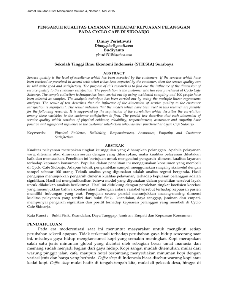Jurnal Ilmu dan Riset Manajemen Volume 4, Nomor 5, Mei 2015 PENGARUH KUALITAS LAYANAN TERHADAP KEPUASAN PELANGGAN PADA CYCLO CAFE DI SIDOARJO Dinny Peristiwati [email protected] Budiyanto [email protected] Sekolah Tinggi Ilmu Ekonomi Indonesia (STIESIA) Surabaya ABSTRACT Service quality is the level of excellence which has been expected by the customers. If the services which have been received or perceived in accord with what it has been expected by the customer, then the service quality can be said quite good and satisfactory. The purpose of this research is to find out the influence of the dimension of service quality to the customer satisfaction. The population is the customer who has ever purchased at Cyclo Cafe Sidoarjo. The sample collection technique has been carried out by using accidental sampling and 100 people have been selected as samples. The analysis technique has been carried out by using the multiple linear regressions analysis. The result of test describes that the influence of the dimension of service quality to the customer satisfaction is significant. The result indicates that the models which have been used in this research are feasible for the following research. It is supported by the acquisition of the correlation which describes the correlation among these variables to the customer satisfaction is firm. The partial test describes that each dimension of service quality which consists of physical evidence, reliability, responsiveness, assurance and empathy have positive and significant influence to the customer satisfaction who has ever purchased at Cyclo Cafe Sidoarjo. Keywords: Physical Evidence, Reliability, Responsiveness, Assurance, Empathy and Customer Satisfaction. ABSTRAK Kualitas pelayanan merupakan tingkat keunggulan yang diharapkan pelanggan. Apabila pelayanan yang diterima atau dirasakan sesuai dengan yang diharapkan, maka kualitas pelayanan dikatakan baik dan memuaskan. Penelitian ini bertujuan untuk mengetahui pengaruh dimensi kualitas layanan terhadap kepuasan konsumen. Populasi dalam penelitian ini menggunakan konsumen yang membeli di Cyclo Cafe Sidoarjo. Adapun teknik pengambilan sampel menggunakan sampling aksidental dengan sampel sebesar 100 orang. Teknik analisa yang digunakan adalah analisa regresi berganda. Hasil pengujian menunjukkan pengaruh dimensi kualitas pelayanan, terhadap kepuasan pelanggan adalah signifikan. Hasil ini mengindikasikan bahwa model yang digunakan dalam penelitian tersebut layak untuk dilakukan analisis berikutnya. Hasil ini didukung dengan perolehan tingkat koefisien korelasi yang menunjukkan bahwa korelasi atau hubungan antara variabel tersebut terhadap kepuasan pasien memiliki hubungan yang erat. Pengujian secara parsial menunjukkan masing-masing dimensi kualitas pelayanan yang terdiri dari bukti fisik, keandalan, daya tanggap, jaminan dan empati, mempunyai pengaruh signifikan dan positif terhadap kepuasan pelanggan yang membeli di Cyclo Cafe Sidoarjo. Kata Kunci : Bukti Fisik, Keandalan, Daya Tanggap, Jaminan, Empati dan Kepuasan Konsumen PENDAHULUAN Pada era moderenisasi saat ini menuntut masyarakat untuk mengikuti setiap perubahan sekecil apapun. Tidak terkecuali terhadap perubahan gaya hidup seseorang saat ini, misalnya gaya hidup mengkonsumsi kopi yang semakin meningkat. Kopi merupakan salah satu jenis minuman global yang dicintai oleh sebagian besar umat manusia dan memang sudah menjadi bagian dari gaya hidup. Kopi sangat mudah ditemukan, mulai dari warung pinggir jalan, cafe, maupun hotel berbintang menyediakan minuman kopi dengan variasi jenis dan harga yang berbeda. Coffee shop di Indonesia biasa disebut warung kopi atau kedai kopi. Coffee shop mulai hadir di tengah-tengah kita, mulai di pelosok desa, hingga di Jurnal Ilmu dan Riset Manajemen Volume 4, Nomor 5, Mei 2015 2 pusat perkotaan. Menikmati kopi saat ini menjadi hal yang sudah biasa ada di kota-kota besar. Di kota Sidoarjo sendiri semakin marak dengan banyaknya coffee shop baru yang berdiri dan tersebar di wilayah Sidoarjo, salah satunya adalah cylco Cafe . Cyclo Cafe membuka cafe yang menawarkan kesan santai, tenang dan nyaman untuk berkumpulnya konsumen dengan teman ataupun relasinya atau hanya sekedar ingin bersantai menikmati kopi yang disajikan. Lokasi yang dipilih pun sangat strategis yaitu di kawasan by pass Juanda dekat dengan bandara internasional. Dalam menghadapi lingkungan persaingan yang semakin kuat dan ketat, konsentrasi bisnis dibidang restoran memerlukan strategi khusus dalam menarik konsumen terutama dalam pengambilan keputusan untuk menggunakan jasa yang ditawarkan oleh perusahaan. Hal utama yang harus diprioritaskan oleh perusahaan adalah kepuasan konsumen agar dapat bertahan, bersaing dan menguasai pasar. Pimpinan harus mengetahui hal-hal apa saja yang dianggap penting oleh pelanggan dan berusaha menghasilkan kinerja sebaik mungkin, sehingga dapat memuaskan konsumen. Apabila knsumen merasa puas akan suatu produk dari suatu merek, maka yang umumnya terjadi konsumen akan terus menerus membeli dan menggunakannya. Dalam hal ini juga tidak menutup kemungkinan konsumen akan memberitahukan orang lain mengenai pengalamannya terhadap kualitas produk yang telah digunakannya. Sebaliknya, jika konsumen merasa tidak puas maka mereka cenderung akan beralih ke cafe lain. Kepuasan konsumen merupakan respons konsumen terhadap ketidaksesuaian antara tingkat kepentingan sebelumnya dan kinerja aktual yang dirasakannya setelah pemakaian (Rangkuti, 2007: 98). Salah satu faktor yang menentukan kepuasan konsumen adalah persepsi pelanggan mengenai kualitas layanan yang berfokus pada lima dimensi kualitas jasa, yaitu: bukti fisik, keandalan, daya tanggap, jaminan, empati. Peningkatan kualitas pelayanan dalam pemasaran jasa dilakukan dengan tujuan agar timbul nilai yang positif dalam benak konsumen, sehingga konsumen merasa tertarik untuk menggunakan jasa yang ditawarkan oleh perusahaan. Menurut Kotler (2008: 23), pelayanan merupakan setiap tindakan atau ke