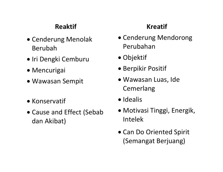 Reaktif Kreatif Cenderung Menolak Berubah Cenderung Mendorong Perubahan Iri Dengki Cemburu Objektif Mencurigai Berpikir Positif Wawasan Sempit Wawasan Luas, Ide Cemerlang Konservatif Idealis Cause and Effect (Sebab dan Akibat) Motivasi Tinggi, Energik, Intelek Can Do Oriented Spirit (Semangat Berjuang)