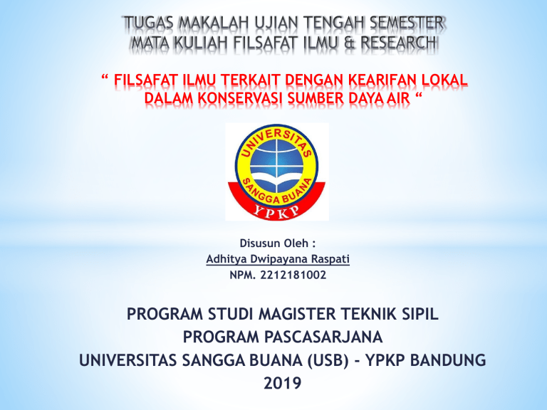 “ FILSAFAT ILMU TERKAIT DENGAN KEARIFAN LOKAL DALAM KONSERVASI SUMBER DAYA AIR “ Disusun Oleh : Adhitya Dwipayana Raspati NPM. 2212181002 PROGRAM STUDI MAGISTER TEKNIK SIPIL PROGRAM PASCASARJANA UNIVERSITAS SANGGA BUANA (USB) - YPKP BANDUNG 2019 BAB I PENDAHULUAN 1.1. Latar Belakang Sumber daya air (SDA) merupakan salah satu unsur yang sangat penting untuk keberlanjutan kehidupan makhluk hidup terutama manusia. Beberapa kampung adat yang konservatif terhadap SDA diantaranya Kampung Kuta Kabupaten Ciamis, Jawa Barat, Kampung Naga terletak Kabupaten Tasikmalaya, Jawa Barat serta Kampung Baduy terletak Kabupaten Lebak, Banten. 1.2. Rumusan Masalah Pandangan filsafat sebagai bentuk kearifan lokal dalam upaya menyelamatkan SDA yang terdapat di beberapa kampung adat. Bagaimana Implementasi kearifan lokal dalam menjaga kelestarian bidang SDA. 1.3. Tujuan Makalah Mengetahui bentuk asasi secara filsafat yang dilaksanakan dalam kearifan lokal sebagai upaya konservasi SDA yang terdapat di beberapa kampung adat. 1.4. Kegunaan Makalah Pemahaman kearifan lokal di beberapa kampung adat terkait dengan konservasi SDA. Sumber informasi tambahan untuk penelitian selanjutnya atau untuk kegiatan mitigasi bencana banjir dan tanah longsor. BAB II TINJAUAN PUSTAKA 2.1. Pengertian Filsafat Ilmu Secara sederhana dapat dikatakan bahwa filsafat ilmu adalah dasar yang menjiwai dinamika proses kegiatan memperoleh pengetahuan secara ilmiah (Ginting dan Situmorang, 2008) 2.2. Ontologi, Epistemologi dan Aksiologi Tahapan Uraian Ontologi (Hakikat Ilmu) Obyek apa yang telah ditelaah ilmu? Bagaimana wujud yang hakiki dari obyek tersebut? Bagaimana hubungan antara obyek tadi dengan daya tangkap manusia (seperti berpikir, merasa, dan mengindera) yang membuahkan pengetahuan? Bagaimana proses yang memungkinkan ditimbanya pengetahuan yang berupa ilmu? Bagaimana prosedurnya? Epistimologi (Cara Mendapatkan Pengetahuan) Bagaimana proses yang memungkinkan ditimbanya pengetahuan yang berupa ilmu? Bagaimana prosedurnya? Hal-hal apa yang harus diperhatikan agar kita mendapatkan pengetahuan dengan benar? Apa yang disebut dengan kebenaran itu sendiri? Apa kriterianya? Sarana/cara/teknik apa yang membantu kita dalam mendapatkan pengetahuan yang berupa ilmu? Aksiologi (Guna Pengetahuan) Untuk apa pengetahuan tersebut digunakan? Bagaiman kaitan antara cara penggunaan tersebut dengan kaidah-kaidah moral? Bagaimana penetuan obyek yang ditelaah berdasarkan pilihan-pilihan moral? Bagaimana kaitan antara teknik prosedural yang merupakan operasionalisasi metode ilmiah dengan norma-norma moral/profesional? Suriasumantri. 2005 2.3. Definisi/Gambaran Konseptual Contoh bentuk gambaran kerangka pemikiran dari sebuah kearifan lokal dalam konservasi SDA. Keterangan : : Meliputi : Mengasilkan BAB III PEMBAHASAN 3.1. Kepatuhan Sebagai Filsafat Kearifan Lokal Di Kampung Adat Bentuk kearifan lokal yaitu budaya kepatuhan dengan kata pamali. Pamali (tabu/bisa celaka) sebagai pranata sosial yang dapat mengendalikan perilaku manusia dalam berinteraksi dengan alam atau dengan sesamanya. Pamali merupakan prinsip yang berhubungan dengan konservasi sumber daya alam & merupakan norma adat yang sangat mengikat masyarakat karena sudah dilakukan secara turun-temurun. Kampung adat yang ada di Jawa Barat memiliki ciri khas yaitu mempunyai kesamaan dalam bentuk dan bahan fisik bangunan rumah karena mereka masih patuh dan taat pada aturan. 3.2. Implementasi Kearifan Lokal dalam Konservasi SDA Masyarakat adat memanfaatkan mata air permukaan untuk semua kebutuhan hidup dan dilarang oleh aturan adat untuk menggali sumur. Sumber daya air yang terdapat di dalam hutan yang dianggap keramat hanya digunakan untuk keperluan ritual tertentu saja & adanya pelarangan masuk kedalam hutan tanpa ijin ketua adat, merupakan bentuk konservasi hutan yang erat kaitannya dengan konservasi SDA . 3.3. Implikasi Kearifan Lokal Keberhasilan Kampung Naga, Kampung Baduy dan Kampung Kuta dalam Melestarikan Budaya Kata Pamali, yaitu: 1. Melestarikan rumah adat. 2. Melestarikan hutan lindung (Hutan Keramat) dan keanekaragaman hayati (Flora & Fauna endemik) yang ada di dalamnya. 3. Melestarikan sumber-sumber mata air melalui penanaman/pemeliharaan tanaman tahunan didalam hutan. 3.2. Filosopi Kepatuhan Berperan Dalam Konservasi SDA Konservasi Hutan Masyarakat di kampung adat tidak sembarangan memasuki hutan larangan karena mereka memiliki kepatuhan absolut terhadap kepercayaan akan ada sangsi adat jika memasuki hutan tanpa ijin dari ketua adat, hal tsb berdampak positif pada kelestarian hutan. Hutan merupakan salah satu elemen penting dalam siklus hidrologi, salah satu fungsi hutan yaitu eksistensi alami proses photosintesis -> reduksi carbon -> Suplly Oksigen -> Tekanan udara -> Kondensasi -> Optimalisasi Presipitasi (Embun & Hujan) Konservasi Sumber Daya Air (SDA) Keberadaan/kondisi hutan yang masih baik dapat mengendalikan runoff atau limpasan permukaan air hujan dipermukaan tanah, -> dedaunan yang rapat dapat menahan penetrasi hujan -> air diresapkan atau berinfiltrasi kedalam tanah secara perlahan-lahan sehingga permukaan tanah tidak tererosi -> Ruang Infiltrasi & Perkolasi -> Mata air akan terus terjaga Runoff yang dapat dikendalikan oleh hutan -> Mengurangi erosi permukaan tanah berupa sedimen yang terbawa ke sungai -> Kualitas air sungai tetap terjaga atau air sungai tidak keruh ketika musim hujan serta dapat meminimalisir sedimentasi dalam sungai. Pelarangan pembuatan sumur oleh masyarakat kampung adat -> Mempertahankan eksistensi air tanah yang berkonstribusi kontinuitas air tanah ke wilayah yang lebih rendah & mempertahankan tekanan hidrostatis air tanah -> Mempertahankan stabilitas tanah permukaan & akan menambah kesuburan tanah Desain rumah adat yang berbentuk rumah panggung -> Menjaga bidang resapan air, sehingga chatchment area tetap eksis. Rumah panggung tahan terhadap gempa . Mitigasi Bencana Masyarakat kampung adat secara tidak langsung mampu melakukan mitigasi bencana/mengurangi r