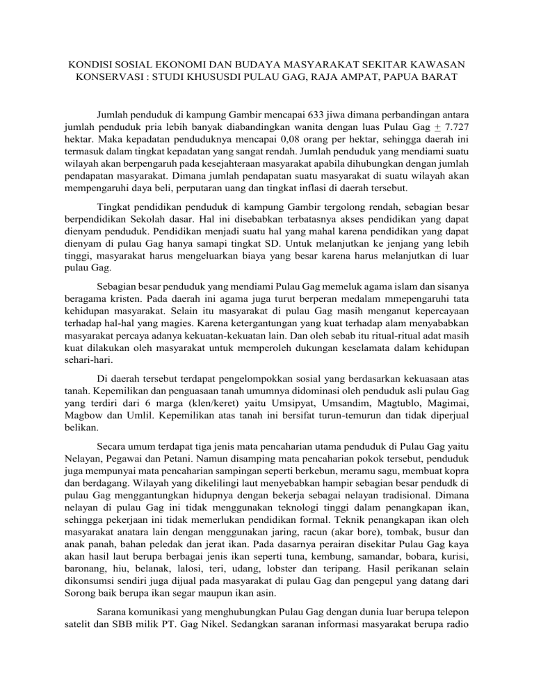 KONDISI SOSIAL EKONOMI DAN BUDAYA MASYARAKAT SEKITAR KAWASAN KONSERVASI : STUDI KHUSUSDI PULAU GAG, RAJA AMPAT, PAPUA BARAT Jumlah penduduk di kampung Gambir mencapai 633 jiwa dimana perbandingan antara jumlah penduduk pria lebih banyak diabandingkan wanita dengan luas Pulau Gag + 7.727 hektar. Maka kepadatan penduduknya mencapai 0,08 orang per hektar, sehingga daerah ini termasuk dalam tingkat kepadatan yang sangat rendah. Jumlah penduduk yang mendiami suatu wilayah akan berpengaruh pada kesejahteraan masyarakat apabila dihubungkan dengan jumlah pendapatan masyarakat. Dimana jumlah pendapatan suatu masyarakat di suatu wilayah akan mempengaruhi daya beli, perputaran uang dan tingkat inflasi di daerah tersebut. Tingkat pendidikan penduduk di kampung Gambir tergolong rendah, sebagian besar berpendidikan Sekolah dasar. Hal ini disebabkan terbatasnya akses pendidikan yang dapat dienyam penduduk. Pendidikan menjadi suatu hal yang mahal karena pendidikan yang dapat dienyam di pulau Gag hanya samapi tingkat SD. Untuk melanjutkan ke jenjang yang lebih tinggi, masyarakat harus mengeluarkan biaya yang besar karena harus melanjutkan di luar pulau Gag. Sebagian besar penduduk yang mendiami Pulau Gag memeluk agama islam dan sisanya beragama kristen. Pada daerah ini agama juga turut berperan medalam mmepengaruhi tata kehidupan masyarakat. Selain itu masyarakat di pulau Gag masih menganut kepercayaan terhadap hal-hal yang magies. Karena ketergantungan yang kuat terhadap alam menyababkan masyarakat percaya adanya kekuatan-kekuatan lain. Dan oleh sebab itu ritual-ritual adat masih kuat dilakukan oleh masyarakat untuk memperoleh dukungan keselamata dalam kehidupan sehari-hari. Di daerah tersebut terdapat pengelompokkan sosial yang berdasarkan kekuasaan atas tanah. Kepemilikan dan penguasaan tanah umumnya didominasi oleh penduduk asli pulau Gag yang terdiri dari 6 marga (klen/keret) yaitu Umsipyat, Umsandim, Magtublo, Magimai, Magbow dan Umlil. Kepemilikan atas tanah ini bersifat turun-temurun dan tidak diperjual belikan. Secara umum terdapat tiga jenis mata pencaharian utama penduduk di Pulau Gag yaitu Nelayan, Pegawai dan Petani. Namun disamping mata pencaharian pokok tersebut, penduduk juga mempunyai mata pencaharian sampingan seperti berkebun, meramu sagu, membuat kopra dan berdagang. Wilayah yang dikelilingi laut menyebabkan hampir sebagian besar pendudk di pulau Gag menggantungkan hidupnya dengan bekerja sebagai nelayan tradisional. Dimana nelayan di pulau Gag ini tidak menggunakan teknologi tinggi dalam penangkapan ikan, sehingga pekerjaan ini tidak memerlukan pendidikan formal. Teknik penangkapan ikan oleh masyarakat anatara lain dengan menggunakan jaring, racun (akar bore), tombak, busur dan anak panah, bahan peledak dan jerat ikan. Pada dasarnya perairan disekitar Pulau Gag kaya akan hasil laut berupa berbagai jenis ikan seperti tuna, kembung, samandar, bobara, kurisi, baronang, hiu, belanak, lalosi, teri, udang, lobster dan teripang. Hasil perikanan selain dikonsumsi sendiri juga dijual pada masyarakat di pulau Gag dan pengepul yang datang dari Sorong baik berupa ikan segar maupun ikan asin. Sarana komunikasi yang menghubungkan Pulau Gag dengan dunia luar berupa telepon satelit dan SBB milik PT. Gag Nikel. Sedangkan saranan informasi masyarakat berupa radio dan televisi yang hanya dimiliki beberapa orang warga (karyawan perusahaan) karena selain harus memakia antena parabola juga ketersediaan listrik yang sangat terbatas. Dan transaksi jual beli yang dilakukan oleh masyarakat cenderung menggunakan sistem barter dengan standar harga pasaran, karena kebetulan para pemilik lios juga merupakan pedagang mengumpul atau pengepul (colector).