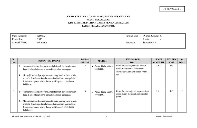 F : Kur-03.01.01 KEMENTERIAN AGAMA KABUPATEN PESAWARAN MAN 1 PESAWARAN KISI-KISI SOAL PILIHAN GANDA PENILAIAN HARIAN TAHUN PELAJARAN 2018/2019 Mata Pelajaran Kurikulum Alokasi Waktu No. Urut 1 : KIMIA : 2013 : 90 menit KOMPETESI DASAR 3.1 Memahami hakikat ilmu kimia, metode ilmiah dan keselamatan kerja di laboratorium serta peran kimia dalam kehidupan Jumlah Soal Penyusun BAHAN MATERI KELAS X Peran kimia dalam kehidupan. 4.1 Menyajikan hasil pengamatan tentang hakikat ilmu kimia, metode ilmiah dan keselamatan kerja dalam mempelajari kimia serta peran kimia dalam kehidupan n kimia dalam kehidupan. 2 3.1 Memahami hakikat ilmu kimia, metode ilmiah dan keselamatan kerja di laboratorium serta peran kimia dalam kehidupan X Peran kimia dalam kehidupan. : Pilihan Ganda : 30 Uraian : : Suwarno,S.Si INDIKATOR SOAL Siswa dapat Menjelaskan hakikat ilmu kimia melalui fenomenafenomena dalam kehidupan seharihari Siswa dapat menjelaskan peran ilmu kimia dalam memecahkan masalah global LEVEL BENTUK KOGNITIF SOAL LK2 PG LK1 PG 4.1 Menyajikan hasil pengamatan tentang hakikat ilmu kimia, metode ilmiah dan keselamatan kerja dalam mempelajari kimia serta peran kimia dalam kehidupan n kimia dalam kehidupan. Kisi-kisi Soal Penilaian Harian-2018/2019 1 MAN 1 Pesawaran No. SOAL 1 2 F : Kur-03.01.01 No. Urut 3 KOMPETESI DASAR 3.1 Memahami hakikat ilmu kimia, metode ilmiah dan keselamatan kerja di laboratorium serta peran kimia dalam kehidupan 4.1 Menyajikan hasil pengamatan tentang hakikat ilmu kimia, metode ilmiah dan keselamatan kerja dalam mempelajari kimia serta peran kimia dalam kehidupan n kimia dalam kehidupan. 4 3.1 Memahami hakikat ilmu kimia, metode ilmiah dan keselamatan kerja di laboratorium serta peran kimia dalam kehidupan BAHAN MATERI KELAS X Keselamatan kerja di Laboratorium, mengenal alat-alat, serta simbol-simbol bahan kimia 3.1 Memahami hakikat ilmu kimia, metode ilmiah dan keselamatan kerja di laboratorium serta peran kimia dalam kehidupan 3.2 Menganalisis perkembangan model atom Kisi-kisi Soal Penilaian Harian-2018/2019 No. SOAL 3 Keselamatan kerja di Laboratorium, mengenal alat-alat, serta simbol-simbol bahan kimia Siswa dapat membedakan variabel bebas, variabel control dan variabel terikat dalam suatu penelitian LK2 PG 4 X Keselamatan kerja di Laboratorium, mengenal alat-alat, serta simbol-simbol bahan kimia Siswa dapat menafsirkan symbolsymbol kimia berbahaya yang tercantum dalam kemasan bahan kimia LK1 PG 5 X Perkembangan model atom Siswa dapat Menjelaskan model atom Dalton, Thomson, Rutherford, Bohr, dan Mekanika Gelombang LK1 PG 6 4.1 Menyajikan hasil pengamatan tentang hakikat ilmu kimia, metode ilmiah dan keselamatan kerja dalam mempelajari kimia serta peran kimia dalam kehidupan n kimia dalam kehidupan. 6 LEVEL BENTUK KOGNITIF SOAL LK1 PG X 4.1 Menyajikan hasil pengamatan tentang hakikat ilmu kimia, metode ilmiah dan keselamatan kerja dalam mempelajari kimia serta peran kimia dalam kehidupan n kimia dalam kehidupan. 5 INDIKATOR SOAL Siswa dapat menjelaskan langkahlangkah metoda ilmiah 2 MAN 1 Pesawaran F : Kur-03.01.01 No. Urut 7 KOMPETESI DASAR 3.3 Menganalisis struktur atom berdasarkan teori atom Bohr dan teori mekanika kuantum. BAHAN MATERI KELAS X Struktur atom Bohr dan mekanika kuantum. INDIKATOR SOAL Siswa dapat menghitung jumlah proton, elektron, dan netron suatu atom unsur berdasarkan nomor atom dan nomor massanya LEVEL BENTUK KOGNITIF SOAL LK1 PG No. SOAL 7 8 3.3 Menganalisis struktur atom berdasarkan teori atom Bohr dan teori mekanika kuantum. X Isotop, isobar dan isoton Siswa dapat membedakan isotope, isobar dan isoton LK1 PG 8 9 4.3 Mengolah dan menganalisis struktur atom berdasarkan teori atom Bohr dan teori mekanika kuantum X Bilangan kuantum dan bentuk orbital. Siswa dapat menentukan harga ke 4 bilangan kuantum electron terluar dari suatu atom LK1 PG 9 X Konfigurasi elektron dan Diagram orbital Siswa dapat menuliskan konfigurasi electron suatu ion LK1 PG 10 X Konfigurasi elektron dan Diagram orbital Siswa dapat menggambarkan konfigurasi electron sesuai dengan aturan Hund LK1 PG 11 10 4.3 Menyajikan hasil analisis hubungan konfigurasi elektron dan diagram orbital untuk menentukan letak unsur dalam tabel periodik dan sifat-sifat periodik unsur. 11 4.3 Menyajikan hasil analisis hubungan konfigurasi elektron dan diagram orbital untuk menentukan letak unsur dalam tabel periodik dan sifat-sifat periodik unsur. Kisi-kisi Soal Penilaian Harian-2018/2019 3 MAN 1 Pesawaran F : Kur-03.01.01 No. Urut 12 KOMPETESI DASAR 4.4 Menyajikan hasil analisis hubungan konfigurasi elektron dan diagram orbital untuk menentukan letak unsur dalam tabel periodik dan sifat-sifat periodik unsur. 13 BAHAN MATERI KELAS X Golongan dan periode Golongan periode dan Siswa mengetahui perkembangan system periodic unsur LK1 PG 13 X Golongan periode dan Siswa dapat menyebutkan nama lain dari kelompok unsur golongan utama LK1 PG 14 X Sifat unsur keperiodikan Siswa dapat menganalisis grafik tentang sifat –sifat periodic unsurunsur LK1 PG 15 X Golongan periode Diiberikan gambar konfigurasi electron 2 buah ion siswa dapat menentukan golongan dan periodanya serta notasi atomnya dengan ditambahkan data tentang jumlah neutron dari ion-ion tersebut LK1 PG 16 4.5 Menyajikan hasil analisis hubungan konfigurasi elektron dan diagram orbital untuk menentukan letak unsur dalam tabel periodik dan sifat-sifat periodik unsur. 15 4.6 Menyajikan hasil analisis hubungan konfigurasi elektron dan diagram orbital untuk menentukan letak unsur dalam tabel periodik dan sifat-sifat periodik unsur. 16 4.7 Menyajikan hasil analisis hubungan konfigurasi elektron dan diagram orbital untuk menentukan letak unsur dalam tabel periodik dan sifat-sifat periodik unsur. Kisi-kisi Soal Penilaian Harian-2018/2019 No. SOAL 12 X 4.4 Menyajikan hasil analisis hubungan konfigurasi elektron dan diagram orbital untuk menentukan letak unsur dalam tabel periodik dan sifat-sifat periodik unsur. 14 INDIKATOR LEVEL BENTUK SOAL KOGNITIF SOAL Siswa dapat meny