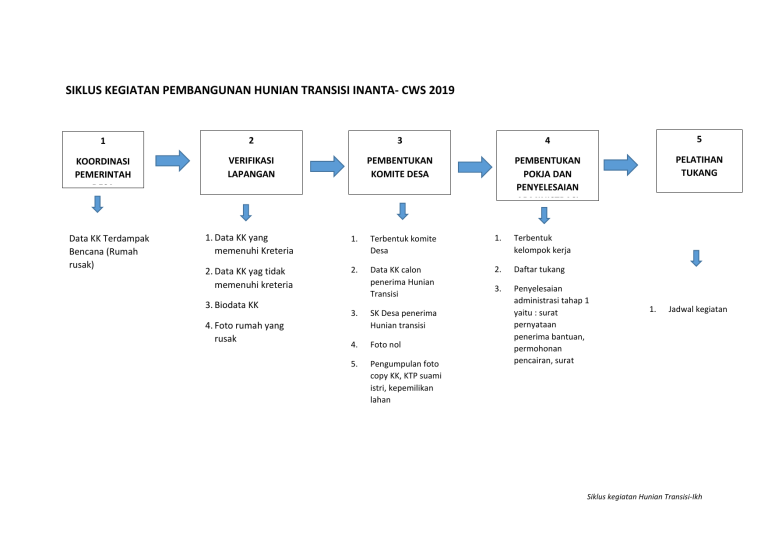 SIKLUS KEGIATAN PEMBANGUNAN HUNIAN TRANSISI INANTA- CWS 2019 1 2 3 4 5 KOORDINASI PEMERINTAH DESA VERIFIKASI LAPANGAN PEMBENTUKAN KOMITE DESA PEMBENTUKAN POKJA DAN PENYELESAIAN ADMINISTRASI PELATIHAN TUKANG Data KK Terdampak Bencana (Rumah rusak) 1. Data KK yang memenuhi Kreteria 1. Terbentuk komite Desa 1. Terbentuk kelompok kerja 2. Data KK yag tidak memenuhi kreteria 2. Data KK calon penerima Hunian Transisi 2. Daftar tukang 3. Penyelesaian administrasi tahap 1 yaitu : surat pernyataan penerima bantuan, permohonan pencairan, surat kuasa 3. Biodata KK 4. Foto rumah yang rusak 5. Foto pemilik rumah 3. SK Desa penerima Hunian transisi 4. Foto nol 5. Pengumpulan foto copy KK, KTP suami istri, kepemilikan lahan 1. Jadwal kegiatan Siklus kegiatan Hunian Transisi-Ikh Siklus kegiatan Hunian Transisi-Ikh