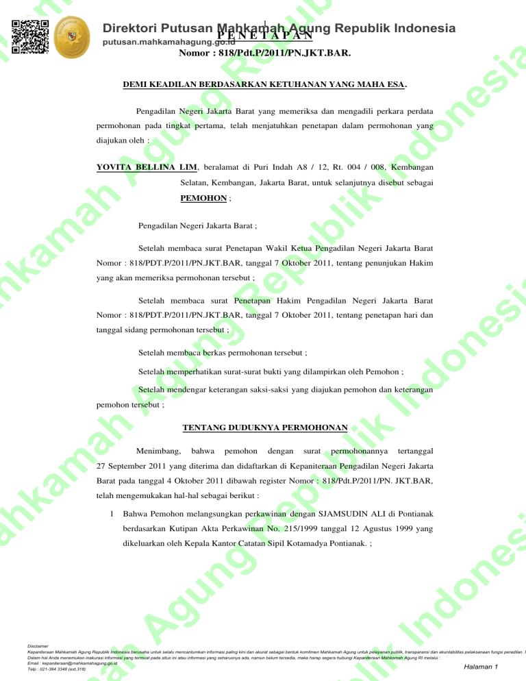 ep u b hk am 1 Direktori Putusan Mahkamah Agung Republik Indonesia PENETAPAN putusan.mahkamahagung.go.id R In do ne si a Nomor : 818/Pdt.P/2011/PN.JKT.BAR. ng DEMI KEADILAN BERDASARKAN KETUHANAN YANG MAHA ESA. Pengadilan Negeri Jakarta Barat yang memeriksa dan mengadili perkara perdata gu permohonan pada tingkat pertama, telah menjatuhkan penetapan dalam permohonan yang diajukan oleh : A YOVITA BELLINA LIM, beralamat di Puri Indah A8 / 12, Rt. 004 / 008, Kembangan ub lik PEMOHON ; ah Pengadilan Negeri Jakarta Barat ; Setelah membaca surat Penetapan Wakil Ketua Pengadilan Negeri Jakarta Barat Nomor : 818/PDT.P/2011/PN.JKT.BAR, tanggal 7 Oktober 2011, tentang penunjukan Hakim ep am ah k Selatan, Kembangan, Jakarta Barat, untuk selanjutnya disebut sebagai yang akan memeriksa permohonan tersebut ; In do ne si R Setelah membaca surat Penetapan Hakim Pengadilan Negeri Jakarta Barat Nomor : 818/PDT.P/2011/PN.JKT.BAR, tanggal 7 Oktober 2011, tentang penetapan hari dan A gu ng tanggal sidang permohonan tersebut ; Setelah membaca berkas permohonan tersebut ; Setelah memperhatikan surat-surat bukti yang dilampirkan oleh Pemohon ; Setelah mendengar keterangan saksi-saksi yang diajukan pemohon dan keterangan bahwa pemohon dengan surat permohonannya tertanggal ub Menimbang, lik TENTANG DUDUKNYA PERMOHONAN 27 September 2011 yang diterima dan didaftarkan di Kepaniteraan Pengadilan Negeri Jakarta Barat pada tanggal 4 Oktober 2011 dibawah register Nomor : 818/Pdt.P/2011/PN. JKT.BAR, 1 ep telah mengemukakan hal-hal sebagai berikut : Bahwa Pemohon melangsungkan perkawinan dengan SJAMSUDIN ALI di Pontianak R berdasarkan Kutipan Akta Perkawinan No. 215/1999 tanggal 12 Agustus 1999 yang on In d A gu ng es dikeluarkan oleh Kepala Kantor Catatan Sipil Kotamadya Pontianak. ; M h Disclaimer Kepaniteraan Mahkamah Agung Republik Indonesia berusaha untuk selalu mencantumkan informasi paling kini dan akurat sebagai bentuk komitmen Mahkamah Agung untuk pelayanan publik, transparansi dan akuntabilitas pelaksanaan fungsi peradilan. N Dalam hal Anda menemukan inakurasi informasi yang termuat pada situs ini atau informasi yang seharusnya ada, namun belum tersedia, maka harap segera hubungi Kepaniteraan Mahkamah Agung RI melalui : Email : [email protected] Telp : 021-384 3348 (ext.318) ik ah ka m ah pemohon tersebut ; Halaman 1 ep u b hk am Direktori Putusan Mahkamah Agung Republik Indonesia 2 Bahwa Perkawinan antara Pemohon dengan SJAMSUDIN ALI telah dikaruniai MARIA BLESSIA seorang anak perempuan lahir di Jakarta pada tanggal R • In do ne si a putusan.mahkamahagung.go.id 2 (dua) orang anak masing-masing bernama : 15 Agustus 2000, berdasarkan Kutipan Akta Kelahiran No. 2.904/U/JU/2000 yang • ng dikeluarkan oleh Kepala Kantor Catatan Sipil Wilayah Jakarta Utara ; IVO BLESSIUS seorang anak laki-laki lahir di Jakarta pada tanggal 22 April gu 2002, berdasarkan Kutipan Akta Kelahiran No. 1910/U/JB/2002 yang dikeluarkan oleh Kepala Kantor Catatan Sipil Wilayah Jakarta Barat ; Bahwa Pemohon berkeinginan menambahkan nama anak kedua dari nama IVO A 3 5 Bahwa Pemohon menambahkan nama anak tersebut dikarenakan supaya nama orang tua di nama belakangnya ; Bahwa untuk penambahan nama tersebut, maka harus ada penetapan dari Pengadilan Negeri setempat ; ep ah k am 4 BLESSIUS LEE ; ub lik ah BLESSIUS ditambah namanya LEE sehingga menyebut dirinya menjadi IVO Bahwa selanjutnya berdasarkan alasan dan uraian tersebut diatas Pemohon memohon kepada In do ne si R yang terhormat Ketua / Hakim Pengadilan Negeri Jakarta Barat berkenan memeriksa dan A gu ng mengabulkan permohonan Pemohon yaitu : 1 Menerima dan mengabulkan ermohonan Pemohon ; 2 Memberikan izin kepada Pemohon untuk menambah nama anaknya dari : IVO BLESSIUS ditambah LEE, sehingga menyebut namanya menjadi : IVO BLESSIUS LEE ; 3 Memerintahkan kepada Pemohon untuk melaporkan penambahan nama tersebut kepada pegawai Dinas Kependudukan dan Catatan Sipil yang berwenang, agar di catat pada Akta No. 1910/U/JB/2002, ub yang dikeluarkan oleh Kepala Kantor Catatan Sipil Wilayah Jakarta Barat ; ep 4 Biaya-biaya menurut hukum. ; ATAU; Apabila berpendapat lain, mohon Penetapan yang seadil-adilnya ; es on In d A gu ng M R ah ka m 22 April 2002, berdasarkan Kutipan Akta Kelahiran Jakarta pada tanggal lik ah Kelahiran atas nama IVO BLESSIUS LEE, laki-laki lahir di ik h Disclaimer Kepaniteraan Mahkamah Agung Republik Indonesia berusaha untuk selalu mencantumkan informasi paling kini dan akurat sebagai bentuk komitmen Mahkamah Agung untuk pelayanan publik, transparansi dan akuntabilitas pelaksanaan fungsi peradilan. N Dalam hal Anda menemukan inakurasi informasi yang termuat pada situs ini atau informasi yang seharusnya ada, namun belum tersedia, maka harap segera hubungi Kepaniteraan Mahkamah Agung RI melalui : Email : [email protected] Telp : 021-384 3348 (ext.318) Halaman 2 ep u b hk am 3 Direktori Putusan Mahkamah Agung Republik Indonesia Menimbang, bahwa pada hari persidangan yang telah ditetapkan, Pemohon telah R permohonannya. ; In do ne si a putusan.mahkamahagung.go.id datang sendiri dan setelah permohonannya dibacakan Pemohon menyatakan tetap pada Menimbang, bahwa untuk membuktikan dalil permohonannya tersebut, pemohon Fotocopy Kartu Tanda Penduduk NIK : 09.5208.131157.5507 atas nama SJAMSUDIN gu 1 ng telah mengajukan bukti-bukti surat berupa : ALI tertanggal 5 Desember 2006 (bukti P-1) ; 2 Fotocopy Kartu Tanda Penduduk NIK : 09.5107.620468.0355 atas nama YOVITA Fotocopy Kartu Keluarga No. 3801.059583 atas nama Kepala Keluarga ub lik ah 3 A BELLINA LIM tertanggal 02 Mei 2007 (bukti P-2) ; SJAMSUDIN ALI, alamat Puri Indah Blok. A8 / 12, Rt. 004 Rw. 008, Kelurahan 4 Fotocopy Kutipan Akta Kelahiran Nomor 1910/U/JB/2002 atas nama : IVO BLESSIUS tertanggal 10 Oktober 2011 (bukti P-4) ; 5 ep ah k am Kembangan Selatan, Kecamatan Kembangan, Kotamadya Jakarta Barat (bukti P-3) ; Fotocopy Kutipan Akta Perkawinan No. 215/1999 atas nama : SJAMSUDIN, ALI dan In do ne si 6 R YOVITA BELLINA, LIM, tertanggal