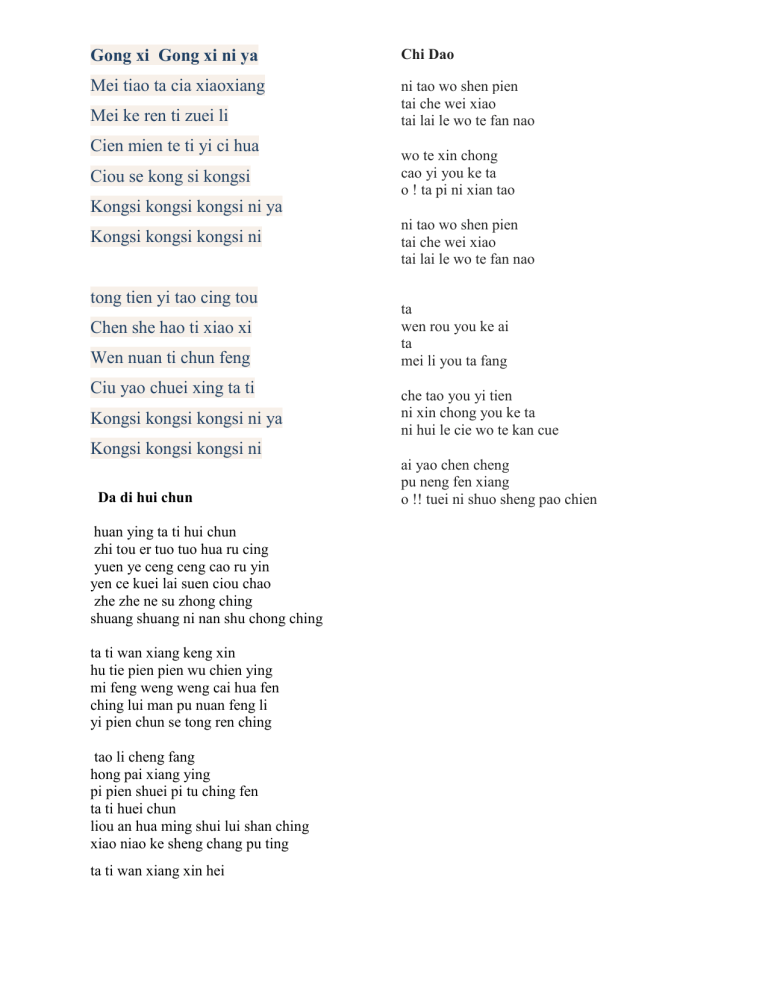 Gong xi Gong xi ni ya Chi Dao Mei tiao ta cia xiaoxiang ni tao wo shen pien tai che wei xiao tai lai le wo te fan nao Mei ke ren ti zuei li Cien mien te ti yi ci hua Ciou se kong si kongsi wo te xin chong cao yi you ke ta o ! ta pi ni xian tao Kongsi kongsi kongsi ni ya Kongsi kongsi kongsi ni tong tien yi tao cing tou Chen she hao ti xiao xi Wen nuan ti chun feng Ciu yao chuei xing ta ti Kongsi kongsi kongsi ni ya ni tao wo shen pien tai che wei xiao tai lai le wo te fan nao ta wen rou you ke ai ta mei li you ta fang che tao you yi tien ni xin chong you ke ta ni hui le cie wo te kan cue Kongsi kongsi kongsi ni Da di hui chun huan ying ta ti hui chun zhi tou er tuo tuo hua ru cing yuen ye ceng ceng cao ru yin yen ce kuei lai suen ciou chao zhe zhe ne su zhong ching shuang shuang ni nan shu chong ching ta ti wan xiang keng xin hu tie pien pien wu chien ying mi feng weng weng cai hua fen ching lui man pu nuan feng li yi pien chun se tong ren ching tao li cheng fang hong pai xiang ying pi pien shuei pi tu ching fen ta ti huei chun liou an hua ming shui lui shan ching xiao niao ke sheng chang pu ting ta ti wan xiang xin hei ai yao chen cheng pu neng fen xiang o !! tuei ni shuo sheng pao chien BA MA DE HUA Tào tienmíng pù kǎn chi shueì tānxīn nǐ hànliú ciāpèi kàn che nǐ kě'ài tào liúlèi wàngcì le ceci pípèi -REFFpǎopèi pǎopèi ài nǐ yī pèi pù chioú nǐ yǒu shénme cuòwéi cienkāng kuàilè kěi nǐ cāipéi che chioú nǐ wènxīn wúkueì ciāng ciāo'ér pào cài huái xīnsuān nán liao wèi niáng wǒ yǒu huà dueì nǐ yún pǎopèi pǎopèi cǒuchū pǎolěi nǐ yào ceci xiǎoxīn fángpèi (music) chuàn te chien kěi nǐ huāfèi tānxīn nǐ nienshū tài lèi tào yī tirn nǐ cǒuchū shèhueì tānxīn nǐ yǒufǒu cīhueì Repeat Reff zhè sheciè rúcǐ tiānpèi chienwàn pié pàntú'érfèi chien xīn wànkǔ pǎ nǐ cāipéi pà mā de kǔ zhetao méi EVERY ONE IS NO 1 Mei Tang wo ting tao chang sheng xiang chi lai te shr hou Wo zhetao wo you xiang chien cou le yi pu tanshe wo ye cengcing zhanpu chilai Wo te lu pu she ni te lu Wo te ku pu shi ni te ku Mei keren tou you chien cai te neng li pa yicie chi cheng fu Wo te lei pu shi ni te lei Wo te tong pu she ni te tong Yi yang te tienkong putong te kuang rong You yi yang te kan tong pu xuyao ziyuanzi ai te huang kong Zhi xu yao chenzhuo che yao xiang chien chong kao su ze ci tiensheng wo cai pi you yong Reff Everyone is no. 1 Zhi yao ni fan she pu wen neng pu neng Yong yi kouchi ciaohuan ni yisheng Yao yingcie weilai pu pi teng Everyone is no. 1 Cheng kong te micue cai ni kenpuken Liu zui re te han yong cuei zhen te xin Di yi ming shu yu mei ke ren Cuo zhe chen te shi ren sheng te yi pu fen ma tie tao you zhen te she cheng chang pi xu hao zou te lu ma Yi chien wo he ta men yi yang Xien zai wo he ni yi yang Yi wai ciu shi zai ren men He ni zi ci tou yi xiang pu tao xia cai huei fa sheng te Suo yi ching pu yao kuai pie ren keng pu yao kuai ze ci Repeat Reff Wo te shou pu she ni te shou Wo te kou pu she ni te kou Zhe yao yi tiao xin Kuang feng he pao yu tou bien cheng hao peng you pu xu yao zi yua zi ai te huang kong Zhr xu yao chen zhuo zhe yao xiang chien chong kao su ce ci tien sheng wo cai pi you yong xīnnián ya nián lián nián suìyuè yōuyōu guāngyīn rú jiàn Repeat Reff pu hai pa lu shang you tuo leng Zhe tao hai you yi tien yu wen Wo ye hui nu li kuang pen Repeat Reff Yi chien wo he ta men yi yang Xien cai ni yao he wo yi yang Repeat Reff huí kàn wǎngshìrúyān tòngkǔ xīnsuān 回看往事如烟痛苦辛酸 qīwàng cóng jīn wànshì rúyuàn 期望从今万事如愿 hè xīnnián zhù xīnnián 贺新年祝新年 xīnnián ya nián lián nián 新年呀年连年 yuàn dàjiā dōu guò ge tàipíng nián 愿大家都过个太平年 -----------Repeat @@ MING TIAN GENG HAO qīngqīng qiāo xǐng chénshuì di xīnlíng 轻轻敲醒沉睡的心灵 mànmàn zhāngkāi nǐ di yǎnjing 慢慢张开你的眼睛 kànkàn mánglù di shìjiè shìfǒu yīrán 看看忙碌的世界是否依然 gūdú di zhuàn ge bùtíng 孤独的转个不停 ------------ HE XINNIAN hè xīnnien zhù xīnnien xīnnien ya nien lien nien pàozhú shēng shēng cuī rén xiǎng yòunián hè xīnnián zhù xīnnián chūnfēng bù jiě fēngqíng 春风不解风情 chuīdòng shàonián de xīn 吹动少年的心 ràng zuórì liǎnshàng di lèihén 让昨日脸上的泪痕 suí jìyì fēnggān liao 随记忆风干了 táitóu xúnzhǎo tiānkōng di chìbǎng 抬头寻找天空的翅膀 hòuniǎo chūxiàn tā de yǐngjì 候鸟出现它的影迹 dàilái yuǎnchù di jīhuang wúqíng di zhànhuǒ 带来远处的饥荒无情的战火 yīrán cúnzài di xiāoxi 依然存在的消息 yùshān báixuě piāolíng 玉山白雪飘零 ránshāo shàonián de xīn 燃烧少年的心 shǐ zhēnqíng rónghuà chéng yīnfú 使真情溶化成音符 qīngsù yáoyuǎn di zhùfú 倾诉遥远的祝福 -----REFF----chàngchū nǐ di rèqíng 唱出你的热情 shēnchū nǐ shuāngshǒu 伸出你双手 ràng wǒ yōngbào zhe nǐ di mèng 让我拥抱着你的梦 ràng wǒ yōngyǒu nǐ zhēnxīn de miànkǒng 让我拥有你真心的面孔 ràng wǒmen di xiàoróng 让我们的笑容 chōngmǎn zhe qīngchūn di jiāo'ào 充满着青春的骄傲 -------------wèi míngtiān xiànchū qiánchéng di qídǎo 为明天献出虔诚的祈祷 shéi néng bù gù zìjǐ di jiāyuán 谁能不顾自己的家园 pāokāi jìyì zhōng di tóngnián 抛开记忆中的童年 shéi néng rěnxīn kàn nà zuórì de yōuchóu 谁能忍心看那昨日的忧愁 dàizǒu wǒmen de xiàoróng 带走我们的笑容 qīngchūn bùjiě hóngchén 青春不解红尘 yānzhī zhānrǎn liao huī 胭脂沾染了灰 ràng jiǔwéi bùjiàn de lèishuǐ 让久违不见的泪水 zīrùn liao nǐ di miànróng 滋润了你的面容 Repeat Reff wèi míngtiān xiànchū qiánchéng di qídǎo 为明天献出虔诚的祈祷 