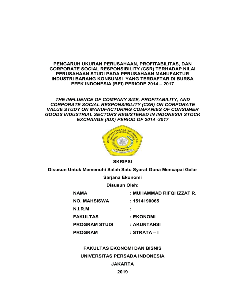 PENGARUH UKURAN PERUSAHAAN, PROFITABILITAS, DAN CORPORATE SOCIAL RESPONSIBILITY (CSR) TERHADAP NILAI PERUSAHAAN STUDI PADA PERUSAHAAN MANUFAKTUR INDUSTRI BARANG KONSUMSI YANG TERDAFTAR DI BURSA EFEK INDONESIA (BEI) PERIODE 2014 – 2017 THE INFLUENCE OF COMPANY SIZE, PROFITABILITY, AND CORPORATE SOCIAL RESPONSIBILITY (CSR) ON CORPORATE VALUE STUDY ON MANUFACTURING COMPANIES OF CONSUMER GOODS INDUSTRIAL SECTORS REGISTERED IN INDONESIA STOCK EXCHANGE (IDX) PERIOD OF 2014 -2017 SKRIPSI Disusun Untuk Memenuhi Salah Satu Syarat Guna Mencapai Gelar Sarjana Ekonomi Disusun Oleh: NAMA : MUHAMMAD RIFQI IZZAT R. NO. MAHSISWA : 1514190065 N.I.R.M : FAKULTAS : EKONOMI PROGRAM STUDI : AKUNTANSI PROGRAM : STRATA – I FAKULTAS EKONOMI DAN BISNIS UNIVERSITAS PERSADA INDONESIA JAKARTA 2019 BAB I PENDAHULUAN A. Latar Belakang Perkembangan dunia usaha di era globalisasi sangat pesat di Indonesia saat ini, hal tersebut dilihat berdasarkan perusahaan – perusahaan yang baru berdiri dengan diiringi persaingan yang sangat ketat dan kompetitif. Dengan hadirnya perusahaan- perusahaan membuat ketatnya persaingan dan menuntut manajemen perusahaan untuk manambah pengetahuan tentang manajemen keuangan. Pengetahuan tentang manajemen keuangan tersebut sangat penting bagi manajer guna mengetahui perkembangan perusahaan dan pengetahuan tersebut juga penting bagi investor dalam mengetahui masalah keuangan pada perusahaan tersebut. Analisis terhadap nilai perusahaan merupakan suatu hal yang harus dipertimbangkan dengan baik. Nilai perusahaan yang tinggi menjadi keinginan para pemilik modal, karena dengan nilai yang tinggi menunjukkan kemakmuran pemegang sahamnya juga tinggi. Memaksimalkan nilai perusahaan merupakan tujuan dari manajemen keuangan itu sendiri. Tujuan ini dapat dicapai apabila pelaksanaan fungsi manajemen keuangan dilakukan dengan teliti dan dapat mengingat setiap 1 keputusan keuangan yang diambil akan mempengaruhi keputusan keuangan lainnya yang berdampak terhadap nilai perusahaan. Nilai perusahaan dihitung dengan menggunakan PBV (Price Book Value). Rasio ini digunakan untuk mengukur nilai yang diberikan pasar keuangan kepada manajemen dan organisasi perusahaan sebagai sebuah perusahaan yang terus tumbuh (Sukimi, 2012) semakin tinggi nilai PBV, maka semakin tinggi nilai perusahaannya. Prasetyorini (2013:186) Ukuran perusahaan adalah suatu skala dimana dapat diklasifikasikan besar kecilnya perusahan menurut berbagai cara antara lain dengan aktiva, log size, nilai pasar saham, dan lain – lain. Besar kecilnya perusahan akan mempengaruhi kemampuan dalam menanggung risiko yang mungkin timbul dari berbagai situasi yang dihadapi perusahaan. Setiap perusahaan mempunyai ukuran yang berbeda – beda. Semakin besar ukuran perusahaan maka semakin mudah pula perusaan memperoleh sumber pendanaan melalui investor yang masuk. Perusahaan yang besar lebih diminati ketimbang perusahaan kecil. Perusahaan yang lebih besar menunjukkan perusahan mengalami perkembangan sehingga investor akan merespon positif dan nilai perusahaan akan meningkat. Arif Firmansyah dan Suwitho (2017) pengaruh ukuran perusahaan dan profitabilitas terhadap nilai perusahan melalui kebijakan deviden. Ukuran perusahaan berpengaruh negatif signifikasn terhadap nilai perusahaan. Ta’dir Eko Prasetia, perengkuan Tommy, dan Ivone S. Saerang (2014) struktur modal, ukuran perusahaan dan risiko perusahaan terhadap nilai perusahaan otomotif yang terdaftar di bei. Hasil penelitian 2 Ukuran perusahaan (Total Asset) secara parsial berpengaruh positif dan signifikan terhadap Nilai Perusahan. Brigham dan Houston (2003:107). Rasio Profitabilitas adalah sekelompok rasio yang menunjukkan gabungan efek – efek dari likuiditas, manajemen aktiva, dan hutang pada hasil – hasil oprasi. Rasio profitabilitas mengukur kemampuan perusahan dalam menghasilkan seberapa efisien perusahaan menggunakan asset dalam melakukan operasinya untuk menghasilkan keuntungan. Rasio profitabilitas merupakan hasil akhir dari sejumlah kebijakan dan keputusan yang dilakukan oleh perusahan. Variabel profitabilitas dipilih karena terdapat perbedaan hasil penelitian terdahulu,. Dari hasil penelitian yang dilakukan oleh Soliha dan Taswan (2002), mununjukkan bahwa profitabilitas berpengaruh positif terhadap nilai perusahaan. Yunita (2010), profitabilitas berpengaruh terhadap nilai perusahaan. Mahendra (2011), menunjukkan bahwa profitabilitas berpengaruh positif terhadap nilai perusahaan. Penelitian Indrajaya dan Setiadi (2011), mununjukkan bahwa negatif terhadap struktur modal karena apabila struktur modal turun makan nilai perusahaan juga akan turun. Corporate Social Responsibility adalah bentuk dimana tanngung jawab perusahaan dalam memperbaiki kesenjangan social dam kerusakan lingkungan yang terjadi akibat aktivitas operasional perusahaan. Semakin banyak bentuk pertanggung jawaban yang dilakukan perusahan terhadap lingkungannya, makan image perusahaan menjadi meningkat. Investor lebih memilih perusahaan yang memiliki citra yang baik di masyarakat karena semakin baiknya citra perusahaan, loyalitas konsumen 3 semakin tinggi sehingga dalam dalam jangka pendek dan jangka panjang penjualan perusahaan akan membaik. Jika perusahan berjalan lancar maka nilai saham perusahan akan meningkat. Hal ini akan mempengaruhi pola pikir masyarakat dalam menentukan dan memilih produk yang akan mereka konsumsi. Sekarang, masyarakat cenderung untuk memilih produk yang di produksi oleh perusahaan yang peduli terhadap lingkungan atau melaksanakan Corporate Social Responsibility. Corporate Social Responsibility mempunyai peran dalam meningkatkan nilai perusahaan dengan cara melakukan berbagai aktivitas sosial dilingkungan sekitarnya. Meningkatnya nilai perusahaan yang tinggi dapat meningkatkan kemakmuran bagi para pemegang saham, sehingga para pemegang saham akan menginvestasikan modalnya kepada perusahaan tersebut (Haruman. T,2008). Rustiarini (2010) mengungkapkan meningkatkan suatu nilai menyatakan informasi perusahaan