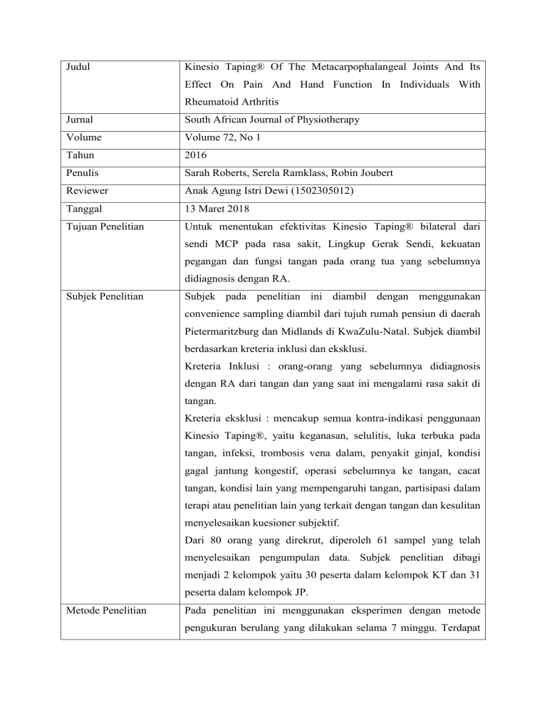 Judul Kinesio Taping® Of The Metacarpophalangeal Joints And Its Effect On Pain And Hand Function In Individuals With Rheumatoid Arthritis Jurnal South African Journal of Physiotherapy Volume Volume 72, No 1 Tahun 2016 Penulis Sarah Roberts, Serela Ramklass, Robin Joubert Reviewer Anak Agung Istri Dewi (1502305012) Tanggal 13 Maret 2018 Tujuan Penelitian Untuk menentukan efektivitas Kinesio Taping® bilateral dari sendi MCP pada rasa sakit, Lingkup Gerak Sendi, kekuatan pegangan dan fungsi tangan pada orang tua yang sebelumnya didiagnosis dengan RA. Subjek Penelitian Subjek pada penelitian ini diambil dengan menggunakan convenience sampling diambil dari tujuh rumah pensiun di daerah Pietermaritzburg dan Midlands di KwaZulu-Natal. Subjek diambil berdasarkan kreteria inklusi dan eksklusi. Kreteria Inklusi : orang-orang yang sebelumnya didiagnosis dengan RA dari tangan dan yang saat ini mengalami rasa sakit di tangan. Kreteria eksklusi : mencakup semua kontra-indikasi penggunaan Kinesio Taping®, yaitu keganasan, selulitis, luka terbuka pada tangan, infeksi, trombosis vena dalam, penyakit ginjal, kondisi gagal jantung kongestif, operasi sebelumnya ke tangan, cacat tangan, kondisi lain yang mempengaruhi tangan, partisipasi dalam terapi atau penelitian lain yang terkait dengan tangan dan kesulitan menyelesaikan kuesioner subjektif. Dari 80 orang yang direkrut, diperoleh 61 sampel yang telah menyelesaikan pengumpulan data. Subjek penelitian dibagi menjadi 2 kelompok yaitu 30 peserta dalam kelompok KT dan 31 peserta dalam kelompok JP. Metode Penelitian Pada penelitian ini menggunakan eksperimen dengan metode pengukuran berulang yang dilakukan selama 7 minggu. Terdapat pembagian subjek menjadi 2 kelompok. Kelompok Kinesio Taping® (KT group) menerima empat aplikasi Kinesio Taping® pada MCP joint dan kelompok lokakarya JP (JP group) menerima empat lokakarya JP. Kinesio Tape® dipakai selama 3 hari dalam seminggu dengan empat aplikasi selama proses pengumpulan data. Untuk kelompok kontrol, lokakarya perilaku pendidikan JP 2 jam dijalankan mingguan selama 4 minggu. Tiga tindakan pre-test dan empat tindakan post-test dilakukan setiap minggu, mengukur deviasi ulnaris, kekuatan genggaman dan nyeri. Selain itu, peserta menyelesaikan tindakan subjektif pada minggu 1, 3 dan 7. Serta dilakukan juga dua penilaian pra-intervensi dan satu penilaian post-intervensi untuk Kuesioner Hasil Tangan Michigan (MHQ). Definisi Operasional Rheumatoid Arthritis adalah penyakit sistemik kronis yang Variabel Dependen menyerang tangan secara bilateral, mengakibatkan radang, nyeri, ketidakstabilan sendi, kekuatan pegangan berkurang dan kesulitan fungsi. Cara & Alat Mengukur Pada subjek penelitian dengan kreteria inklusinya yaitu individu Variabel Dependen yang telah didiagnosa menderita RA pada tangan dengan keluhan nyeri, keterbatasan LGS, penurunan kekuatan dan fungsi tangan. Cara dan alat mengukur variabel dependen tersebut adalah : 1. Lingkup Gerak Sendi-MCP Ulnar Deviasi Ulnar deviasi bilateral MCP joint dinilai secara dorsal dengan menggunakan goniometer plastik setinggi 15 cm dengan kepala 360 derajat. Ulnar deviasi dari masingmasing sendi MCP di kedua tangan dinilai setiap minggu selama 7 minggu. 2. Kekuatan Genggaman Kekuatan genggaman bilateral diukur dengan menggunakan Jamar Hydraulic Hand Dynamometer yang dikalibrasi. Ini mengukur kekuatan pegangan isometrik pada skala ganda dari 0 sampai 90 kg atau 0 sampai 200 pound. Posisi pengujian standar digunakan yang mengharuskan peserta duduk, bahu diimbangi, lengan bawah di netral dan siku tertekuk sampai 90 derajat dan posisi pergelangan tangan dipilih sendiri oleh peserta. 3. Fungsional Tangan MHQ mengukur fungsi tangan bilateral, ADL, nyeri, kinerja kerja, estetika dan kepuasan pasien dengan fungsi tangan. Skor MHQ keseluruhan dihitung dengan menggunakan semua bagian yang dicetak. Skor dilaporkan sebagai persentase, dengan skor yang lebih tinggi menunjukkan kinerja yang lebih baik di area tersebut. Peserta melengkapi MHQ pada minggu 1, 3 dan 7. 4. Nyeri (VAS) VAS 100 mm digunakan untuk menilai rasa sakit dimana 0 tidak menunjukkan rasa sakit dan 10 mewakili rasa sakit terburuk yang dialami peserta. Peserta diminta untuk menunjukkan pada VAS rata-rata rasa sakit yang mereka alami di tangan mereka selama seminggu terakhir. Selain itu, setiap peserta diminta untuk menunjukkan, pada diagram sebuah tangan, di mana mereka telah merasakan rasa sakit di tangan mereka. Pengukuran VAS dilakukan setiap minggu. Definisi Operasional Kinesio Taping adalah pita proprioseptif yang tersusun dari untai Variabel Independen elastis polimer dan serat kapas (Kase, Wallis & Kase 2003). Sifatsifat taping itu, yaitu Kinesio® Tex GoldTM (selanjutnya disebut pita kaset), adalah sebagai berikut: ketebalan pita diatur untuk meniru ketebalan epidermis pada kulit untuk mencegah rangsangan sensorik yang tidak perlu melalui berat pita. Langkah-Langkah Langkah-langkah penelitian ini adalah : Penelitian 1. Menentukan subjek penelitian yang diambil dengan menggunakan convience sampling. Diperoleh 61 sampel dari 80 sampel penderita RA pada 2 kelompok yang telah dibagi. Kelompok KT (n=30) sebagai kelompok eksperimen dan kelompok JP (n=31) sebagai kelompok kontrol . 2. Semua sampel telah mengisi informed consent, kuisioner dan MHQ. 3. Tiga langkah pre-test dan empat langkah post-test MHQ, deviasi ulnaris, kekuatan pegangan dan VAS diselesaikan untuk setiap peserta dalam kelompok KT dan JP. Langkahlangkah ini diselesaikan pada hari yang sama, setiap minggu sekitar waktu yang hampir bersamaan. Langkah-langkah prauji selesai selama 3 minggu sebelum melakukan intervensi. 4. Kinesio Taping digunakan untuk kelompok KT dimulai pada minggu ke 3 dari periode pengumpulan data. Setiap peserta menggunakan taping empat kali selama 4 minggu, dan taping itu dipakai selama 3 hari pada setiap kesempatan. 5. Taping digunakan dibagian atas sendi MCP secara bilateral karena persentase keterlibatan sendi MCP yang lebih tin