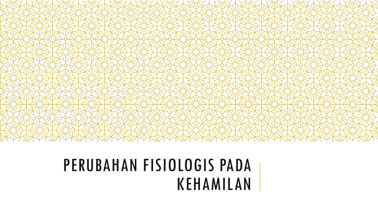 PERUBAHAN FISIOLOGIS PADA KEHAMILAN PERUBAHAN FISIOLOGIS Meliputi: •Endokrin •Adaptasi anatomis •Kulit •Metabolik •Kardiovaskuler dan respirasi •Hematologi dan imunologi •Sistem kemih •Sistem pencernaan PERUBAHAN ENDOKRIN HCG Human chorionic gonadotropin disekresikan sel sinsitiotrofoblas bersamaan dengan berkembangnya sel trofoblas. Kadar dalam darah dapat diukur pada fertilisasi hari 8-9, setelah blastokista menempel di uterus. Memuncak pd mgg ke 10-12 dan turun kembali mgg 12-16, kemudian kadarnya stabil. Memiliki efek seperti LH: memelihara dan merangsang korpus luteum menghasilkan estrogen dan progesterone. Pada janin laki-laki memiliki efek seperti ICSH: merangsang testis mensekresikan testosterone. ESTROGEN Dihasilkan korpus luteum dibawah pengaruh HCG. Korpus luteum akan menghilang mgg 13-17, selanjutnya produksi estrogen digantikan plasenta. Sel sinsitiotrofoblas plasenta mengkonversi DHEA dan 16-OH DHEA menjadi estrogen. Selama kehamilan, kadar estrogen yang tinggi mengakibatkan: •Mencegah menstruasi dan memelihara korpus luteum. •Perbesaran uterus. •Perbesaran mammae dan pertumbuhan struktur duktus pada mammae. •Perbesaran genitalia eksterna. •Relaksasi lig. pelvis, sehingga sendi sakroiliaka menjadi lebih lemas dan simfisis pubis menjadi lebih elastis (relaksasi pintu panggul). PROGESTERON Disekresikan bersama estrogen. Fungsi progesterone: •Merangsang perkembangan sel decidua di endometrium yang berfungsi memenuhi kebutuhan nutrisi pada embrio awal. •Mengurangi kontraktilitas uterus wanita hamil, mencegah kontraksi intrauterine yang dapat menyebabkan abortus spontan. •Meningkatkan sekresi tuba falopi dalam pemenuhan nutrisi morula •Membantu mempersiapkan laktasi. PERUBAHAN ENDOKRIN LAIN Gl. Hipofisis ant: sekresi kortikotropin, tirotropin, prolactin meningkat; FSH LH ditekan hormon seks. Adrenal: Kortikosteroid meningkat: mobilisasi as. Amino u/ sintesis protein fetus, aldosterone menyebabkan retensi air dan Na serta hypokalemia. Tiroid: sekresi tiroksin meningkat, diakibatkan rangsangan tirotropin, HCG dan HCT. Paratiroid: peningkatan PTH u/ osifikasi janin. Relaksin: disekresikan korp. Luteum dan plasenta, fungsi melemaskan lig. Simfisis pubis dan sbg vasodilator. MSH: peningkatan sekresi o/ hipofisis ant., menyebabkan hiperpigmentasi pd areola, kloasma gravidarum, dan linea nigra. ADAPTASI ANATOMIS Genital: peningkatan vaskularisasi dan ukuran. •Hiperplasia uterus: tinggi (7cm > 35cm); berat (30-50 g > 1000 g); hipertrofi lig. Uterii. •Serviks: peningkatan sekresi, pembentukan operculum. •Vulva dan vagina: peningkatan vaskularitas. •Relaksasi sendi pelvis dan lig. Pelvis. Mammae: membesar dan vaskularitas meningkat, areola menghitam, muncul tuberkel Montgomery, KULIT Peningkatan MSH: •Kloasma gravidarum •Linea nigra Striae gravidarum •Krn peregangan dinding abdomen. •Rupture serat elastis subkutan. •Warna merah muda, akan berubah menjadi putih. METABOLIK •BMR > 15% krn kombinasi perubahan endokrin. •Kehamilan bersifat hiperlipidemik dan glukosurik. Sensitivitas insulin turun a/ perubahan hormonal. GD naik u/ nutrisi fetus. •Keseimbangan asam basa turun (155 mEq/L > 145 mEq/L) krn hemodilusi. •Kebutuhan protein wanita hamil naik (0,5 g/kg BB atau sebutir telur ayam sehari). •Kebutuhan zat mineral untuk ibu hamil: 1. Kalsium, 1.5 g setiap hari, 30-40 g u/ osifikasi janin 2. Fosfor, rata-rata 2 g sehari. 3. Zat besi, 30-50 mg/hari. PENINGKATAN BERAT BADAN Berat bumil meningkat 11-16 kg, terutama pd trimester 2 dan 3. ~3.6 kg fetus ~2 kg kg cairan amnion, plasenta, and membrane fetal. ~1.3 kg perbesaran uterus ~1 kg perbesaran mammae ~2 kg dari retensi cairan di ECF dan plasma ~1-6 kg akumulasi lemak KARDIO & RENAL Vol. darah naik 1-2 L: •a/ aktv. Sistem RAA o/ progesteron •Hemodilusi > anemia fisiologis •CO dan tensi naik •Pd pertengahan-akhir kehamilan: penekanan IVC o/ uterus menyebabkan hipotensi postural (pd posisi supine) Pd renal: •GFR naik ~50% a/ vasodilatasi pb. darah renal o/ relaxin dan NO •Kapasitas reabsorpsi Na dan air naik RESPI Volume respirasi / menit naik (~50%): •a/ progesterone meningkatkan sensitivitas medulla thd CO2 •a/ BMR naik; kebutuhan oksigen naik (~20%) •Penekanan uterus thd diafragma > RR naik •VT naik, FRC turun HEMATOLOGI •Leukositosis (PMN) memuncak pd mgg 33 seiring kenaikan estrogen •Fungsi limfosit ditekan •Hct turun, anemia maternal •Peningkatan faktor koagulasi dan aktv. Fibrinolitik, kec. Ketika melahirkan SISTEM KEMIH Frekuensi mikturisi meningkat: •Desakan janin thd VU •Peningkatan vol. cairan total •Peningkatan GFR Output menurun: •a/ peningkatan absorpsi o/ RAAS SISTEM GI Trimester 1 •Mual dan muntah; morning sickness •Peningkatan salivasi •Pica a/ def. zat besi Trimester 2 & 3; a/ penekanan o/ uterus: •Konstipasi a/ pengaruh progesteron •Heartburn a/ relaksasi LES Hepar: sintesis fibrinogen, albumin, globulin naik