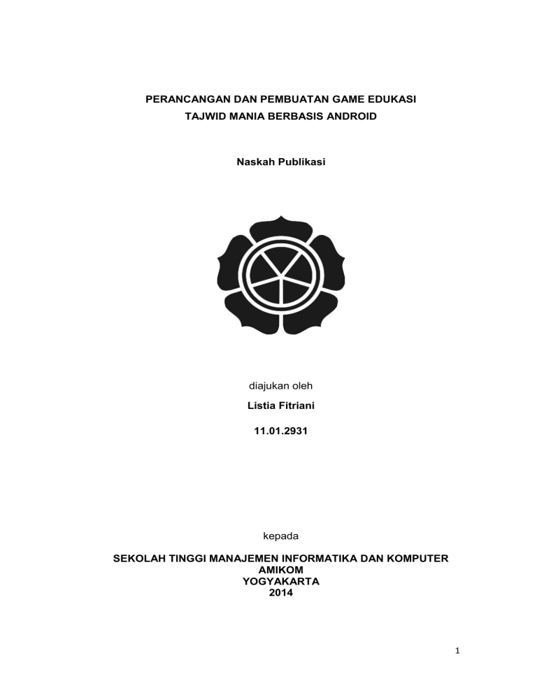 PERANCANGAN DAN PEMBUATAN GAME EDUKASI TAJWID MANIA BERBASIS ANDROID Naskah Publikasi diajukan oleh Listia Fitriani 11.01.2931 kepada SEKOLAH TINGGI MANAJEMEN INFORMATIKA DAN KOMPUTER AMIKOM YOGYAKARTA 2014 1 2 DESIGN AND MAKING OF EDUCATIONAL GAME TAJWEED MANIA BASED ANDROID PERANCANGAN DAN PEMBUATAN GAME EDUKASI TAJWID MANIA BERBASIS ANDROID Listia Fitriani Emha Taufiq Luthfi Jurusan Teknik Informatika STMIK AMIKOM YOGYAKARTA ABSTRACT The development of information technology is an important role for human life. with the development of information technology people can easily get the information and people can easily perform daily activities with the help of existing technologies . Technology brings people to look beyond the outside world , open horizons of thinking , as well as build a creativity to create new things. One technology that is now the fastest growing tech gadgets such as smartphones and tablet computers using the Android operating system . This makes the system a number of computerized educational game more easy to be obtained and used by all people , especially users of the gadget . Educational games are one type of game that is used to provide learning through the media to its unique and interesting game . By using the Unity 3D program which is a program to design and animation in Game Design and Development Education " Tajweed Mania " Based Android becomes more attractive so that the user does not feel bored in the study . With the support of a computerized system based educational game development can be realized and implemented within the gadget , thus creating an entertainment at the same time learning more attractive , efficient , effective , and efficient. Keywords: Smartphone, Android, Game Education, Tajweed Mania, Unity 3D 3 1. Pendahuluan 1.1 Latar Belakang Masalah Perkembangan Teknologi Informasi sangat berperan penting bagi kehidupan manusia. dengan adanya perkembangan Teknologi Informasi manusia dapat dengan mudah mendapatkan informasi dan manusia dapat dengan mudah melakukan kegiatan sehari-hari dengan bantuan teknologi yang ada. Teknologi membawa manusia melihat lebih jauh dunia luar, membuka wawasan berfikir, serta membangun sebuah kreativitas untuk menciptakan hal-hal baru. Salah satu teknologi yang saat ini berkembang sangat pesat adalah teknologi yang berupa smartphone terutama yang berbasis Android. Android adalah sistem operasi yang berbasis Linux untuk telepon seluler seperti smartphone dan komputer tablet. Android menyediakan platform terbuka bagi para pengembang untuk menciptakan aplikasi mereka sendiri untuk digunakan oleh bermacam piranti bergerak. Game merupakan salah satu media hiburan yang menjadi pilihan masyarakat untuk menghilangkan kejenuhan atau hanya untuk sekedar mengisi waktu luang. Selain menjadi media hiburan, game juga dapat menjadi sebuah media pembelajaran untuk meningkatkan perkembangan otak seseorang. Game edukasi memberikan kesempatan yang baik untuk merangsang pemikiran anak-anak. Game Edukasi adalah salah satu jenis game yang digunakan untuk memberikan pembelajaran kepada penggunanya melalui media permainan yang mudah di pahami. Pembelajaran ilmu tajwid yang interaktif menggunakan media-media elektronik saat ini seperti game edukasi masih jarang ditemui, bahkan game edukasi yang bertemakan pembelajaran tentang Ilmu Tajwid belum tersedia. Game edukasi ilmu tajwid ini dilakukan untuk memelihara bacaan Al-Qur’an dari kesalahan dan perubahan serta memelihara lisan dari kesalahan dalam membacanya. Dengan adanya beberapa permasalahan diatas, maka penulis memilih judul “PERANCANGAN DAN PEMBUATAN GAME EDUKASI TAJWID MANIA BERBASIS ANDROID” yang diharapkan dapat memberikan pendidikan, kemudahan dan hiburan yang lebih menarik, efisien, efektif, dan berdaya guna. 1.2 Rumusan Masalah Berdasarkan latar belakang permasalahan yang telah diuraikan diatas, dapat disimpulkan bahwa permasalahan yang dihadapi yaitu Bagaimana merancang dan membuat sebuah game edukasi Tajwid Mania berbasis Android. 1.3 Batasan Masalah Tugas akhir ini membatasi permasalahan dalam perancangan dan pembuatan game edukasi Tajwid Mania berbasis Android. Batasan masalah tersebut adalah sebagai berikut : 4 1. Game ini hanya dapat dimainkan secara single player 2. Aplikasi ini ditujukan khususnya untuk usia 7-12 tahun. 3. Aplikasi ini mencakup pengenalan tentang Ilmu Tajwid yaitu NUN SUKUN dan TANWIN (IDH-HAR CHALQI, ID-GHOM BI-GHUNNAH, ID-GHOM BILA GHUNNAH, IQLAB, IKHFAA’) 4. Aplikasi yang dibangun berbasis Android versi 2.3 (Gingerbread) ke atas. 5. Game edukasi tajwid mania ini dibuat dengan menggunakan bahasa pemrograman C# melalui perangkat lunak monoDevelop, Unity sebagai game engine-nya dan Orthello 2D sebagai frameworknya. 1.4 Tujuan Penelitian Adapun tujuan dari penelitian ini adalah : 1. Merancang dan membuat game edukasi Tajwid Mania berbasis Android. 2. Menjadikan aplikasi sebagai media pembelajaran yang menarik dan sesuai pada kebutuhan anak-anak. 3. Menciptakan pola pembelajaran yang mudah di pahami sehingga dapat meningkatkan proses pembelajaran Ilmu Tajwid. 1.5 Manfaat Penelitian Adapun manfaat dari penelitian yang penulis lakukan antara lain adalah: 1. Manfaat bagi penulis a. Dapat menambah serta memperdalam pengetahuan atas teori yang diajarkan khususnya pengetahuan tentang Ilmu Tajwid. b. Sebagai prasyarat kelulusan studi Diploma 3 Jurusan Teknik Informatika STMIK AMIKOM Yogyakarta untuk memperoleh gelar Ahli Madya Komputer (A.Md). 2. Manfaat bagi Masyarakat Umum dan IT a. Game edukasi ini dapat meningkatkan minat pada anak-anak untuk membaca dan memahami Ilmu Tajwid. b. Dapat menambah serta memperdalam pengetahuan yang berkaitan dengan Ilmu Tajwid. 1.6 Metode Penelitian Dalam melakukan studi pencarian fakta dan pengumpulan data untuk memecahkan permasalahan yang ada, beberapa metode pendekatan yang digunakan antara lain: 1. Studi Pustaka 2. Perancangan Game 3. Evaluasi Game 4. Metode Dokumentasi (Kearsipan) 5 1.7 Sistematika Penulisan Sistema