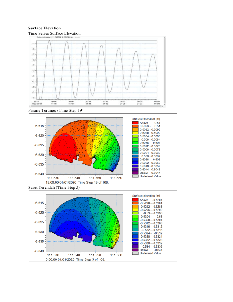 Surface Elevation Time Series Surface Elevation Pasang Tertingg (Time Step 19) Surut Terendah (Time Step 5) Signifikan Wave Height Time Series Dominan Tertinggi (Time Step 52) Pasang Tertinggi Surut Terendah Sand Transport Total Load X- Component Pasang Tertinggi Surut Terendah ` Gelombang Tertinggi Total Load Y- Component Pasang Tertinggi Gelombang Tertinggi Bed Level Surut Terendah Pasang Tertinggi Gelombang Tertinggi Surut Terendah Pemodelan dilakukan untuk 7 hari yang memiliki pasang tertinggi di Time Step ke 19 dan surut terendah di Time Step ke 5 serta dominan gelombang terbesar pada Time Step ke 52. Hasil Sand Transport terdapat pergerakan sand transport vertikal dan horizontal (Bed Load X/Y Components), dari hasil tersebut dikaitkan saat pasang tertinggi, surut terendah, dan dominan gelombang terbesar serta arah vektornya. Total Load di X Components yaitu secara horizontal terjadi di Timur hingga Tenggara perairan. Pergerakan Pasang ke arah Timur dan sebaliknya surut ke arah Barat, namun untuk Sand Transport dominan terjadi ke arah Selatan, daerah yang dekat dengan daratan. Hal tersebut terlihat saat gelombang tertinggi, serta vektor sebagai petunjuk pergerakan pun banyak pada garis-garis pantai yang menandakan ketidakstabilan sedimen pada daerah tersebut. Berdasarkan hasil yang diperoleh, yang paling mempengaruhi sand transport ialah gelombang besar, bukan pasang tertinggi dan surut terendah. Hal demikian berbeda dengan yang terjadi pada Total Load di Y Components (secara horizontal). Total Load Sand Transport dominan terjadi pada ujung Utara dan Selatan, dan sangat kecil terjadi saat Surut Terendah. Saat Surut Terendah permukaan air yang rendah memungkinkan sedimen sulit untuk tertransportkan, sedangkan saat pasang tertinggi sangat dimungkinkan karna elevasi muka air yang maksimum. Saat Pasang Tertinggi, sand transport secara vertikal terjadi pada ujung utara dan ujung selatan, dimungkinkan dekat dengan perairan lepas dimana kedalaman lebih dari 12 meter sand transport mejadi lebih mudah di transportkan, dan diarah Selatan yang dekat dengan garis pantai, hal ini dapat dimungkinkan karna bentuk garis pantai yang berkelok-kelok (Pelabuhan Tanjung Bonang) walaupun kedalamannya hanya berkisar 1 meter namun terjadi ketidakstabilan pada Pelabuhan tersebut. Sand Transport secara vertikal ini sangat terlihat saat gelombang perairan sedang terbesar (Time Step 52) dan hanya terjadi pada Ujung Selatan dan Utara, sedangkan di tengah daerah Boundary (daerah kajian) arah Timur dan Barat sangat kecil terjadi sand transport vertikal. Bed level sedimen ialah nilai dasar dari sedimen, namun pada pemodelan dan perairan dan umumnya terjadi tidak begitu signifikan dan perubahan terjadi sangat kecil atau bahkan tidak ada perubahan yang terjadi. Hal ini dimungkinkan saat pemodelan nilai yang dimasukan ialah Sand yang tidak mudah berubah dan memiliki kestabilan tidak seperti mud atau lebih halus daripada itu, Hal demikian sangat terlihat dihasil pemodelan saat Pasang Tertinggi, Surut Terendah, Dominan Gelombang Terbesar. Pergerakan vektor Bed Level dominan kearah garis pantai, dan vektor semakin banyak saat berada di garis pantai. Hal ini menunjukan perubahan bed level selalu menuju garis pantai, dimana garis pantai memiliki dinamika dan perubahan yang dominan.