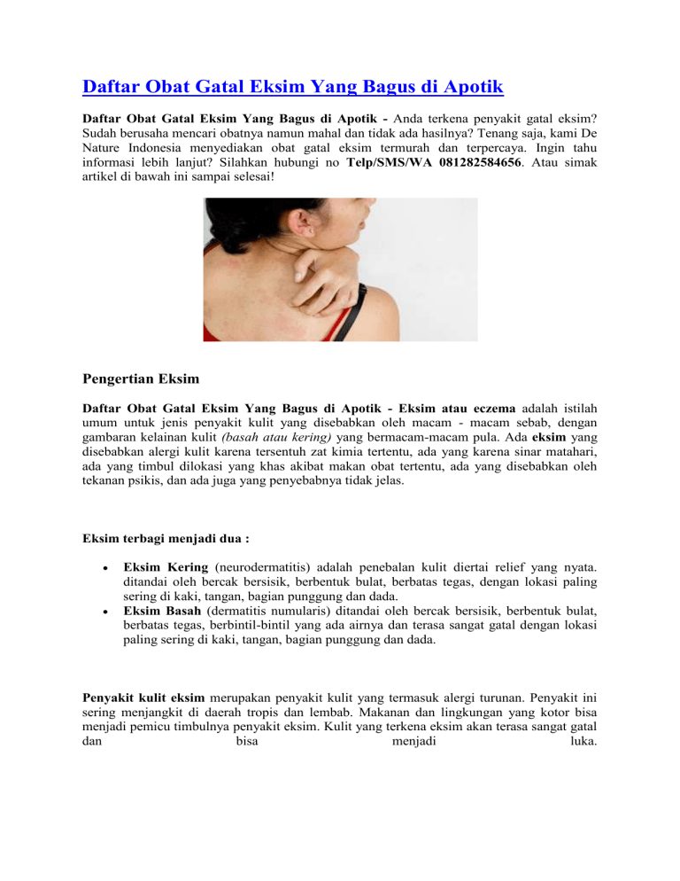 Daftar Obat Gatal Eksim Yang Bagus di Apotik Daftar Obat Gatal Eksim Yang Bagus di Apotik - Anda terkena penyakit gatal eksim? Sudah berusaha mencari obatnya namun mahal dan tidak ada hasilnya? Tenang saja, kami De Nature Indonesia menyediakan obat gatal eksim termurah dan terpercaya. Ingin tahu informasi lebih lanjut? Silahkan hubungi no Telp/SMS/WA 081282584656. Atau simak artikel di bawah ini sampai selesai! Pengertian Eksim Daftar Obat Gatal Eksim Yang Bagus di Apotik - Eksim atau eczema adalah istilah umum untuk jenis penyakit kulit yang disebabkan oleh macam - macam sebab, dengan gambaran kelainan kulit (basah atau kering) yang bermacam-macam pula. Ada eksim yang disebabkan alergi kulit karena tersentuh zat kimia tertentu, ada yang karena sinar matahari, ada yang timbul dilokasi yang khas akibat makan obat tertentu, ada yang disebabkan oleh tekanan psikis, dan ada juga yang penyebabnya tidak jelas. Eksim terbagi menjadi dua : Eksim Kering (neurodermatitis) adalah penebalan kulit diertai relief yang nyata. ditandai oleh bercak bersisik, berbentuk bulat, berbatas tegas, dengan lokasi paling sering di kaki, tangan, bagian punggung dan dada. Eksim Basah (dermatitis numularis) ditandai oleh bercak bersisik, berbentuk bulat, berbatas tegas, berbintil-bintil yang ada airnya dan terasa sangat gatal dengan lokasi paling sering di kaki, tangan, bagian punggung dan dada. Penyakit kulit eksim merupakan penyakit kulit yang termasuk alergi turunan. Penyakit ini sering menjangkit di daerah tropis dan lembab. Makanan dan lingkungan yang kotor bisa menjadi pemicu timbulnya penyakit eksim. Kulit yang terkena eksim akan terasa sangat gatal dan bisa menjadi luka. Biasanya eksim diawali dengan rasa gatal, panas, dan merah di bagian permukaan tubuh yang terserang. Kemudian timbul lepuh dikulit yang berwarna merah tadi. Sebagian atau seluruh lepuh dapat berisi nanah yang mudah pecah. Dalam keadaan ini eksim dikenal dengan eksim basah. Lama kelamaan lepuh mengering dan mengeropeng yang disebut eksim kering. Eksim kering dapat berubah lagi menjadi eksim basah jika lepuh bernanah timbul lagi. Harga Rp 295.000 Informasi lebih lanjut hubungi Telp/SMS/WA 081282584656 Apa Saja Gejala Eksim? Daftar Obat Gatal Eksim Yang Bagus di Apotik - Dimanapun lokasi timbulnya eksim, gejala utama yang dirasakan pasien adalah gatal. Terkadang rasa gatal sudah muncul sebelum ada tanda kemerahan pada kulit. Gejala kemerahan biasanya akan muncul pada wajah, lutut, tangan dan kaki, namun tidak menutup kemungkinan kemerahan muncul di daerah lain. Daerah yang terkena akan terasa sangat kering, menebal atau keropeng. Pada orang kulit putih, daerah ini pada mulanya akan berwarna merah muda lalu berubah menjadi cokelat. Sementara itu pada orang dengan kulit lebih gelap, eksim akan mempengaruhi pigmen kulit sehingga daerah eksim akan tampak lebih terang atau lebih gelap. Apa yang Menjadi Penyebab Eksim Daftar Obat Gatal Eksim Yang Bagus di Apotik - Penyebab dari eksim sebenarnya belum diketahui dengan pasti, namun beberapa ahli mencurigai eksim berhubungan dengan aktifitas daya pertahanan tubuh (imun) yang berlebihan. Hal ini menyebabkan tubuh mengalami reaksi berlebihan terhadap bakteri atau iritan yang sebenarnya tidak berbahaya pada kulit. Oleh karena itu, eksim banyak ditemukan pada keluarga dengan riwayat penyakit alergi atau asma. Tiap tiap orang mempunyai pencetus eksim yang berbeda beda. Ada orang yang setelah memegang sabun atau deterjen akan merasakan gatal yang luar biasa, ada pula yang disebabkan oleh bahan atau alat rumah tangga yang lain. Gejala yang timbul pun bervariasi, ada yang gatalnya ringan tetapi rasa panas yang dominan, ada pula yang sebaliknya. Infeksi saluran nafas bagian atas atau flu juga bisa menjadi pencetus timbulnya eksim. Stress yang dialami penderita akan membuat gejala menjadi lebih buruk. Jenis – Jenis Penyakit Gatal Eksim : 1. Dermatitis atopik : salah satu jenis eksim yang paling sering dijumpai dan merupakan penyakit turunan. Dermatitis atopik umumnya dimulai ketika bayi dan masih anakanak dengan gejala berupa gatal, radang kulit, dan pada sebagian penderita sering timbul asma dan demam hay (hay fever). 2. Dermatitis kontak : meliputi dermatitis kontak alergik dan iritan. Dermatitis kontak alergik disebabkan oleh reaksi kekebalan tertunda (delayed immune system) akibat kontak kulit dengan senyawa alergenik sehingga menyebabkan radang kulit dalam 48 jam setelah paparan terjadi. Beberapa agen penyebab eksim jenis ini adalah jelatang, parfum, pengawet kosmetik, metal, dan pewarna. 3. Dermatitis kontak iritan terjadi karena paparan senyawa iritan yang dapat merusak kulit secara kimiawi, contohnya sabun keras, detergen, dan produk pembersih lainnya. Senyawa iritan tersebut dapat menghilangkan minyak dan kelembaban dari lapisan luar kulit, kemudian merusak lapisan pelindung dan memicu terjadinya peradangan. 4. Eksim numular : beberapa plak eksim yang biasanya berhubungan dengan kulit kering dan terjadi pada bagian luar dari kaki, tangan, dan lengan. 5. Eksim stasis : jenis eksim kronis pada daerah bawah kaki bagian dalam yang berkaitan dengan varises. Pertanyaan yang sering terpikirkan di benak Anda : Jika Saya terlanjur kena penyakit eksim, bagaimana cara mengobatinya? Bagaimana cara mengobati penyakit eksim dengan cepat dan tuntas? Bagaimana berobat yang mudah tanpa perlu malu untuk ke dokter? Jawabannya: semua bisa, asal Anda memilih produk yang tepat, yaitu Eximtas, Kapsul BD De Nature dan Salep Exclear. Pengobatan Penyakit Eksim Daftar Obat Gatal Eksim Yang Bagus di Apotik - Pengobatan Eksim secara tradisional yaitu dengan menggunakan Obat Eksim dari De Nature. Produk yang terbuat dari bahan herbal alami diramu dengan resep tradisional dan diolah secara teknologi modern, sehingga aman di konsumsi. Jadi anda juga tak perlu khawatir karena Obat Herbal De Nature yang kami tawarkan ini, Alhamdulillah, merupakan obat yang telah banyak menyembuhkan penderitanya baik dari dalam maupun luar negeri. Sudah 