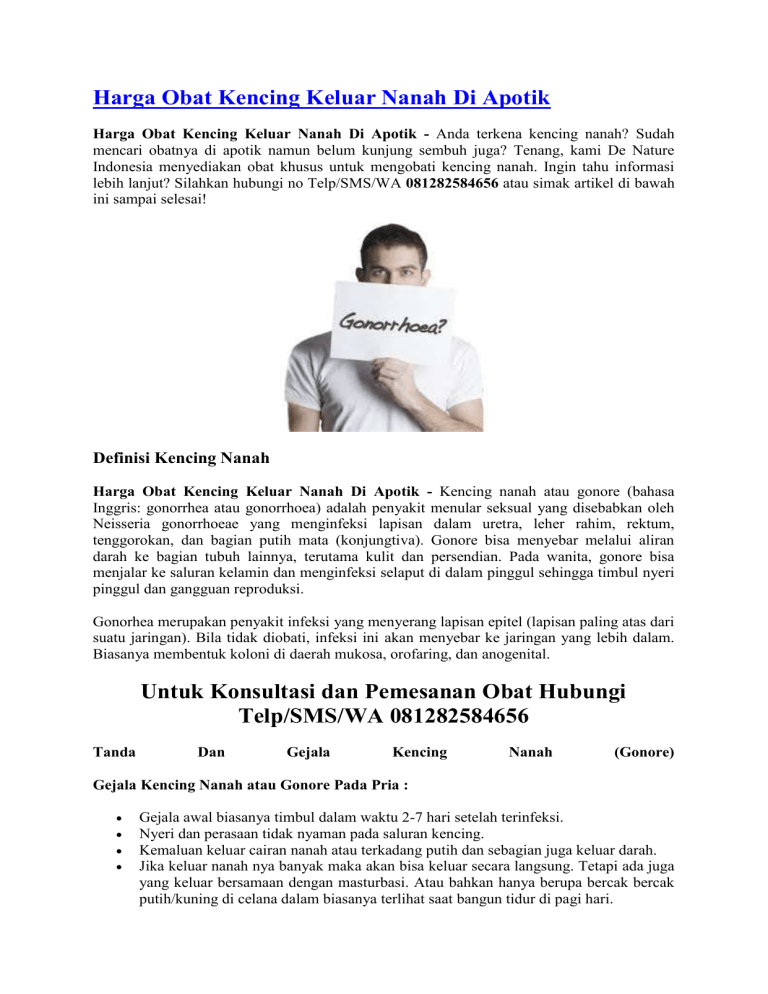 Harga Obat Kencing Keluar Nanah Di Apotik Harga Obat Kencing Keluar Nanah Di Apotik - Anda terkena kencing nanah? Sudah mencari obatnya di apotik namun belum kunjung sembuh juga? Tenang, kami De Nature Indonesia menyediakan obat khusus untuk mengobati kencing nanah. Ingin tahu informasi lebih lanjut? Silahkan hubungi no Telp/SMS/WA 081282584656 atau simak artikel di bawah ini sampai selesai! Definisi Kencing Nanah Harga Obat Kencing Keluar Nanah Di Apotik - Kencing nanah atau gonore (bahasa Inggris: gonorrhea atau gonorrhoea) adalah penyakit menular seksual yang disebabkan oleh Neisseria gonorrhoeae yang menginfeksi lapisan dalam uretra, leher rahim, rektum, tenggorokan, dan bagian putih mata (konjungtiva). Gonore bisa menyebar melalui aliran darah ke bagian tubuh lainnya, terutama kulit dan persendian. Pada wanita, gonore bisa menjalar ke saluran kelamin dan menginfeksi selaput di dalam pinggul sehingga timbul nyeri pinggul dan gangguan reproduksi. Gonorhea merupakan penyakit infeksi yang menyerang lapisan epitel (lapisan paling atas dari suatu jaringan). Bila tidak diobati, infeksi ini akan menyebar ke jaringan yang lebih dalam. Biasanya membentuk koloni di daerah mukosa, orofaring, dan anogenital. Untuk Konsultasi dan Pemesanan Obat Hubungi Telp/SMS/WA 081282584656 Tanda Dan Gejala Kencing Nanah (Gonore) Gejala Kencing Nanah atau Gonore Pada Pria : Gejala awal biasanya timbul dalam waktu 2-7 hari setelah terinfeksi. Nyeri dan perasaan tidak nyaman pada saluran kencing. Kemaluan keluar cairan nanah atau terkadang putih dan sebagian juga keluar darah. Jika keluar nanah nya banyak maka akan bisa keluar secara langsung. Tetapi ada juga yang keluar bersamaan dengan masturbasi. Atau bahkan hanya berupa bercak bercak putih/kuning di celana dalam biasanya terlihat saat bangun tidur di pagi hari. Sering buang air Kencing dan terasa terbakar atau sakit dan perih, walau sebagian orang tidak merasakan tanda- tanda ini. Ada juga yang merasakan anusnya gatal, pedih dan juga berdarah. Cairan putih bercampur nanah keluar dari penis. Terdapat bengkak dan merah pada penis. Penis Sakit Panas Nyeri Dan Keluar Cairan Putih. Bisa juga sakit di tenggorokan dan mata merah atau sakit mata. Gejala Kencing Nanah atau Gonore Pada Wanita : Kemungkinan besar yang terjadi pada wanita apabila terserang penyakit kencing nanah adalah tidak terlihat adanya tanda-tanda yang jelas atau spesifik. Akan tetapi biasanya ditemukan adanya Keputihan Abnormal yang berbeda dengan keputihan normal . Untuk keputihan Abnormal / keputihan yang disebabkan oleh. Bakteri kencing nanah sendiri bercirikan warna putih kehijauan, keluarnya banyak. Baunya amis dan busuk serta terkadang gatal dan kemerahan di area kelamin. Gejala lain : Pada wanita, gejala awal bisa timbul dalam waktu 7-21 hari setelah terinfeksi. 80 % tidak menimbulkan gejala. Keluar cairan putih keruh kekuningan (Vaginal discharge). Nyeri abdomen Kronis. Nyeri saat kencing (disuria). Sakit tenggorokan jika terjadi infeksi pada tenggorokan disebabkan karena oral seks.. Gatal gatal pada anus disertai keluar nanah jika terjadi infeksi pada daerah anus karena hubungan seks melalui anus. Pelvic Inflammatory Diseases (PID) = penyakit radang panggul Penyebab Kencing Nanah Seseorang akan lebih berisiko mengalami penyakit ini jika: Melakukan hubungan seks yang tidak aman, misalnya tanpa kondom Melakukan hubungan seks dengan seseorang yang sudah sering berganti-ganti pasangan Gonta-ganti pasangan seks Pernah kena gonore sebelumnya Pernah mengalami penyakit kelamin lain sebelumnya Bagaimana cara mencegah Penyakit Kencing nanah? Untuk mengurangi risiko infeksi kencing nanah bisa dilakukan dengan berbagai cara, antara lain : Gunakan kondom dengan benar setiap kali Anda berhubungan seks. Setia terhadap pasangan, jangan berganti-ganti partner seks. Membatasi kontak seksual hanya dengan satu pasangan yang benar-benar steril. Pertanyaan yang sering terpikirkan di benak Anda : Jika Saya terlanjur kena gonore bagaimana cara mengobatinya? Bagaimana cara mengobati kencing nanah dengan cepat dan tuntas? Bagaimana berobat yang mudah tanpa perlu malu untuk ke dokter? Jawabannya: semua bisa, asal Anda memilih produk yang tepat, yaitu Gang Jie Gho Siah De Nature. Harga Rp. 295.000 Pemesanan obat hubungi tlp/sms/whatsapp : 081282584656 Manfaat Obat Kencing Nanah De Nature Banyak sekali khasiat yang didapat dari obat ini untuk mengobati sipilis kencing nanah gonore, antara lain : Gang Jie dan Gho Siah terdapat kandungan alami antibiotik dan antiviral, yang bermanfaat membasmi secara cepat dan tuntas bakteri Neisseria gonorrhoeae tanpa efek samping yang membahayakan tubuh. Produk yang mujarab karena berbahan dasar dengan kualitas tinggi yang kami kembangkan sendiri sehingga terjaga kualitasnya. Gang Jie dan Gho Siah sangat berguna untuk imunitas, hal ini sangat penting pagi penderita penyakit kelamin, sehingga proses penyembuhan menjadi lebih cepat dan juga untuk menjaga keseimbangan kesehatan tubuh Anda secara alami. Sekedar informasi untuk kenyamanan Konsumen, bahwa Produk dari perusahaan kami ini sudah memiliki: Ijin Resmi Perusahaan dari Kementerian Kesehatan Ijin BPOM, yang artinya sudah lulus uji stabilitas Produk Sertifikat Halal MUI, sehingga halal bisa dipertanggungjawabkan Apoteker yang sudah berpengalaman Sudah melewati Proses Sortir Bahan Baku, Guna Menjaga Mutu Produk Proses Produksi Sesuai Alur CPOTB (Cara Pembuatan Obat Tradisional Yang Baik Dan Benar) Cara Pemesanan Pembayaran terlebih dulu via transfer Bank, setelah transfer SMS-kan konfirmasinya untuk proses pengiriman. Format Pemesanan: Nama, Alamat Lengkap beserta kode Pos, Nama Bank / Rekening anda, Nominal transfer, Nama Obat yg dipesan, No.Hp Anda Agar pesanan Anda bisa segera diproses, segera konfirmasikan pembayaran Anda via Telp/SMS/WA ke 081282584656 Setelah itu barang kami kirim melalui TIKI / JNE / J&T / POS. CONTOH SMS KONFIRMASI: Ahmad Husein, Jl.Raya Perumas Cendana Asri No.95, Kecamatan Majenang, Kabupaten Cilacap, Prov